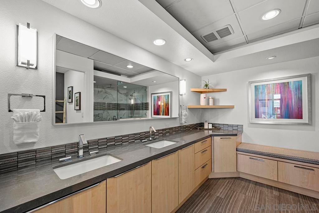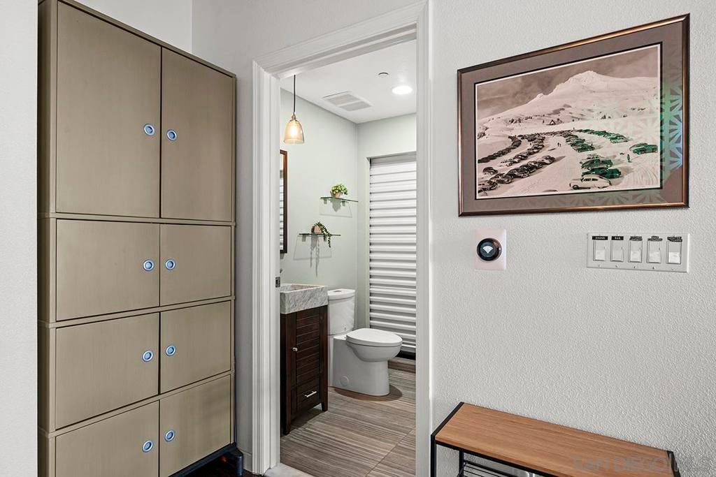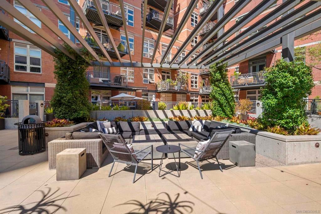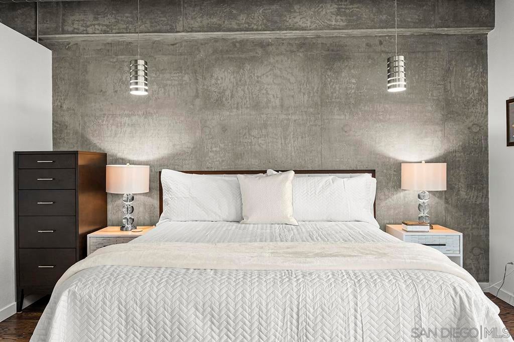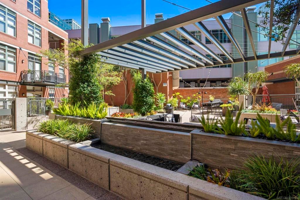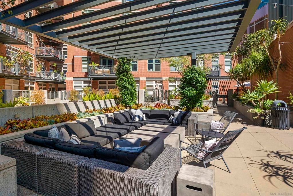 Stunning views of Petco Park grace every window in this chic one-bedroom, one-and-a-half-bathroom condo. It also benefits from 14ft vaulted ceilings that infuse the space with an open, airy vibe. Rental rate is for a minimum 6-month lease. Entertaining is easy here, and not just because of the in-unit viewpoint of Padres games, concerts and events, this space boasts a dining table with seating for six next to a built-in dry bar fully stocked with all the necessary tools and glassware, complete with a wine fridge. Alternate seating at the kitchen counter, and an oversized sofa in the living room in front of a sizeable Smart TV, add to the entertainment appeal in the stylish space. The plush L-shape sofa also doubles as a queen-size sleeper sofa, ideal for overnight guests who will also appreciate the nearby powder bathroom. The expansive bedroom suite features frosted sliding panels that can be positioned for complete privacy or left open to turn the condo into one large, open concept space. Within, the suite boasts a luxurious king-size bed, Smart TV, walk-in closet with abundant storage space, and a roomy bathroom with a dual sink vanity and an ultra-spacious walk-in shower. Those looking to work from home will love the office nook equipped with a large desk housing two computer monitors and benefiting from ample natural light from nearby floor-to-ceiling French doors. This condo is located within the Park Loft building in the heart of East Village. Park Loft is located across from Petco Park, home of Major Legue Baseball’s San Diego Padres, and host to everything from baseball games to concerts to special events. This locale puts it in close proximity to a multitude of tasty spots to grab a bite and brew, and shopping opportunities galore. The nearby Harbor Drive Pedestrian Bridge also provides easy access to the San Diego Convention Center, Seaport Village, The Embarcadero, and all that they have to offer. Amenities in this building include secure underground parking, contemporary lobby with concierge, and 24-hour security with surveillance cameras. It also offers an updated fitness center, lush central courtyard with abundant greenery throughout featuring multiple seating areas, fire pits, community grilling stations and a chic clubhouse with a full kitchen, large Smart TV and abundant seating.