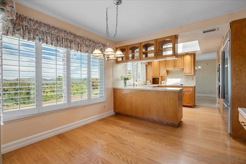 Nestled in prestigious Valle Verde Country Club Estates of Poway, this exceptional single-story residence offers the perfect blend of space, comfort, and scenic beauty. With 2,550 square feet, the home features 5 bedrooms, 2.5 bathrooms, and a spacious 3-car garage, all thoughtfully designed within a flowing and functional floor plan. From the moment you enter, the beautiful travertine flooring and abundant natural light create a warm and inviting atmosphere. Custom shutters, along with dual-paned tinted windows featuring retractable self-storing screens, enhance both the comfort and energy efficiency of the home. The living room connects to the formal dining room, providing an ideal setting for dinners and larger gatherings. At the heart of the home, the kitchen features a built-in refrigerator and opens to a bright breakfast area and a large family room complete with vaulted ceilings, custom built-in cabinetry and a bar area—perfect for entertaining and everyday living. Designed with privacy in mind, the primary suite is tucked away on its own side of the home, offering a peaceful retreat, while four additional bedrooms and a full bath are located on the opposite side—ideal for family, guests, or home office flexibility. Multiple living areas capture beautiful neighborhood views and western-facing vistas, with sightlines from the dining room, kitchen, breakfast area, and family room. Step outside to the backyard where a patio invites outdoor dining, entertaining, and relaxation while enjoying spectacular sunset views over Poway and Rancho Bernardo. The location in Poway Unified School District offers an incredible lifestyle with easy access to some of Poway’s most beloved destinations. Close to Valle Verde Park with sports fields, playground and picnic areas. Nearby, Blue Sky Ecological Reserve spans over 700 acres of preserved natural beauty with scenic hiking trails, while Lake Poway offers fishing, paddle boat rentals, playgrounds, picnic areas, BBQs, and more than 55 miles of surrounding trails. Cultural and community attractions including the Poway Performing Arts Center and charming Old Poway Park are just minutes away. Combining scenic views, generous living space, and an unbeatable Poway location, this remarkable home offers a rare opportunity to enjoy the best of North County living.