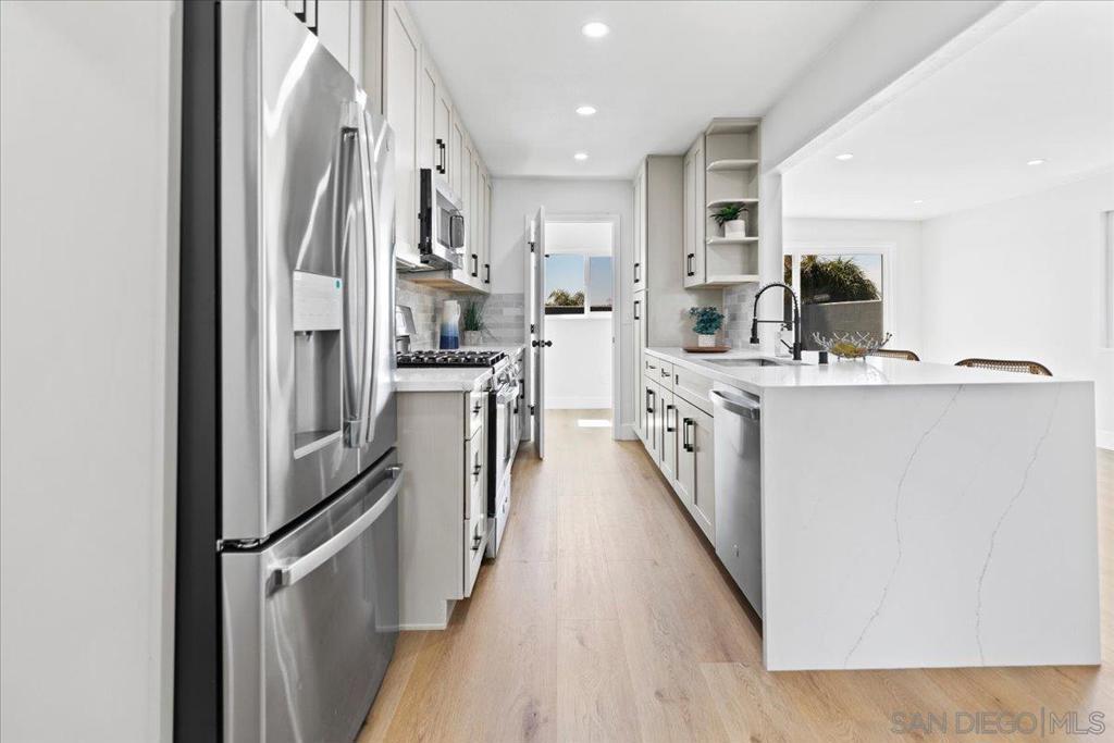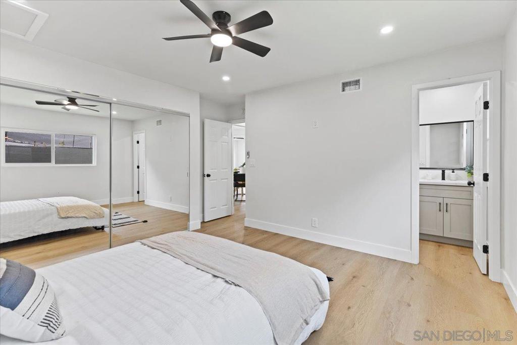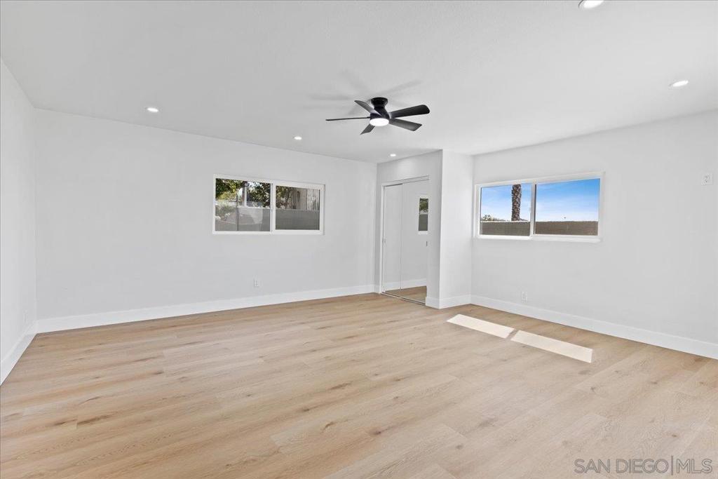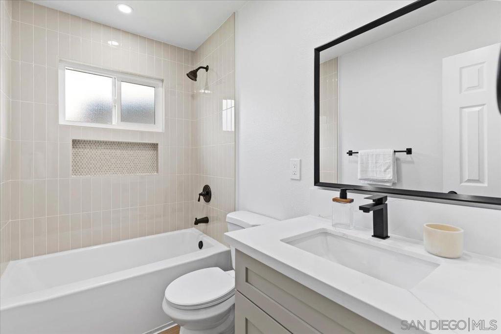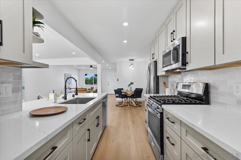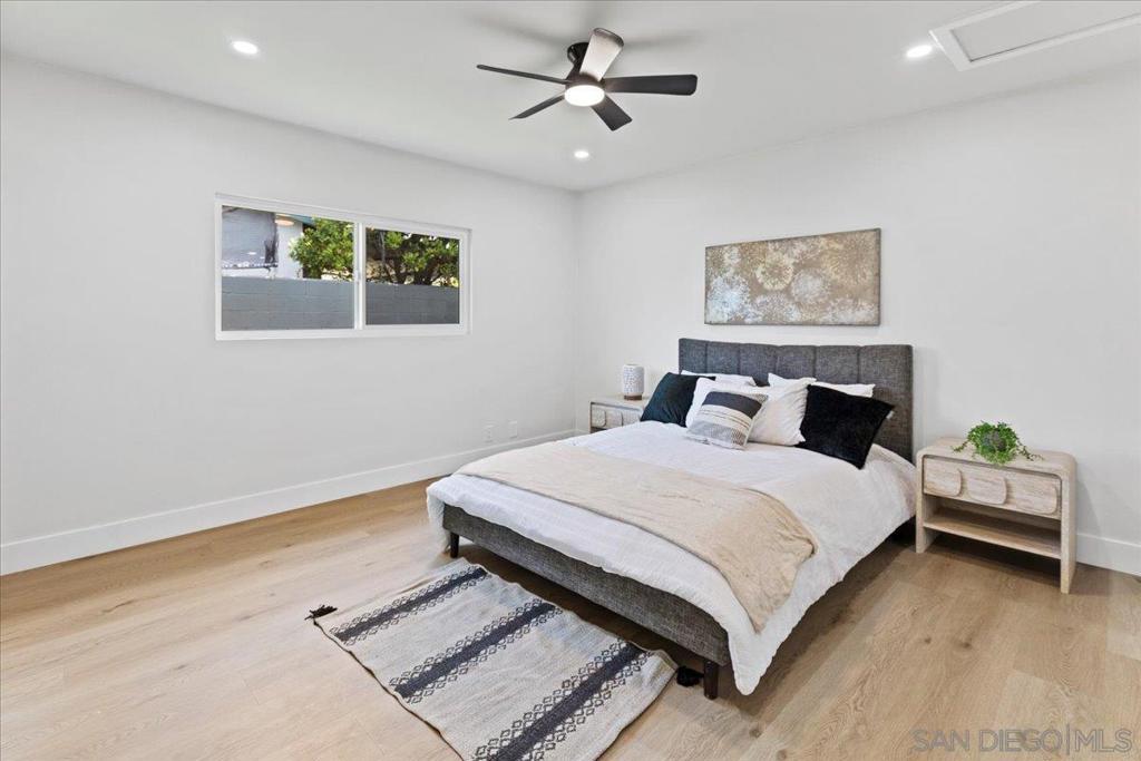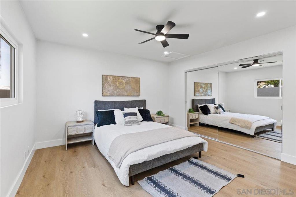 This beautifully reimagined single-level residence offers approximately 1,744 square feet of thoughtfully designed living space, featuring 3 bedrooms, 2 bathrooms, and an attached two-car garage, all set on a generous 5,800 square foot lot. Recently remodeled with a refined designer aesthetic, the home showcases a stunning chef-inspired kitchen with custom cabinetry, quartz countertops, a dramatic waterfall island, and an elegant tile backsplash. The beautifully upgraded bathrooms feature designer tile surrounds and sleek glass enclosures, while additional highlights include luxury vinyl plank flooring, recessed lighting, dual-pane windows, ceiling fans, mirrored wardrobe doors, and a bright, open-concept floor plan designed for modern living and effortless entertaining. Extensively upgraded inside and out, the home reflects a comprehensive renovation focused on quality, efficiency, and lasting appeal. Exterior improvements include a new roof with updated sheathing and fascia, fresh paint, new windows and sliders, low-maintenance synthetic turf, and a new garage door with motor. Inside, thoughtful upgrades include new plumbing throughout, a brand-new relocated water heater, updated electrical with a new 125-amp panel, recessed lighting, and modern fixtures. Comfort is enhanced with a new furnace, improved ducting, and upgraded insulation in both the attic and garage. Additional enhancements include new interior texture and paint, upgraded flooring with underlayment, new baseboards, doors, and hardware, along with fully remodeled kitchen and baths. Ideally situated near shopping, dining, neighborhood parks, and with convenient access to the 5, 805, and 905 freeways, this home offers a seamless blend of elevated style, comfort, and everyday living!