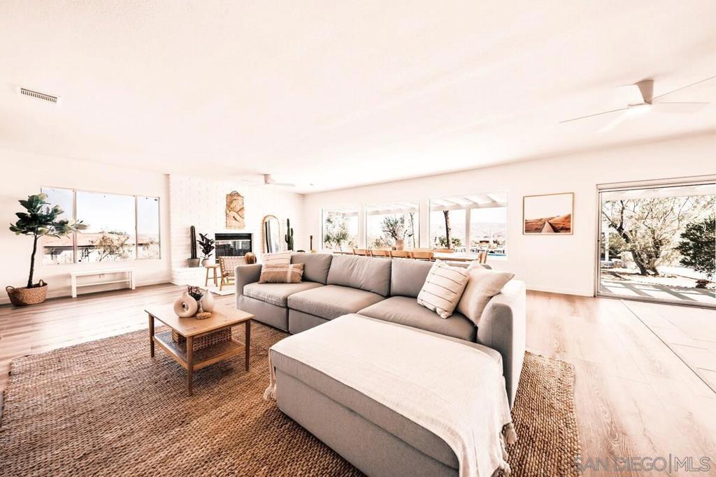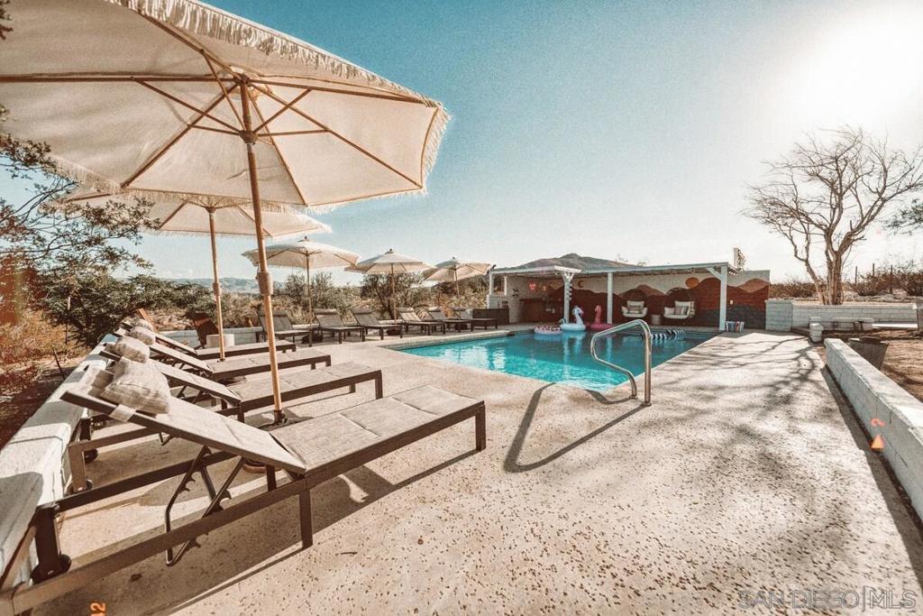 Fully remodeled 3BD/2BA + bonus room on 5 private acres with expansive desert and mountain views. Flexible for personal use, second home, or short-term rental. Renovated in 2022 with new roof, updated electrical, luxury vinyl plank flooring, fresh interior/exterior paint, upgraded appliances, new water heater, pool heater, and wireless pool controls. Open-concept living, dining, and kitchen. Spacious primary suite with dual vanities and private patio access. Outdoor features include heated pool, spa, fire pit, bocce ball court, and covered patio—ideal for enjoying Joshua Tree’s natural setting. Versatile Quonset structure perfect for studio, wellness, or creative use. Attached garage with EV charger. Offered fully furnished ($50K+ in furnishings included). Move-in ready. Previously operated as a short-term rental, with the current owner utilizing the property to help offset W-2 income through short-term rental use (buyer to verify with CPA).