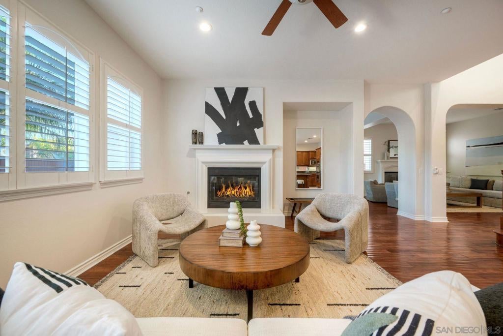 Beautifully maintained 4BD/3.5BA, 3,732 sq ft home on a cul-de-sac street in the gated community of Bernardo Point. One of just 8 custom homes in the neighborhood! Features incl a spacious 1st bdrm w/en-suite bath, versatile bonus room, loft & solar. Primary suite offers a large walk-in closet & a separate sitting area. Freshly painted interior w/recessed LED lighting & new fixtures throughout most of home. Enjoy an entertainer’s backyard w/pool & spa; pool heater & pump replaced in '24. No Mello-Roos & low HOA. Welcome to this wonderfully appointed, turn-key home! The main level features a highly desirable ensuite bedroom, ideal for guests or multigenerational living, along with a convenient powder room. At the heart of the home is a spacious chef’s kitchen, complete with a large center island, abundant storage, and seamless flow into the inviting family room. Formal living and dining areas, plus a versatile bonus room, provide plenty of space for both everyday living and entertaining. Upstairs, a spacious loft provides flexible living space and includes access to a private balcony to take in sunset views. The expansive primary suite offers a true retreat, featuring a private sitting area with a cozy fireplace, a balcony with stunning mountain views, and a spa-inspired bathroom. Two additional bedrooms share a well-designed Jack-and-Jill bath, each with its own private sink. Additional highlights include leased solar, fresh interior paint, and a 3-car garage with new epoxy flooring in the 2-car portion. Best of all, there are no Mello-Roos fees. Bernardo Point is located close to freeways, schools, shopping & restaurants!