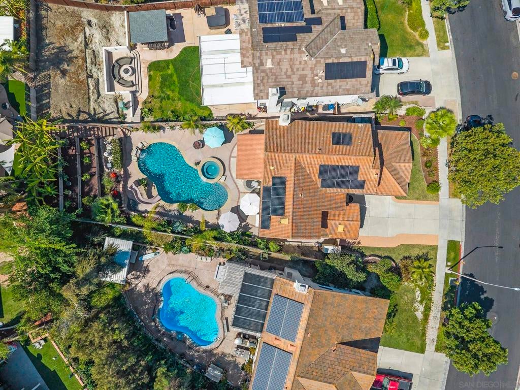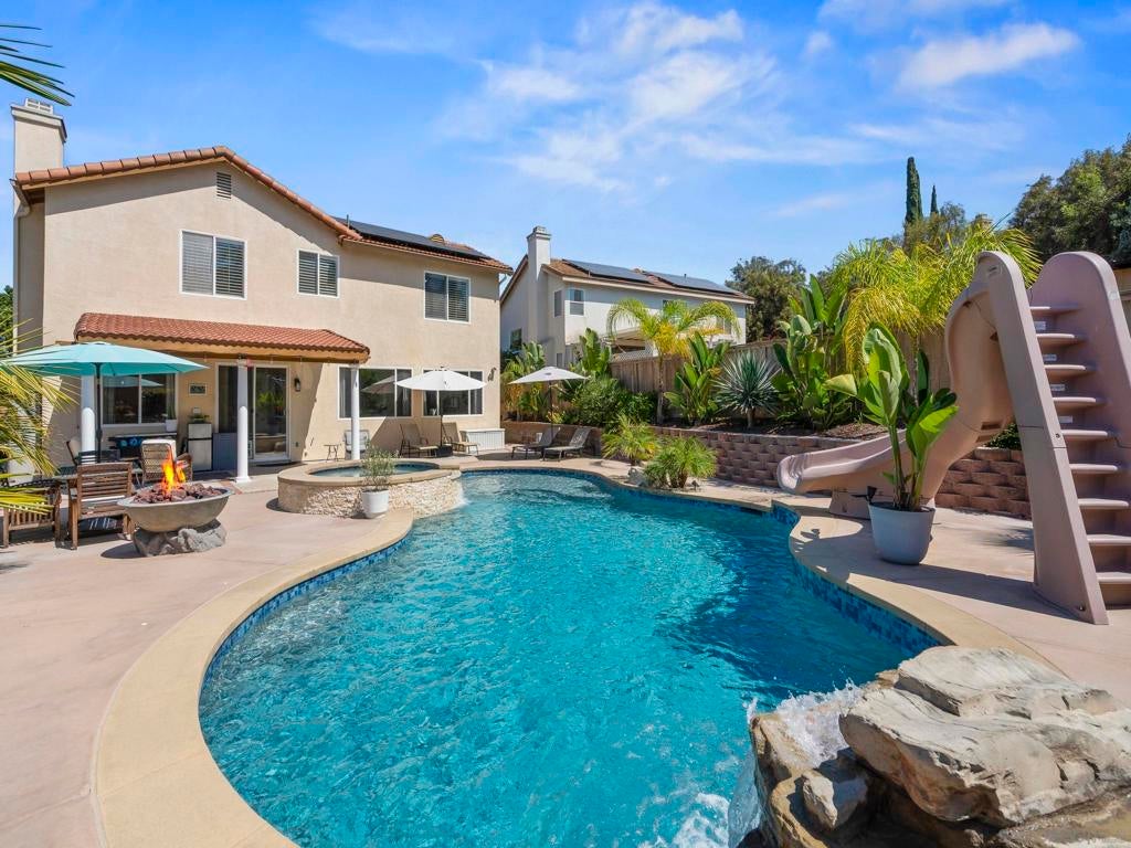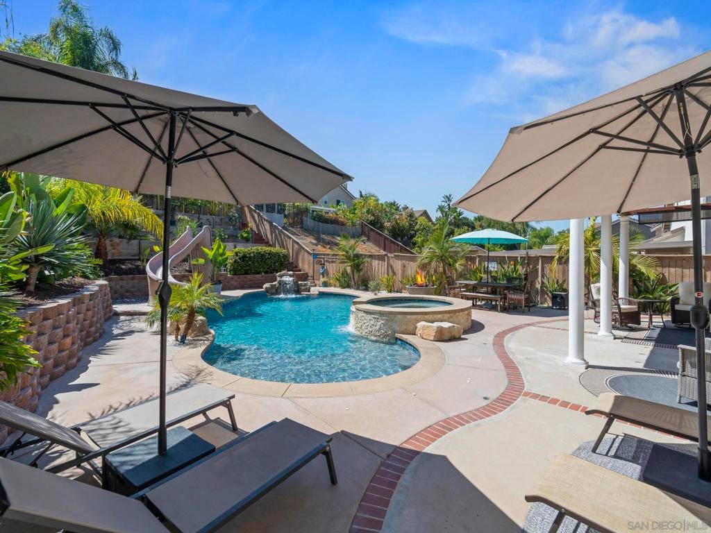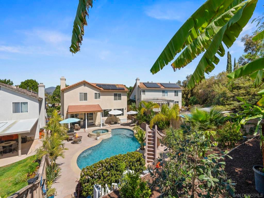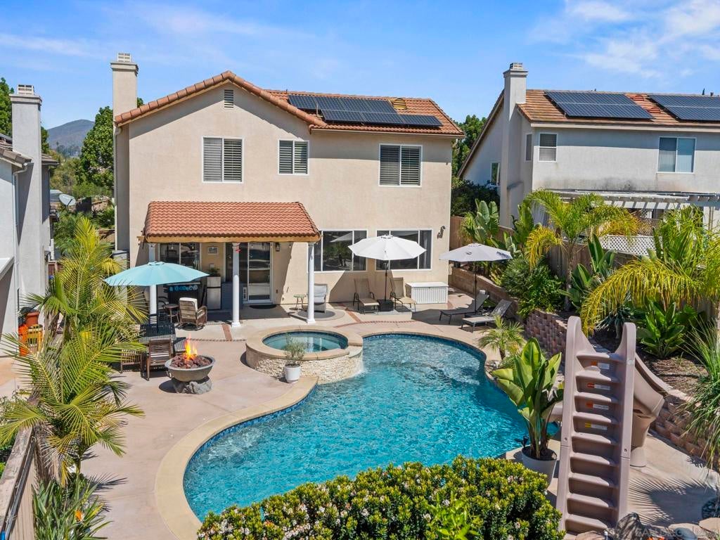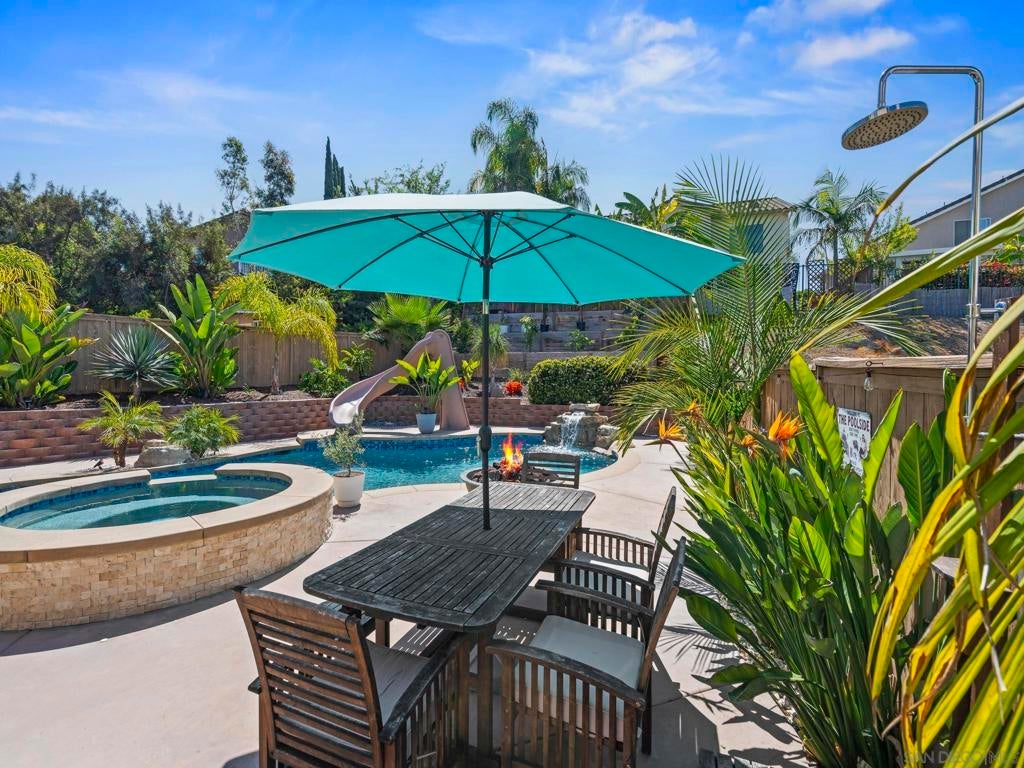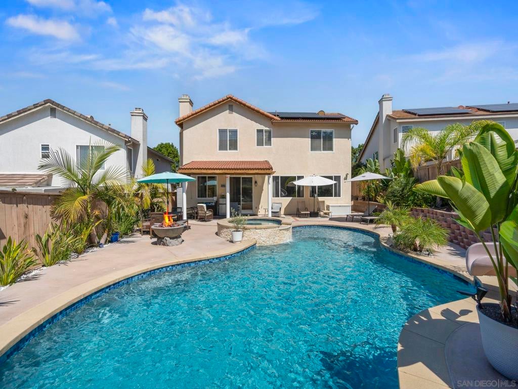 ONE-OF-A-KIND! You don't want to miss this opportunity, resort-style living awaits in this beautifully upgraded home featuring a private tropical backyard oasis. Designed for both relaxation and entertaining complete with a sparkling heated private pool with slide, spa with waterfall, multiple seating areas, a covered patio, fire feature, outdoor shower, and custom terrace areas with oranges, lemons, mango, banana, guava, passion & dragon fruit trees! The house welcomes you with timeless updates throughout including luxury vinyl plank flooring, recessed lighting & ceiling fans, 5 bedrooms + office area, 3 bathrooms, over 2,300 esf., separate laundry room where washer and dryer convey, one bedroom with shower/bathroom access downstairs, formal living room with backyard tropical views, formal family room open to dining area and highly upgraded kitchen, all appliances convey including refrigerator, oversized 2 car garage with custom storage built-ins, paid for solar (5.76kw), 4+ driveway parking spaces - enough room for RV or Boat, walk-in closets, primary suite with separate shower, tub and toilet areas, high ceilings and an open floor plan filled with tons of natural light! The house is located in the pristine neighborhood of Otay Ranch, Village 5 with extremely low HOA dues of only $138.98/month. Offering a resident only community recreation center, pool/spa in addition to a community park with playground, basketball courts, and designated trails for potential walking, jogging and biking. The well rated school districts include Chula Vista Elementary and Sweetwater Union. ONE-OF-A-KIND! You don't want to miss this opportunity, resort-style living awaits in this beautifully upgraded home featuring a private tropical backyard oasis. Designed for both relaxation and entertaining complete with a sparkling heated private pool with slide, spa with waterfall, multiple seating areas, a covered patio, fire feature and custom terrace areas full of lush landscaping! The house welcomes you with timeless updates throughout including luxury vinyl plank flooring, recessed lighting and ceiling fans, custom built -ins, 5 bedrooms + office area, 3 bathrooms, over 2,300 esf., separate laundry room where washer and dryer convey, one bedroom with shower/bathroom access downstairs, formal living room with backyard tropical views, formal family room open to dining area and highly upgraded kitchen, all appliances convey including refrigerator, oversized 2 car garage with custom storage built-ins, paid for solar (5.76kw), 4+ driveway parking spaces - enough room for RV or Boat, walk-in closets, primary suite with separate shower, tub and toilet areas, high ceilings and an open floor plan filled with tons of natural light! The house is located in the pristine neighborhood of Otay Ranch, Village 5 with extremely low HOA dues of only $138.98/month. Offering a resident only community recreation center, pool/spa in addition to a community park with playground, basketball courts, and designated trails for potential walking, jogging and biking. The well rated school districts include Chula Vista Elementary and Sweetwater Union.