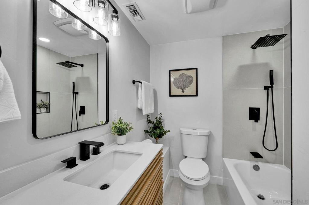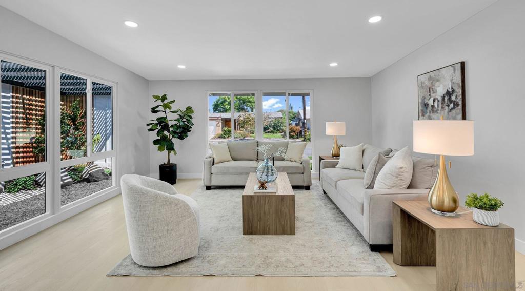 Step into this beautifully remodeled 4-bedroom, 2-bath mid-century modern home, thoughtfully updated from top to bottom. With approximately 1,500 square feet of open, light-filled living space, this home showcases vaulted ceilings and dramatic floor-to-ceiling windows overlooking a serene Japanese-inspired garden courtyard. The gourmet kitchen is a true centerpiece, featuring a large quartz island with seating for four, soft-close cabinetry, and a full suite of stainless steel appliances. Both bathrooms have been elegantly redesigned with modern vanities, expert tilework, and a combination of shower and soaking tub for ultimate comfort. Enjoy seamless indoor-outdoor living with a spacious, private backyard—complete with a covered patio, cozy firepit, and plenty of lawn space for play or relaxation. Perfectly situated in a desirable pocket of Serra Mesa, you’ll love the easy access to Mission Valley, Convoy, and major freeways. Homes of this caliber don’t come along often—come see it today before it’s gone!