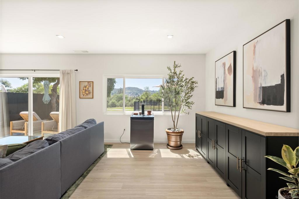 Stunning fully renovated single-story Carlton Oaks pool home, set on one of Santee’s most coveted streets backing up to the golf course. This beautifully upgraded residence has a resort style backyard that showcases breathtaking golf course and sunset views, complemented by a fully refinished heated pool perfect for seamless indoor-outdoor living. Thoughtfully remodeled with major system upgrades, including electrical, HVAC, and roof, the home has been impeccably maintained and reflects true pride of ownership. The bright, open floor plan is filled with natural light and enhanced by luxury vinyl flooring, quartz countertops in the kitchen, upgraded baseboards, and double-pane windows throughout. The open concept kitchen flows effortlessly into the main living space ideal for entertaining while capturing expansive mountain and fairway views of Carlton Oaks Golf Course. Ideally located near the 52 and 125 freeways, Santee Lakes, Mast Park, Mission Trails Regional Park, Santee Trolley Square, and highly rated schools, this exceptional home offers elevated living in one of East County’s most desirable neighborhoods. Schedule your private tour today!