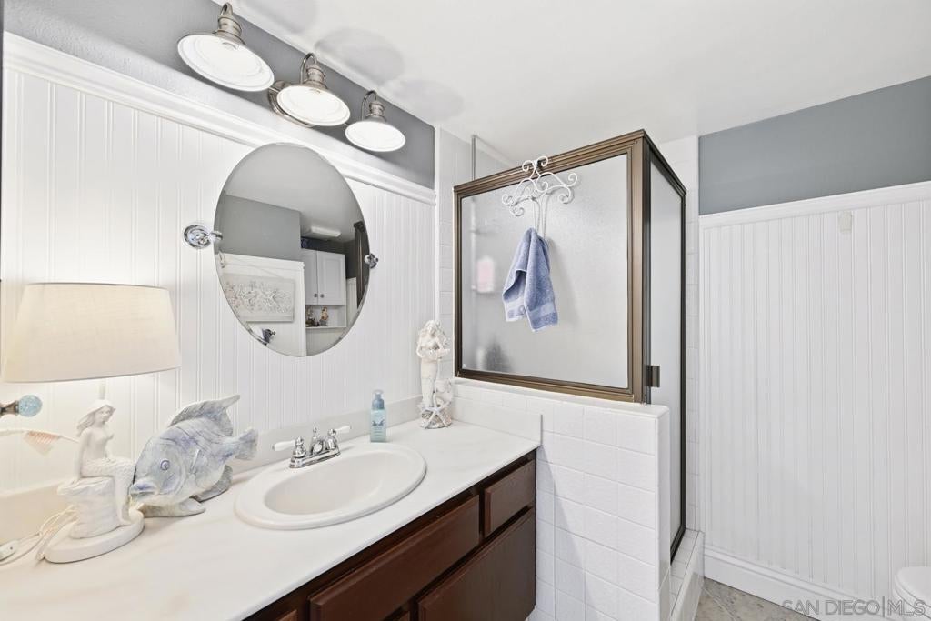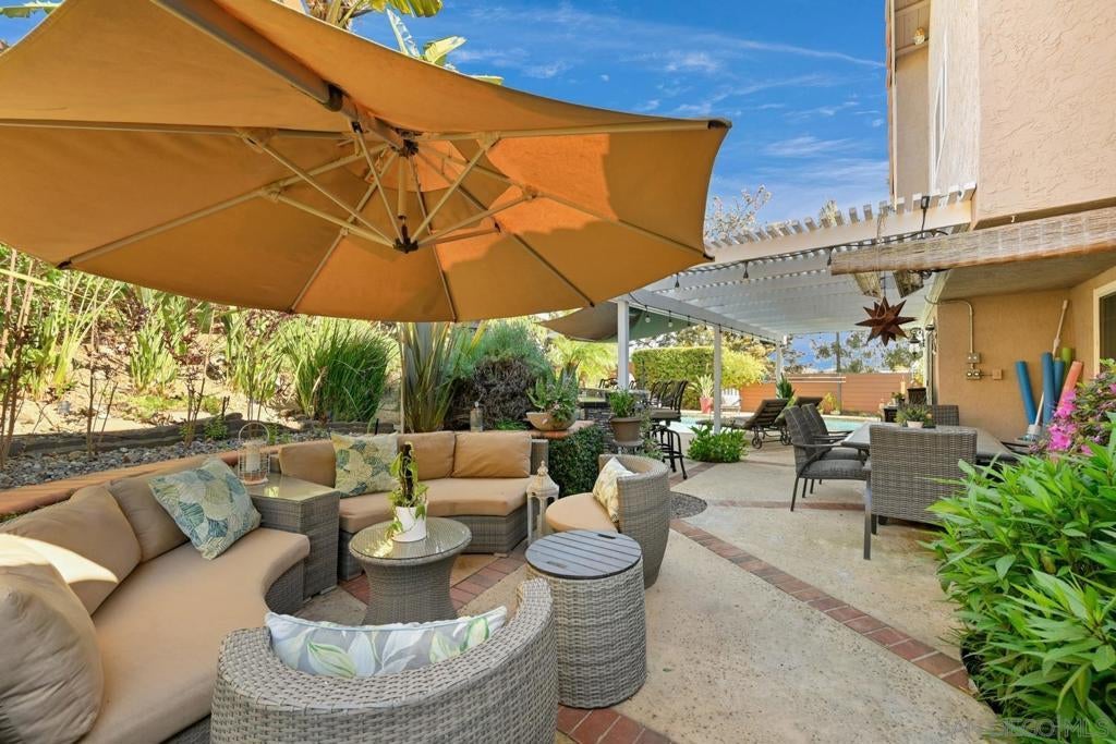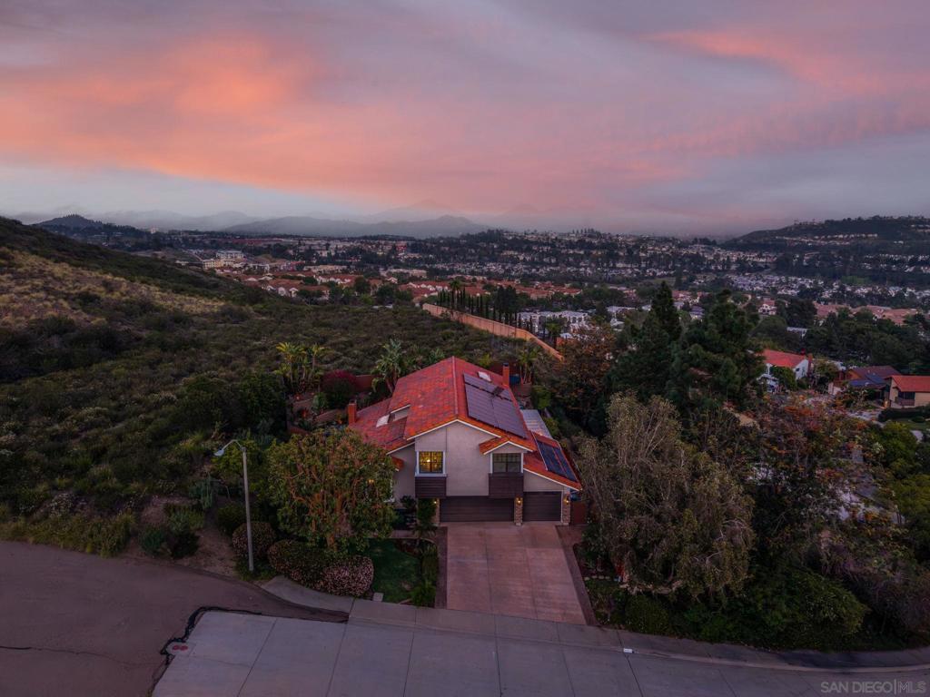 Entertainer’s Dream with Resort-Style Backyard, Ultimate PRIVACY, in Prime Location! Private oasis nestled against the serene Black Mountain Reserve. This bright, open-concept home features vaulted ceilings, 4 bedrooms, 3 full baths (1 bedroom and bath located on the 1st level), and an oversized bonus room—ideal for a home office, gym, or media space. Enjoy true indoor-outdoor living in the stunning backyard, complete with a sparkling pool, spa, waterfall, custom BBQ island with premium Delta Heat appliances, bar seating, customizable uplighting throughout, mature, tropical palm trees, bird-of-paradise, and other plants – the perfect setting for hosting or relaxing. The spacious 3-car garage offers abundant storage with built-in cabinetry, overhead racks, and a workbench. Retreat to the tranquil, island-inspired primary suite, featuring a distinctive bamboo ceiling detail, Brazilian Tigerwood flooring and a custom walk-in shower with rain shower. The updated kitchen includes new stainless steel appliances and a custom bar with a wine fridge. Located in the highly sought-after PUSD school district, minutes from Carmel Ranch Shopping Center, dining, and convenient access to I-15 and Hwy 56. No HOA or Melo Roos! Owned solar! Recent double-paned windows throughout. Dual-zone climate control. Fully-paid solar, NEM-I, zero/almost zero electric bill. All pool/spa functions controlled by app (filter on/off, pool/spa temperature, bubbles, lights, waterfall). Sprinkler system controlled by app. Outdoor electric heaters. Barbeque island has Delta Heat grill, 2-burners, refrigerator, garbage bin, paper towel compartment, storage). High-end outdoor speakers. Storage shed.