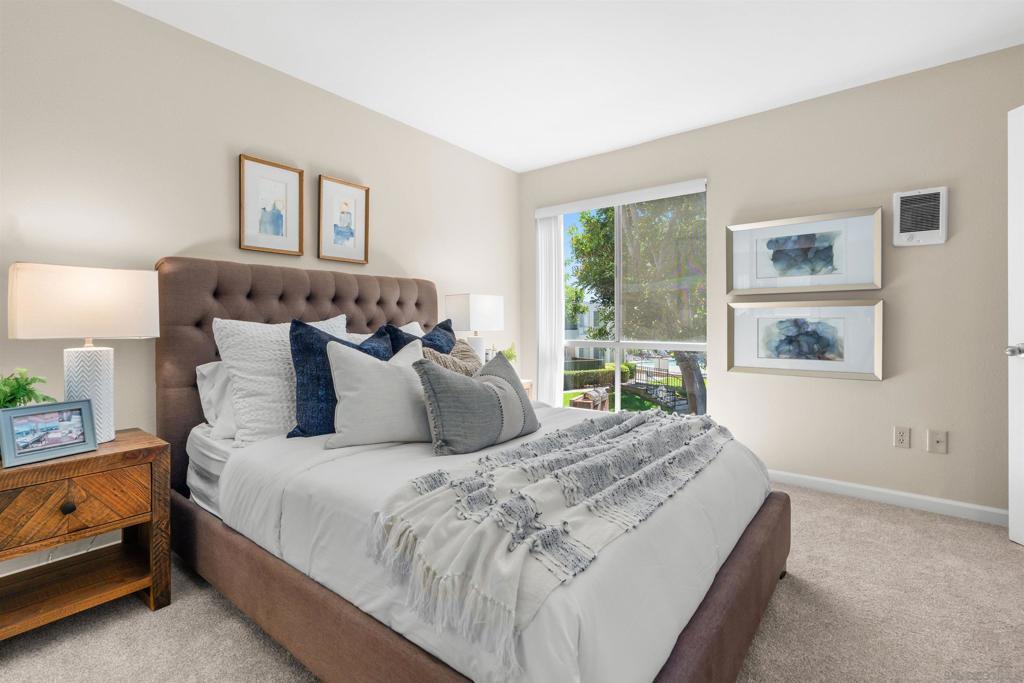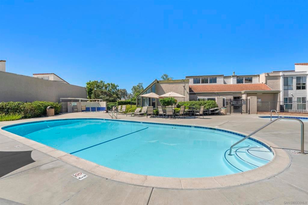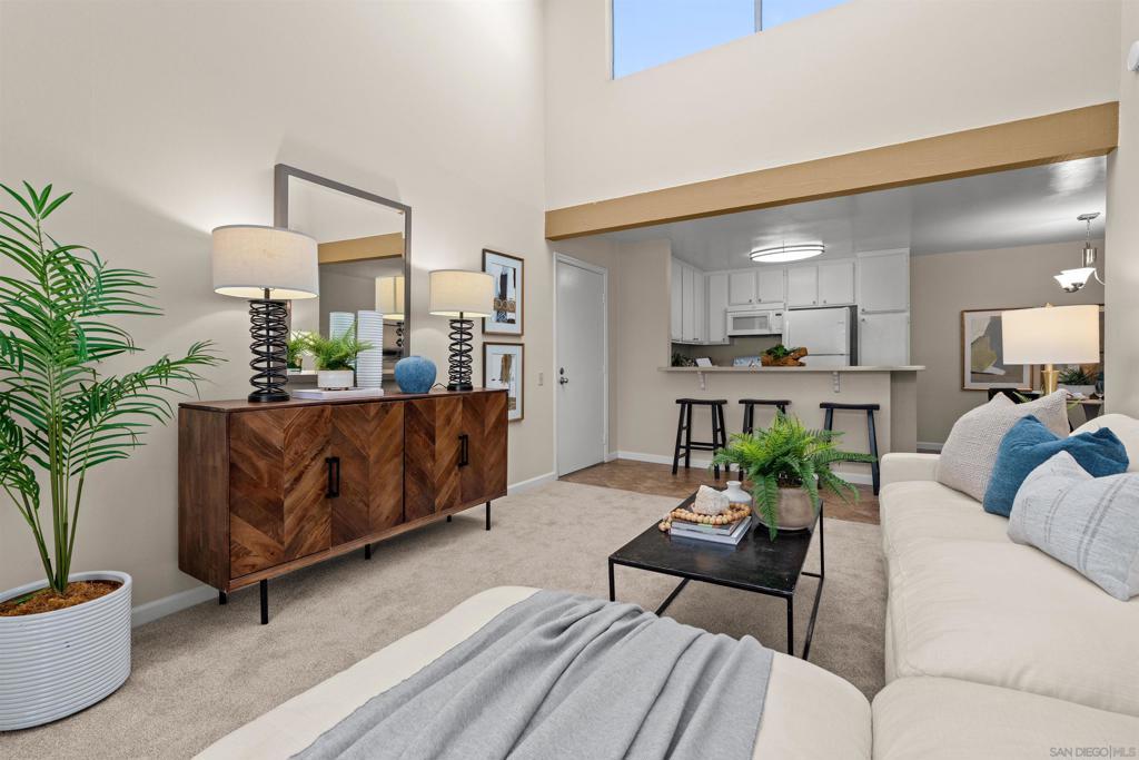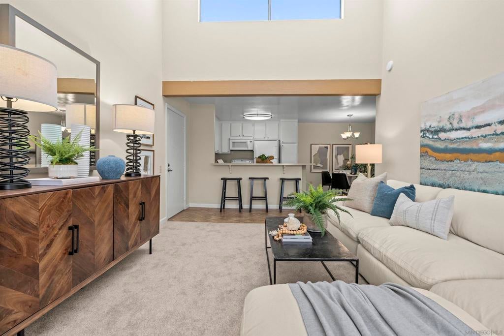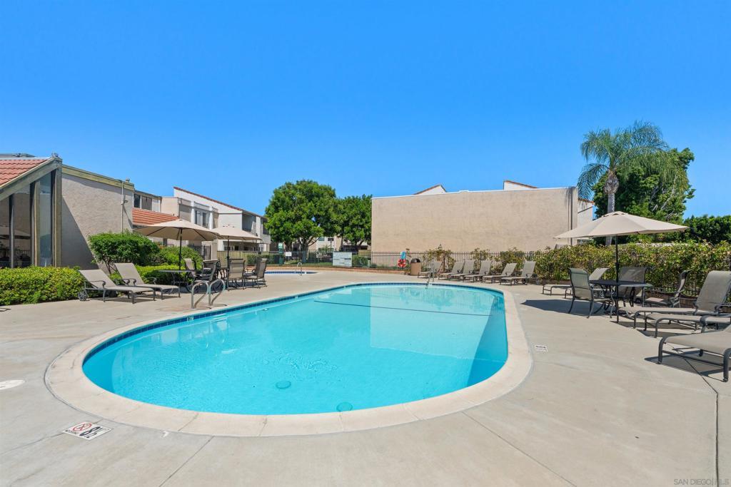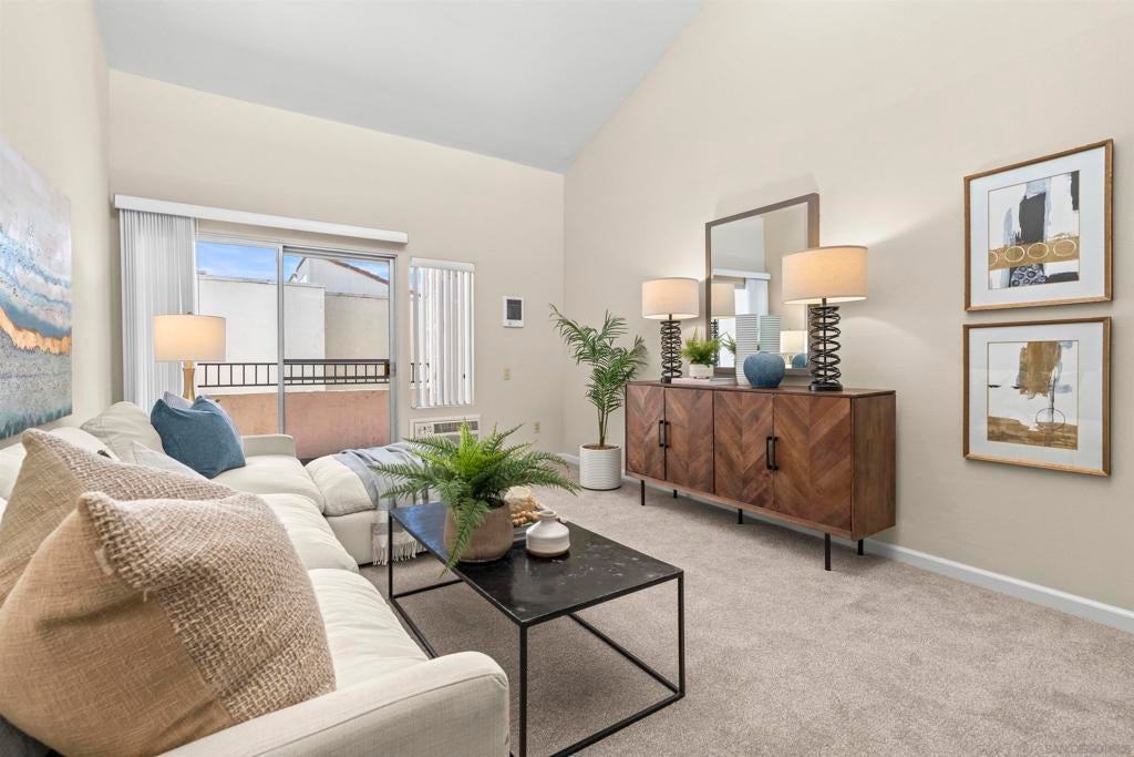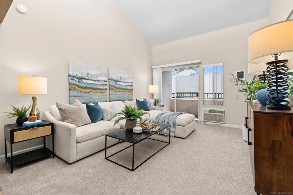 Light, bright & airy! This terrific top floor Serra Mesa condo features vaulted ceilings in the living room, a spacious master bedroom w/ a huge 3 door closet and upgraded shower doors in the master bath. There's also a nice wall AC unit in the living room for those warm Summer days. Upgrades include fresh paint, new carpet, newer 6 panel interior doors & updated light fixtures. There's even 2 assigned parking spots! Please see supplement for more. Welcome home! The complex amenities include a wonderful pool area complete with spa and kiddie pool, a rec room w/ a pool & ping pong table, BBQ area & a large fenced in dog run.