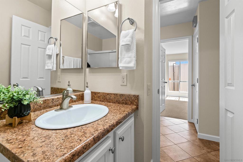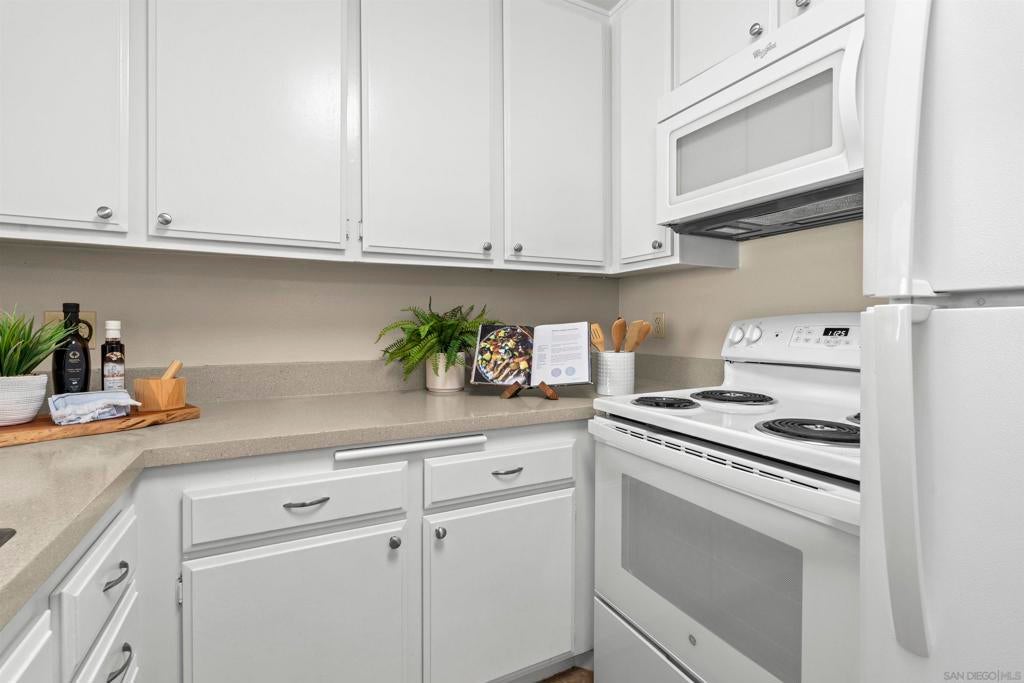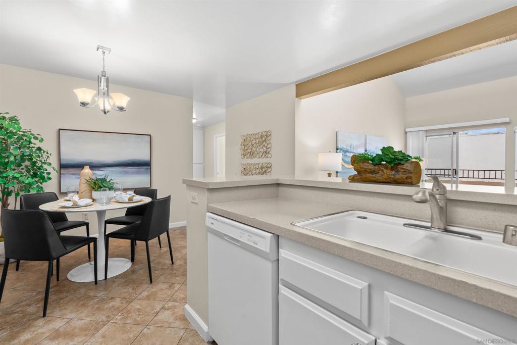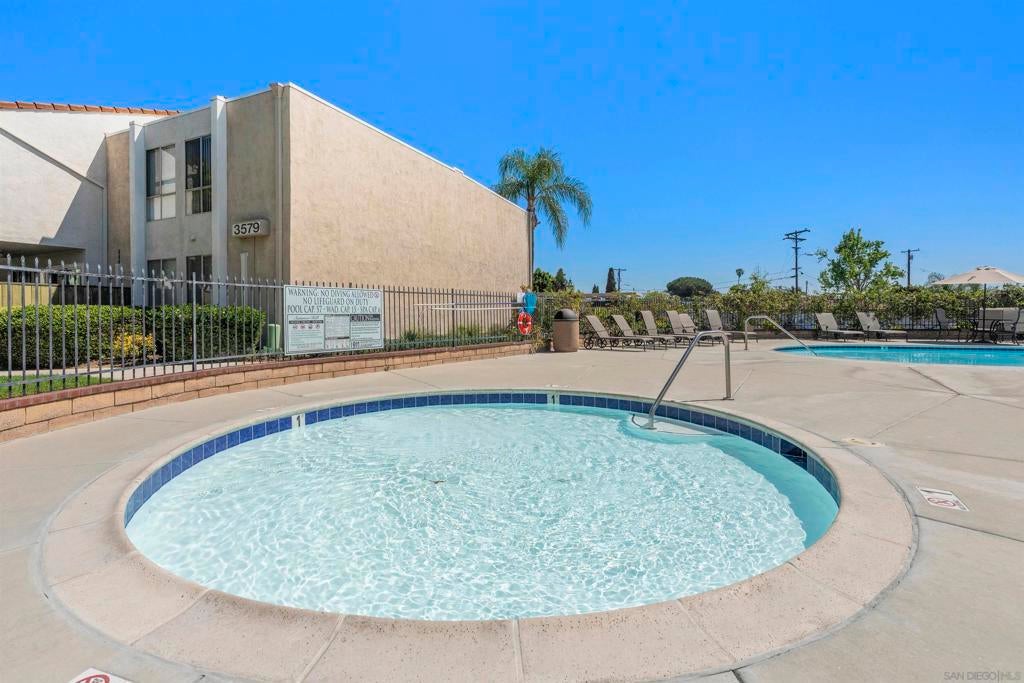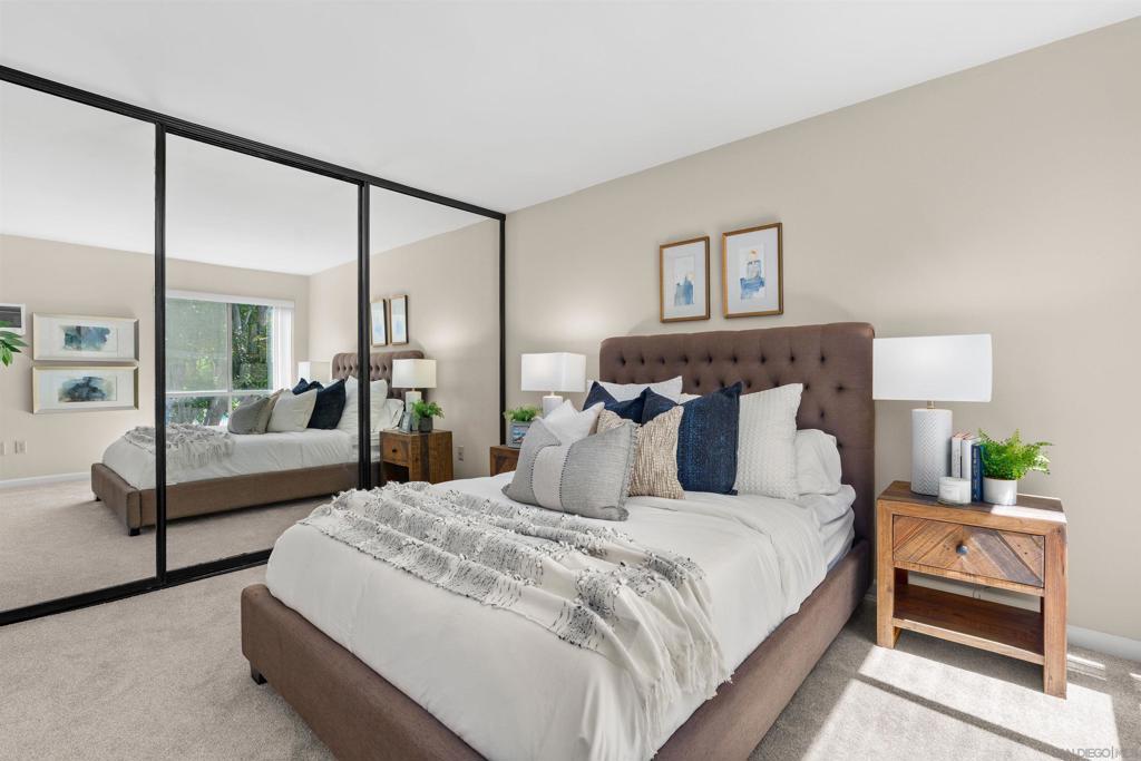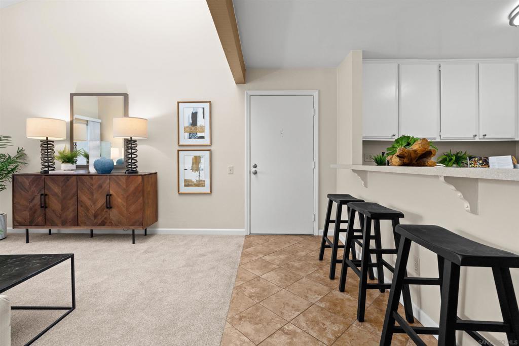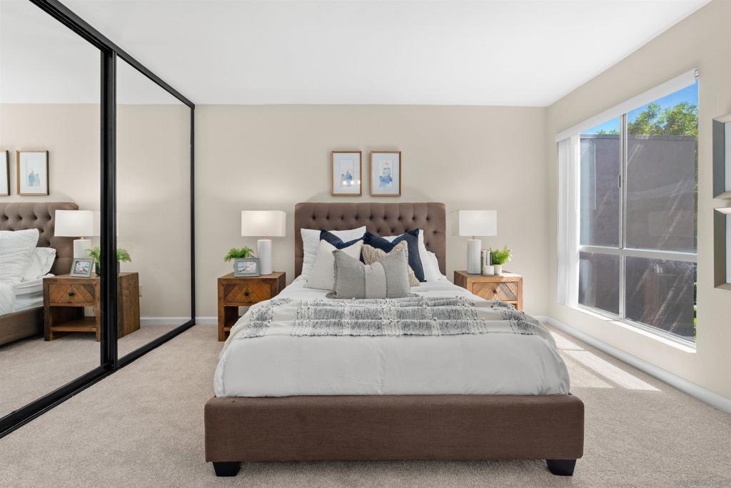 Light, bright & airy! This terrific top floor Serra Mesa condo features vaulted ceilings in the living room, a spacious master bedroom w/ a huge 3 door closet and upgraded shower doors in the master bath. There's also a nice wall AC unit in the living room for those warm Summer days. Upgrades include fresh paint, new carpet, newer 6 panel interior doors & updated light fixtures. There's even 2 assigned parking spots! Please see supplement for more. Welcome home! The complex amenities include a wonderful pool area complete with spa and kiddie pool, a rec room w/ a pool & ping pong table, BBQ area & a large fenced in dog run.