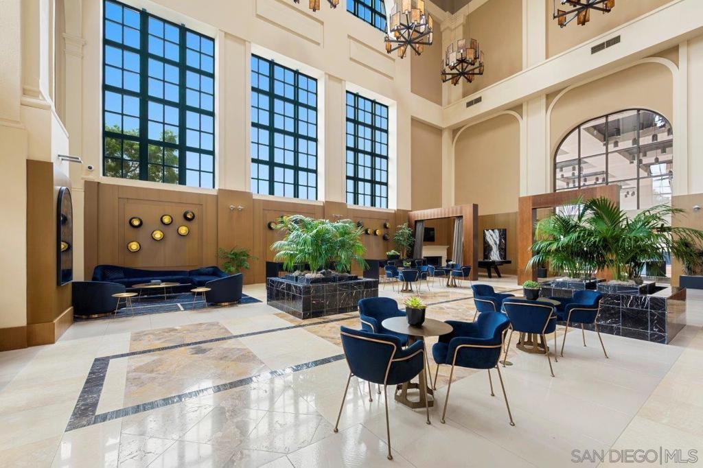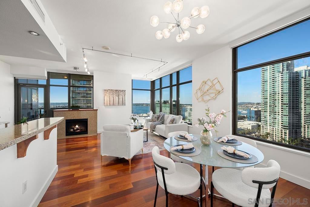 Don’t miss this fabulous northwest corner residence at Electra, well maintained for the discerning buyer! Showcasing Bay, Point Loma, and cityscape views from the many windows as well as the private balcony: the ideal place for trademark sunset evenings. The desirable split-bedroom layout is complemented by engineered cherry wood flooring, track lighting, and an ambient fireplace in the living room, creating a comfortable retreat above the city. Enjoy sit down meals in the dining area while the kitchen features granite countertops, stainless appliances, and recessed lighting, making it perfect for both everyday living and entertaining. The primary suite enjoys gorgeous views and an ensuite bath with dual vanity, step-in shower, and deep soaking tub. The second bedroom offers a built-in executive desk area and easily functions as a guest room, office, or flex space. Additional highlights include custom Elfa closet organization throughout, a generously sized utility/laundry room, extra storage space, and two parking spaces (tandem). Offering a fabulous location in the coveted Columbia District, you will love being only a short walk to Waterfront Park, Seaport Village, The Headquarters, vibrant Little Italy, and much more. Offering a fabulous location in the coveted Columbia District, you will love being only a short walk to Waterfront Park, Seaport Village, The Headquarters, and the brand-new Rady’s Shell at Jacobs Park, a unique live music venue and home of the San Diego Symphony! Also enjoy proximity to the future life science and biotechnology research development The Research and Development District (The RaDD) at the Embarcadero and the sustainable tech-focused Horton Plaza Redevelopment in the center of the city. Electra has the unique distinction of being built around the historical 1928 SDG&E Station B. Residents can take advantage of an array of services including a concierge, security, and guest parking spaces available by reservation through a simple mobile app. Unwind and relax in the steam room or sauna, resort-style pool and spa, fitness center, and Electra Park on the 5th floor surrounded by lush landscaping and a romantic outdoor fireplace and top-of-the-line barbecues.