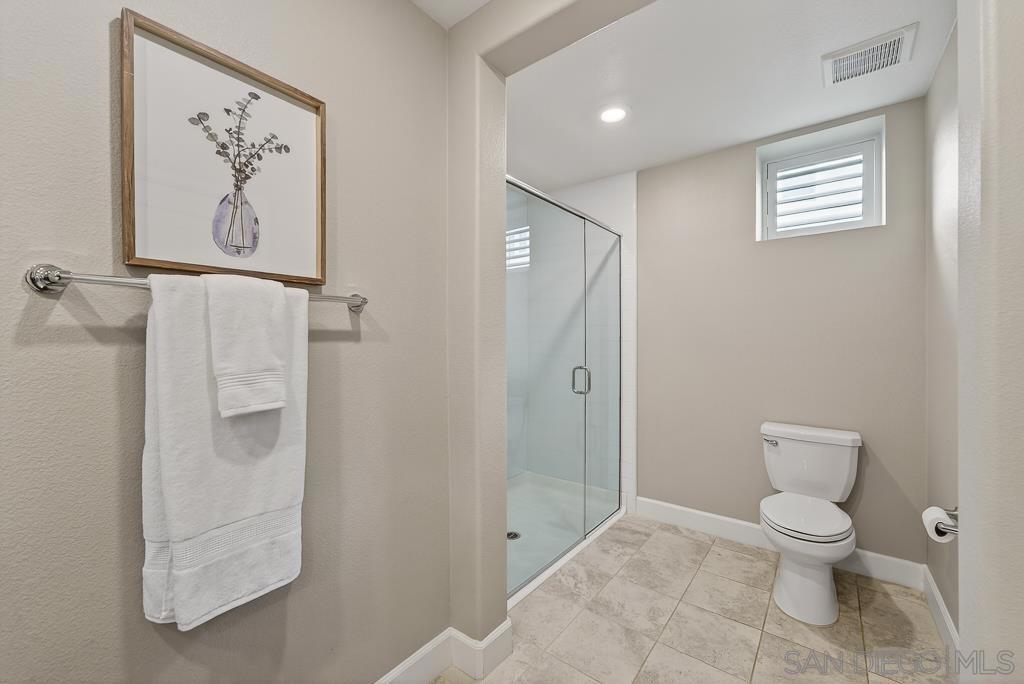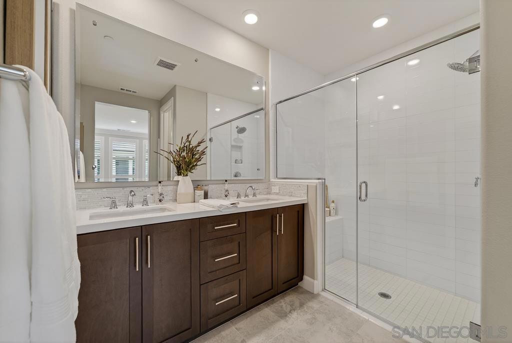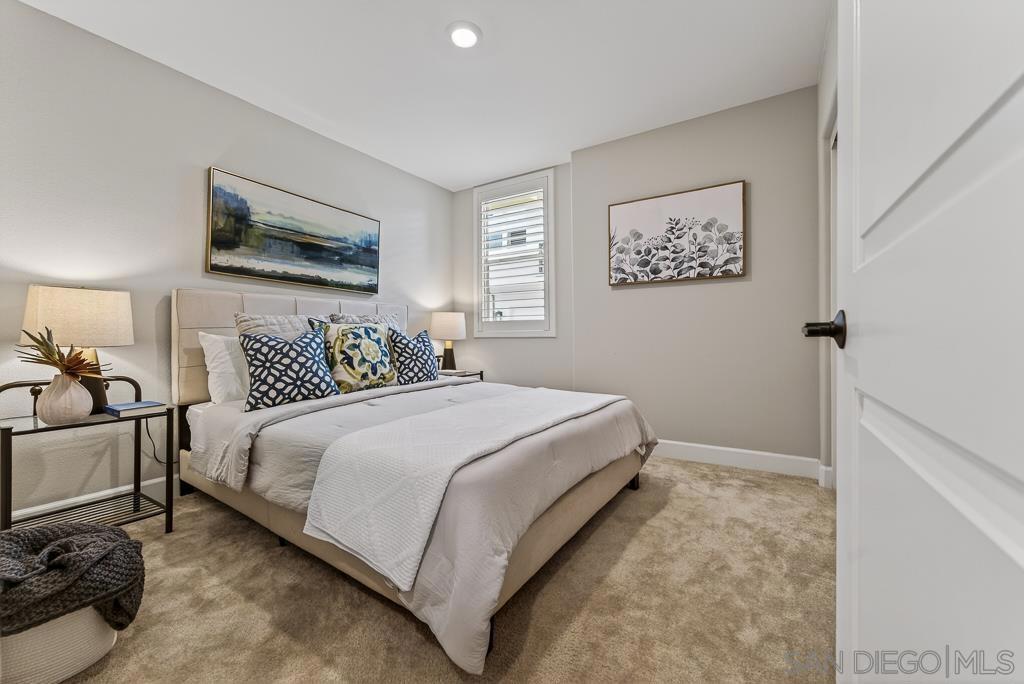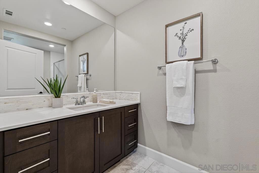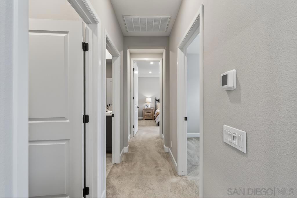 AVANTE IS A 55+ COMMUNITY. Elevated modern living meets comfort and convenience in this 3 bd/3 ba home in the heart of Del Sur’! ONLY AVANTE FLOOR PLAN WITH A FULL BEDROOM & BATHROOM DOWNSTAIRS - ideal for guests, a caretaker or home office. Enjoy 1,688 sq. ft. of rich finishes, natural light, and designer touches. Take the stairs or your own private in-home elevator to the bright, open concept main level. The kitchen showcases Denali White quartz countertops, smoke-toned shaker cabinetry with sleek chrome... pulls, a modern linear mosaic backsplash, glass display cabinets, European soft-close drawers, and a stainless steel G.E. appliances. Under-cabinet lighting and clean, contemporary finishes create a refined, functional space. Enjoy a morning coffee and relaxing evening on your private southeast-facing balcony. The spacious primary suite features crown molding, a custom built-in walk-in closet, and a spa-inspired bathroom with a designer linear mosaic backsplash & quartz countertops. Bathrooms include Arizona Denali quartz counters, modern fixtures, and Esmer tile shower surrounds. Additional highlights include wood shutters, motorized privacy shades, and an epoxied garage floor. Smart home features include a Ring doorbell, Honeywell smart thermostats, enhanced WiFi connectivity, & smart lighting. Enjoy access to the Avante clubhouse, pool & spa, fire pit, BBQ areas, and events. Located within the award-winning Del Sur community with access to parks, pools, and scenic trails—all just a short walk to Del Sur Town Center. A rare opportunity to own a truly turn-key, lock & leave home in one of North County’s most sought-after 55+ communities!