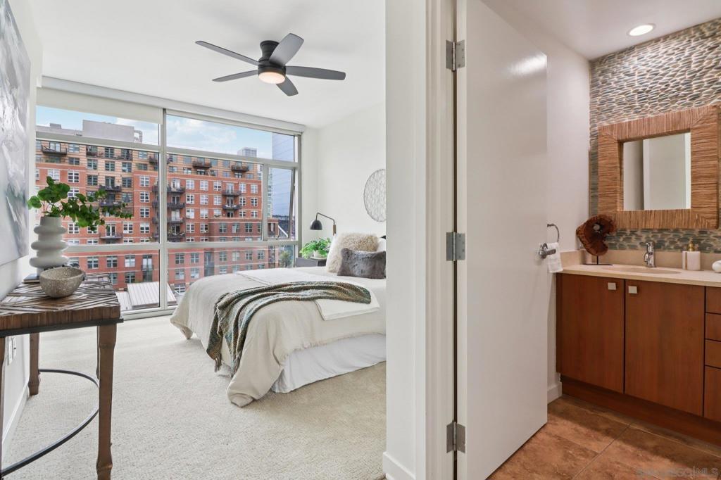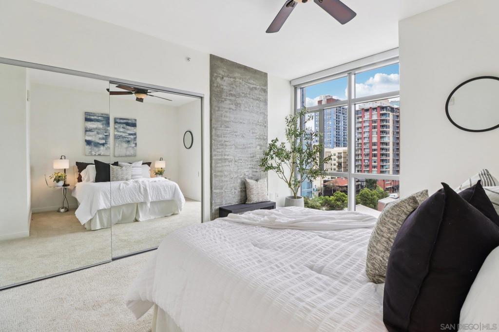 Experience elevated urban living at The Mark in Downtown San Diego’s vibrant East Village. This spacious 2-bedroom, 2-bath residence offers approximately 1,228 sq ft of thoughtfully designed living space, blending modern upgrades with striking architectural elements. An ideal split-bedroom floor plan ensures privacy, with both bedrooms and bathrooms offering generous space and comfort. Inside, an open-concept layout unfolds with floor-to-ceiling windows that flood the home with natural light and city vistas, along with expansive living and dining areas perfect for everyday living and entertaining. The kitchen is well-appointed with quality appliances, dual wine refrigerators, and ample storage, creating a functional and refined culinary space. Both bathrooms showcase distinctive custom rock wall accents, adding a bold, spa-inspired aesthetic, while the large walk-in closet with built-ins offers exceptional organization. Step outside to a private patio overlooking park-like grounds with pool and green space views—ideal for relaxing or hosting guests. Additional highlights include in-unit laundry, a dedicated storage locker, and two side-by-side parking spaces in a secure garage. Residents enjoy resort-style amenities including a pool and spa, fitness center, concierge service, and 24-hour security, all just moments from Petco Park and the Gaslamp Quarter.