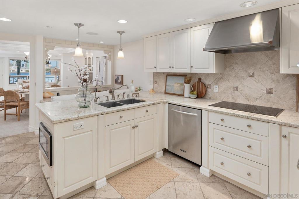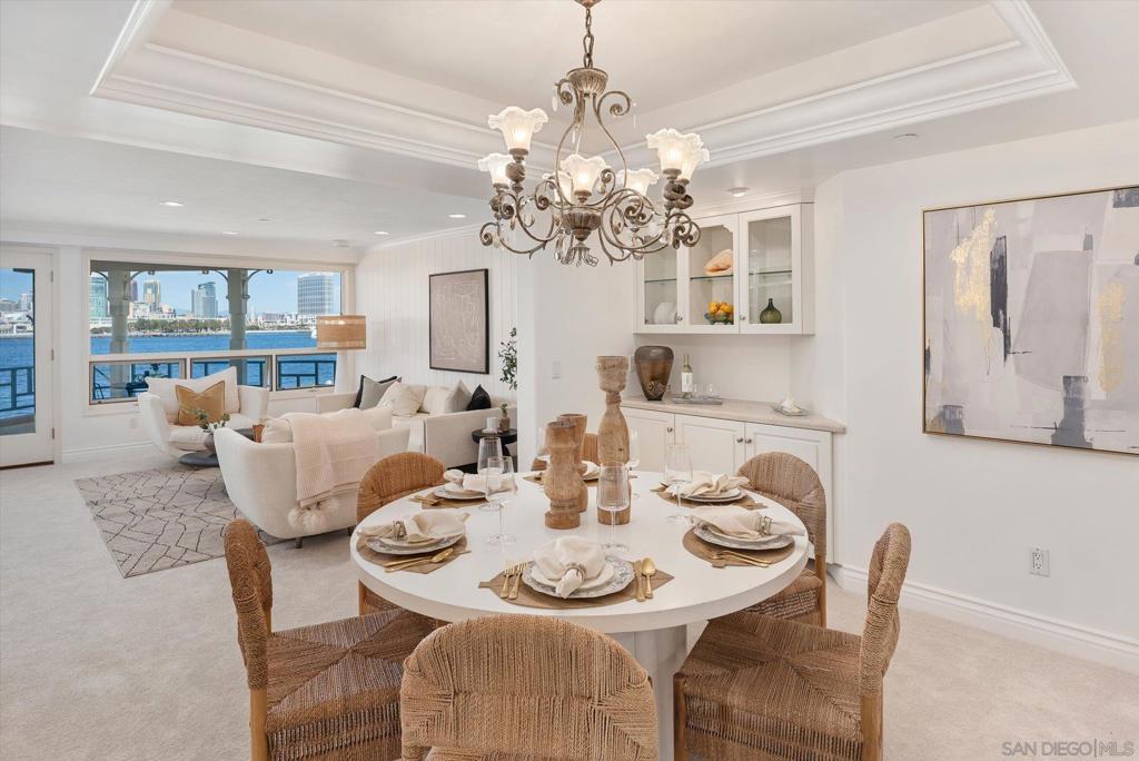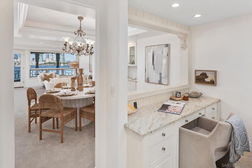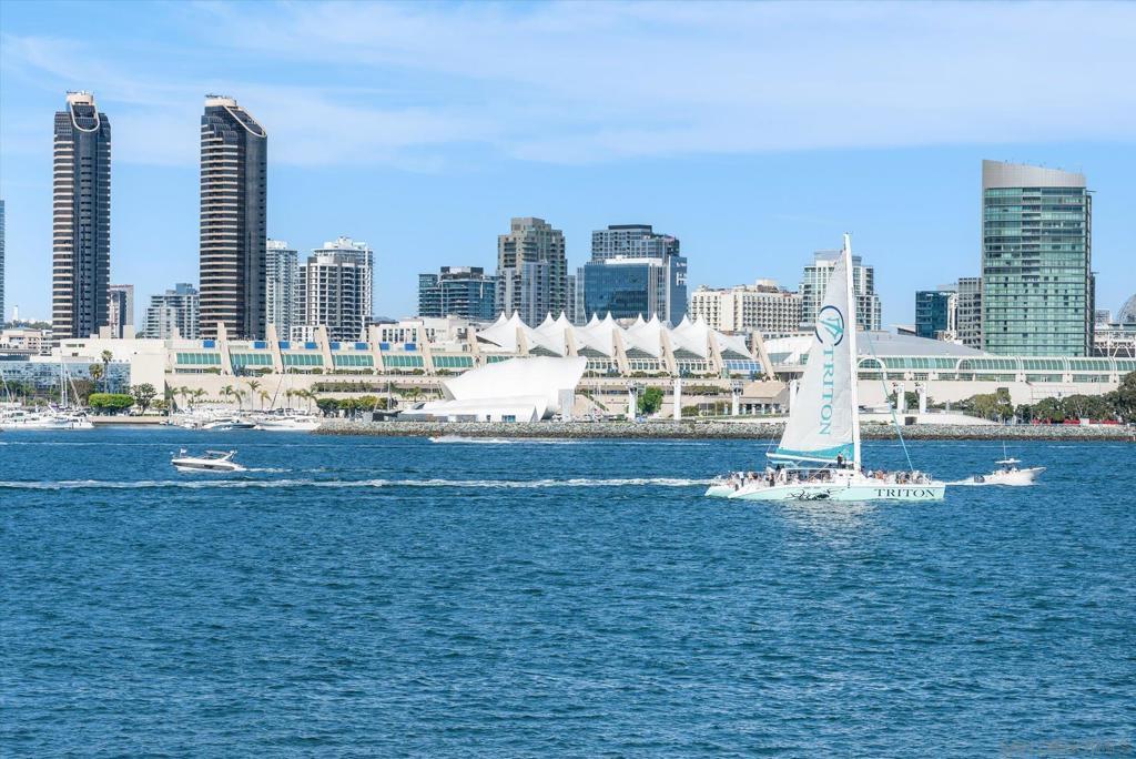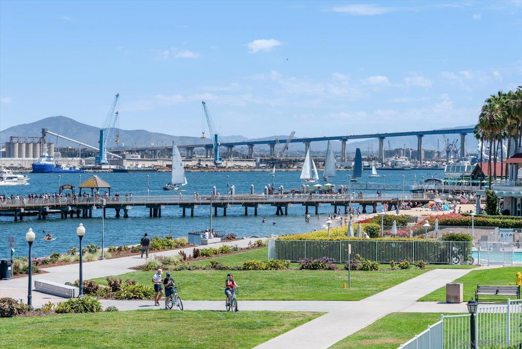 "No Kidding" panoramic full-on-water views of San Diego Bay & the Downtown Skyline. Gorgeously appointed with high-end designer finishes and textiles. SubZero, Dacor and Wolfe appliances. Luxurious & spacious primary bathroom with lovely built-in cabinetry, walk-in closets and ample storage. Beautiful tiled walk-in shower. Built in cabinetry thru-out with tastefully hidden Murphy bed in living room and new premium carpet. Exquisite marble flooring in half bath. Absolutely amazing water views from the kitchen, dining & living rooms. Enjoy fireworks, ships and boats saililng by from your covered patio terrace as well as having full access to the fun sandy beach and grass lawn right outside your unit. Hop on the ferry to the Gaslamp, Rady's Shell, Padres PETCO park, Seaport Village & Port of San Diego. Stroll to Coronado restaurants & shopping. The Landing offers a wonderful outdoor heated pool, fitness center, lovely gardens & landscaping. 2 underground parking spaces right next to the elevator. Truly an opportunity of a lifetime! This is an exceptional home with breathtaking views that rarely comes up on the market. A stunning & rare beauty! This is truly an amazing place to live. The full panoramic views of San Diego Bay are absolutely breathtaking and seductive! Enjoy watching ships and boats sail through the harbor from your private terrace. Hop onto the ferry for dining & shops at the famous Gaslamp, or enjoy some fantastic live music entertainment at the outdoor Rady's Shell or take in a San Diego Padres game at PETCO park. Easy peezy because it is all right there in your backyard. This luxurious unit has gorgeous finishes. Wait till you see the stunning marble flooring in the half bath. BEEE-U-TI-FUL! The primary bathroom boasts a beautifully tiled walk-in shower, lovely cabinetry with ample storage and walk-in closets. New carpet and a Murphy bed tastefully built-in to the living room cabinetry. The Landing offers a heated outdoor pool right on the water and a fitness center, meeting rooms and lovely landscaped grounds including a gorgeous rose garden outside the entrance. 2 parking spaces are located right as you come out of the elevator in an underground garage. This is truly a very special place. The views are intoxicating!