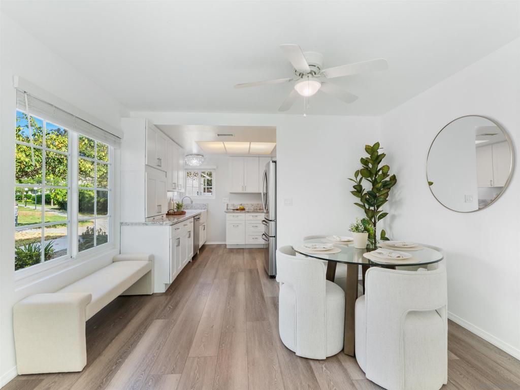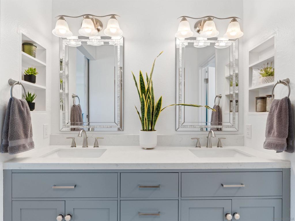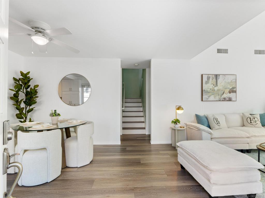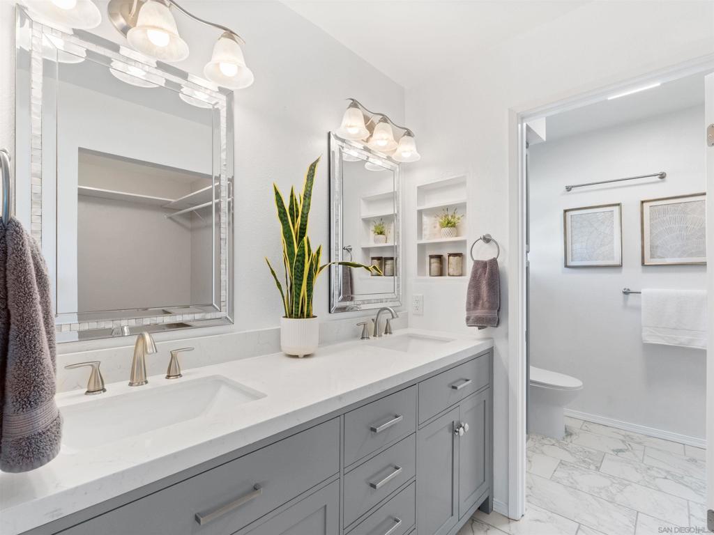 Welcome to this beautifully remodeled home in the highly desirable Calavera Hills community—perfect for families, retirees, or savvy investors. Set on a premium canyon lot, it offers scenic views, modern upgrades, and comfortable, low-maintenance living with broad appeal and lasting value.This 3-bedroom home in The Crest has two bedrooms on the entry floor, offers privacy, views, and true indoor-outdoor living with new pavers and turf. Updates include a fully remodeled kitchen with farmhouse sink and new refrigerator, newer appliances, luxury vinyl plank flooring, custom Italian marble tile, stone-topped vanities, newer windows and slider, and new heater/AC, fresh paint, whole home water filtration system - One Water Systems, Elite 15 Series and fresh paint. The oversized primary suite features a custom barn door and built-in closet system. Enjoy the remodeled laundry area with newer washer and dryer, large outdoor storage PLUS expanded and finished attic for even more storage. With a low HOA and a prime location walkable to Hope Elementary, Calavera Park, and local hiking trails, this home has it all.