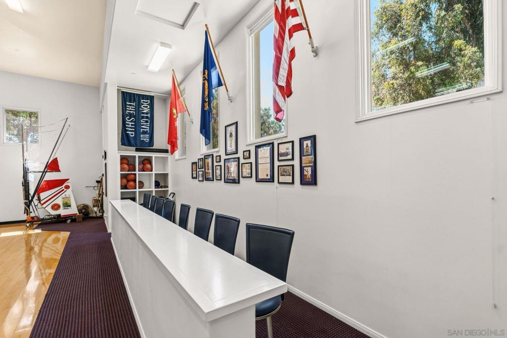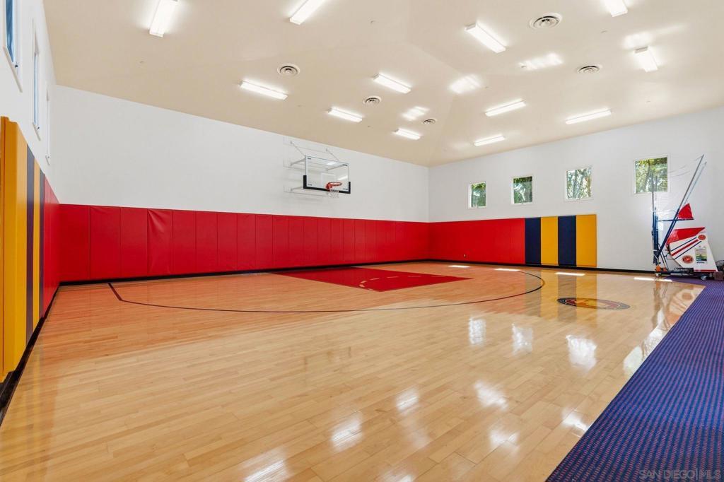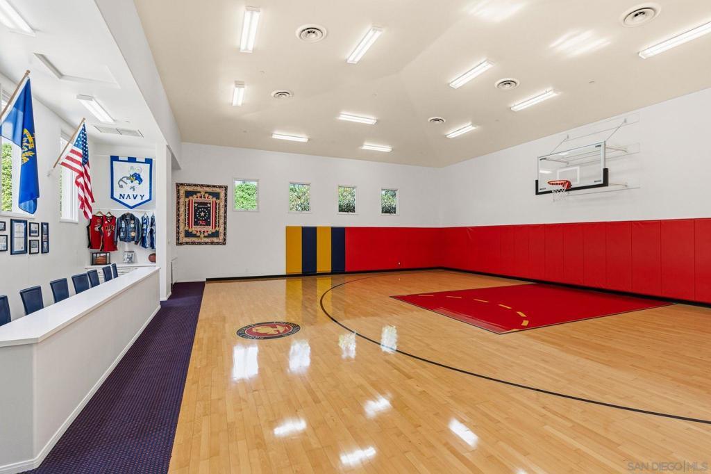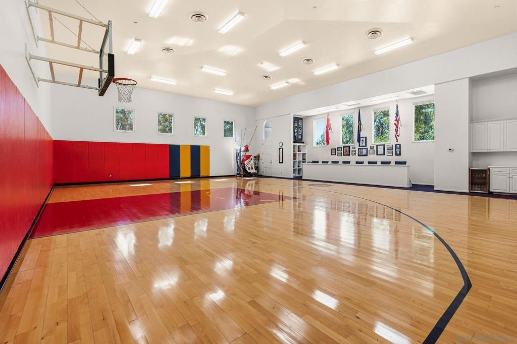 Set behind the gates of exclusive Fairbanks Ranch, this remarkable nearly 2-acre estate offers a rare combination of architectural scale, resort-inspired amenities, and exceptional privacy within one of Rancho Santa Fe’s most prestigious communities. Designed as a private compound for refined living and grand entertaining, the property encompasses an 8,110± square foot main residence, an 1,834± square foot guest house, and an extraordinary 2,014± square foot climate-controlled indoor basketball court—an amenity rarely found in residential estates. The five-bedroom main residence is thoughtfully designed with expansive living spaces, elegant finishes, and a layout that balances sophistication with everyday comfort. The home features the rare advantage of two luxurious primary suites, including a main-level retreat and an extraordinary upper-level primary sanctuary occupying its own private floor. This serene escape includes a sitting room with fireplace, private office, exercise area, and outdoor porch, complemented by a beautifully remodeled spa-inspired bath featuring a large soaking tub and stand-alone shower. Throughout the home, warm and inviting interiors showcase engineered hardwood flooring, porcelain tile, and plush carpeting, along with thoughtfully curated spaces designed for both entertaining and relaxation. See Supplement. A welcoming family room with fireplace, custom wood built-ins, and integrated audio anchors the home’s gathering spaces, while distinctive rooms including a Tasting Salon, charming telephone room, mudroom, and spacious laundry room add both character and function. At the center of the home, the chef’s kitchen is designed to accommodate both everyday living and large-scale entertaining. Features include dual cooktops (gas and electric), two dishwashers, oversized refrigerator, oven plus microwave/convection oven, and a generous walk-in pantry that could easily function as a scullery or secondary prep kitchen. Modern infrastructure and efficiency enhance the estate’s comfort and sustainability, including 60 owned solar panels delivering virtually no annual electric cost, multiple HVAC systems, tankless water heater, water softener, under-counter water filtration, new Cat6 wiring, and replaced skylights. Beyond the residence, the grounds unfold as a private resort environment. A beautifully designed saline pool serves as the centerpiece of the outdoor living experience and was built to be enjoyed for volleyball, offering a fun and distinctive recreational feature rarely found at a private residence. A jacuzzi and fountain further elevate the setting, while the surrounding landscape offers a variety of additional amenities including a putting green with sand traps, greenhouse, and a children’s play area with swing set, playhouse, and in-ground trampoline. The property is fully fenced, creating both privacy and security while maintaining a sense of openness across the manicured grounds. The detached 1,834± square foot structure is thoughtfully designed to include both the guest house and the property’s two pool bathrooms, creating a highly functional and versatile extension of the estate. The guest house offers comfortable accommodations with a private bedroom, living area, kitchen, full bath, and its own laundry area, while one of the two pool bathrooms is connected to a sauna—adding a distinctive resort-inspired amenity that enhances the property’s appeal for entertaining, extended stays, staff, and seamless enjoyment of the outdoor living areas. For recreation enthusiasts, the estate features a truly exceptional amenity—a 2,014± square foot indoor basketball court with soaring 22-foot ceilings and its own HVAC system, offering a year-round athletic space rarely seen in private residences. Additional features include a three-car garage, three gas fireplaces, and a thoughtful blend of luxury, utility, and recreation throughout the property. With its impressive main residence, well-appoint...