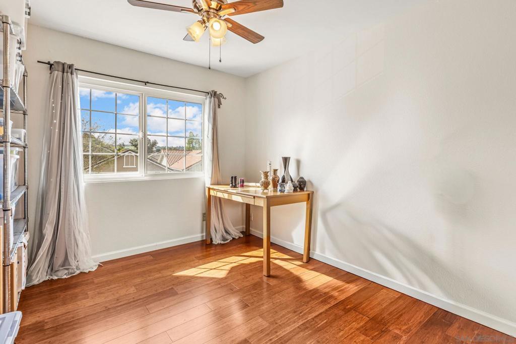 Expanded kitchen, fully owned solar, and private yard. Vaulted ceilings and natural light hit the moment you walk in. Remodeled and expanded kitchen with added dining space, extra pantry storage, granite counters, stainless steel appliances, and a breakfast bar overlooking the yard. Family room with fireplace opens straight to a covered patio. Upstairs, the primary suite delivers a private deck with pool and hill views plus a fully remodeled bath with dual sinks and a walk-in shower. Two additional bedrooms, an updated hall bath, and added hallway cabinetry for storage. Wood floors throughout. Turnkey upgrades include 7.5KW owned solar, AC, dual-pane windows, tankless RO system, newer washer/dryer, and fresh exterior paint. Private backyard backing to greenbelt. Located in Lakeview Estates with pool, spa, and park access, minutes to Guajome Lake and bike trails, and the beach.