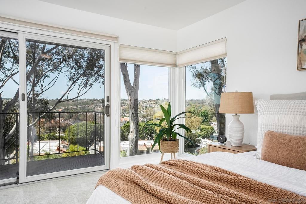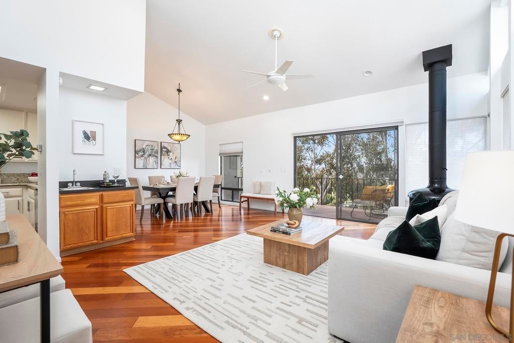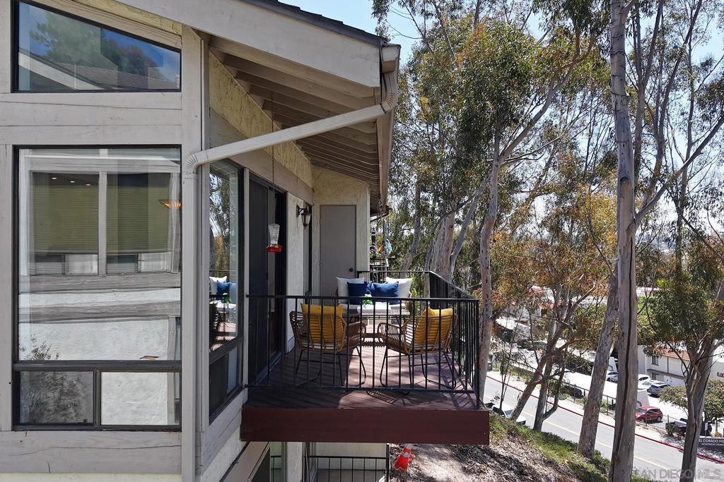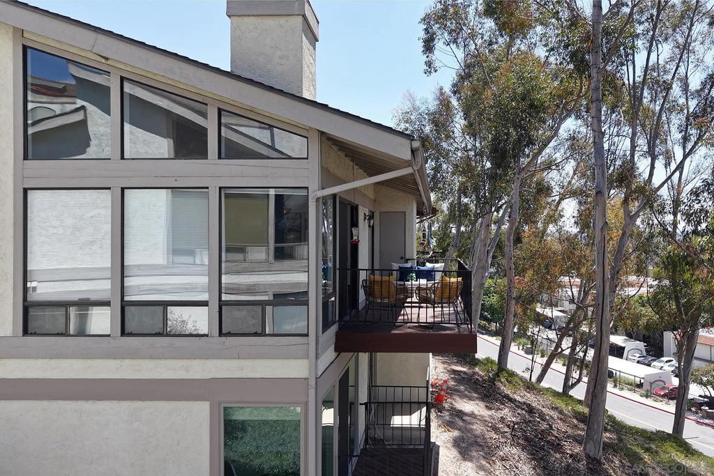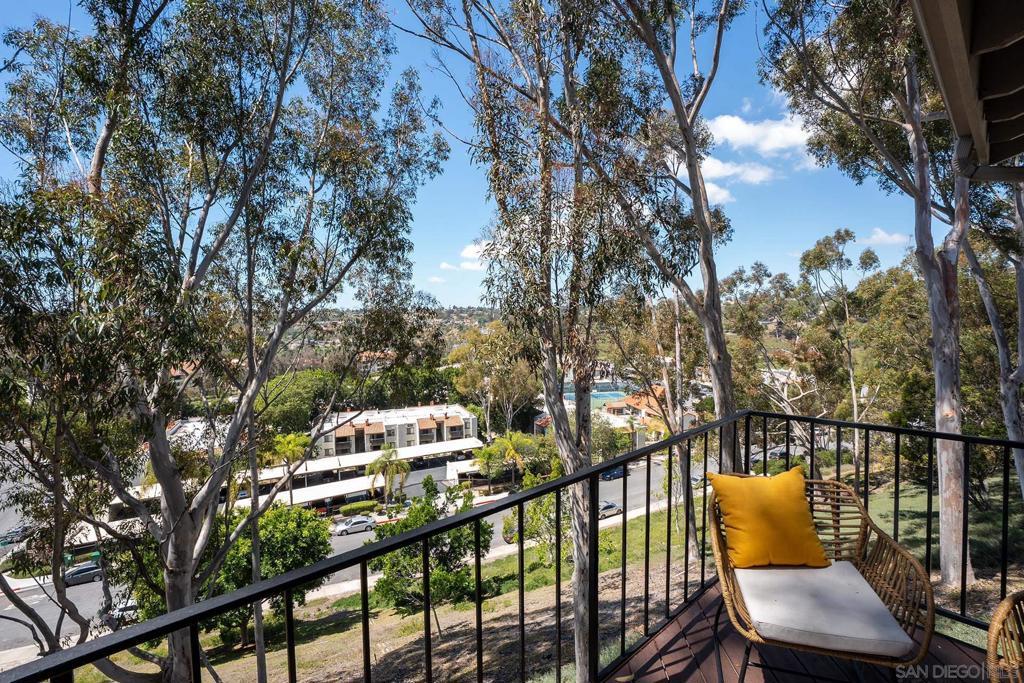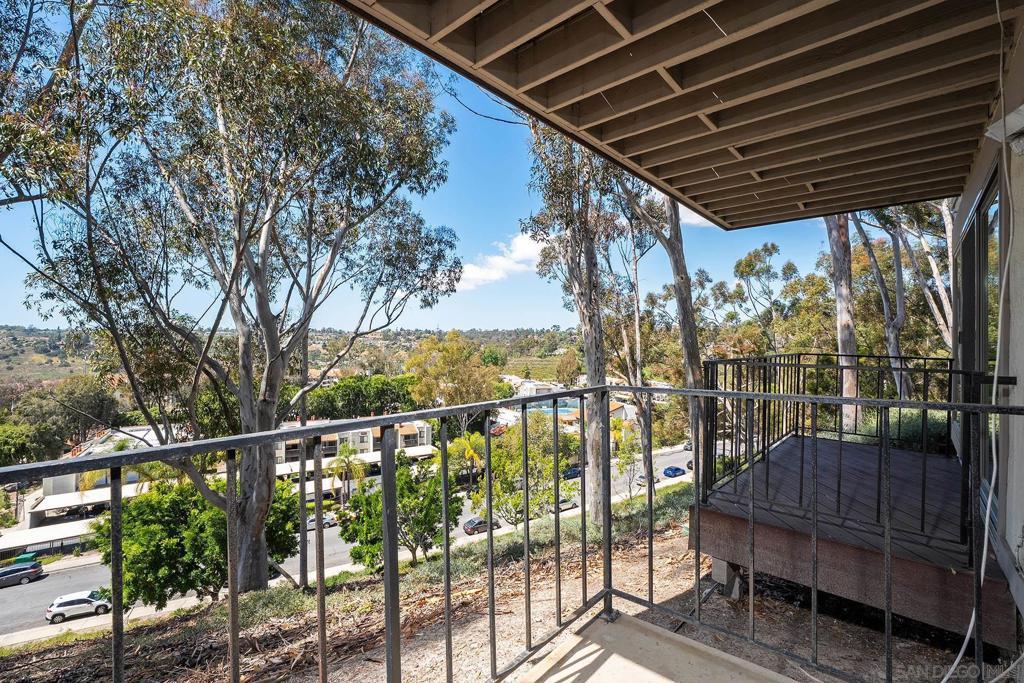 Spectacular southwest sunset views from this tree-top townhome overlooking Admiral Baker Field and Mission Trails canyon. Move-in ready 2-bedroom, 2.5-bath home with an open floor plan, abundant natural light, vaulted ceilings, wood floors, and a striking mid-century modern fireplace. The main living level features the living room, kitchen, and dining area, all capturing breathtaking views and cool afternoon breezes, along with a spacious deck perfect for relaxing or entertaining. The lower level includes two bedrooms, each with its own ensuite bathroom and private deck. Thoughtfully designed with only one shared wall, the home lives like a private residence. Community pool and plenty of street parking. They simply don’t build homes like this anymore.