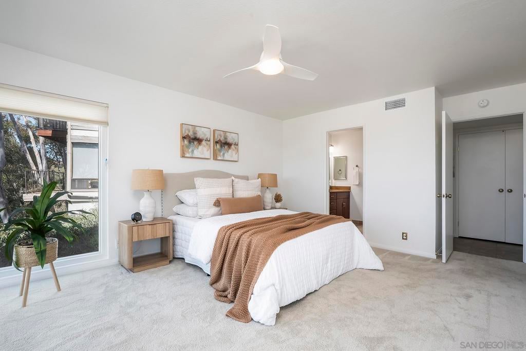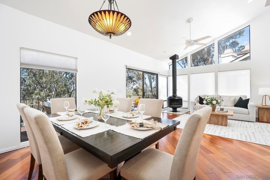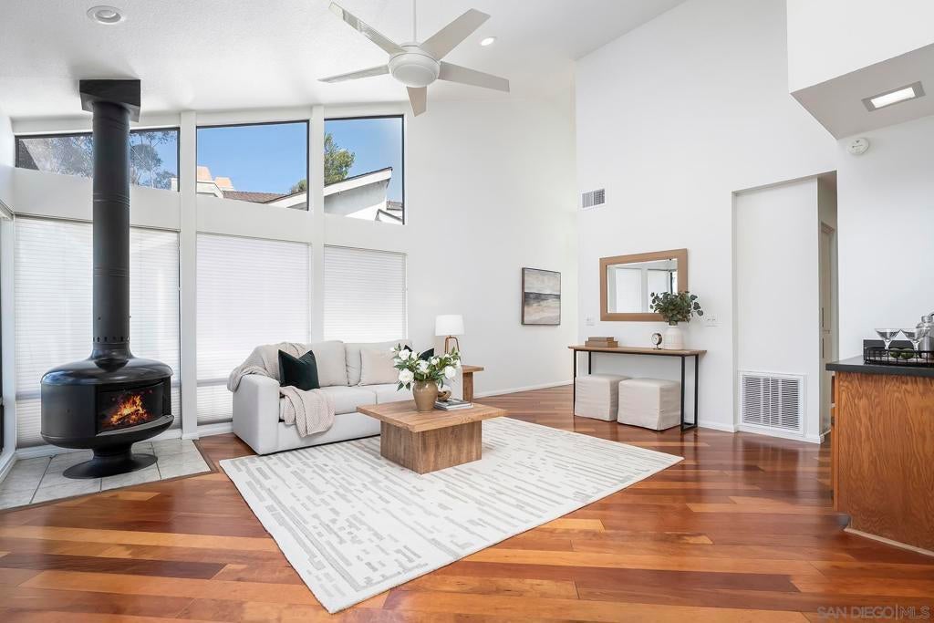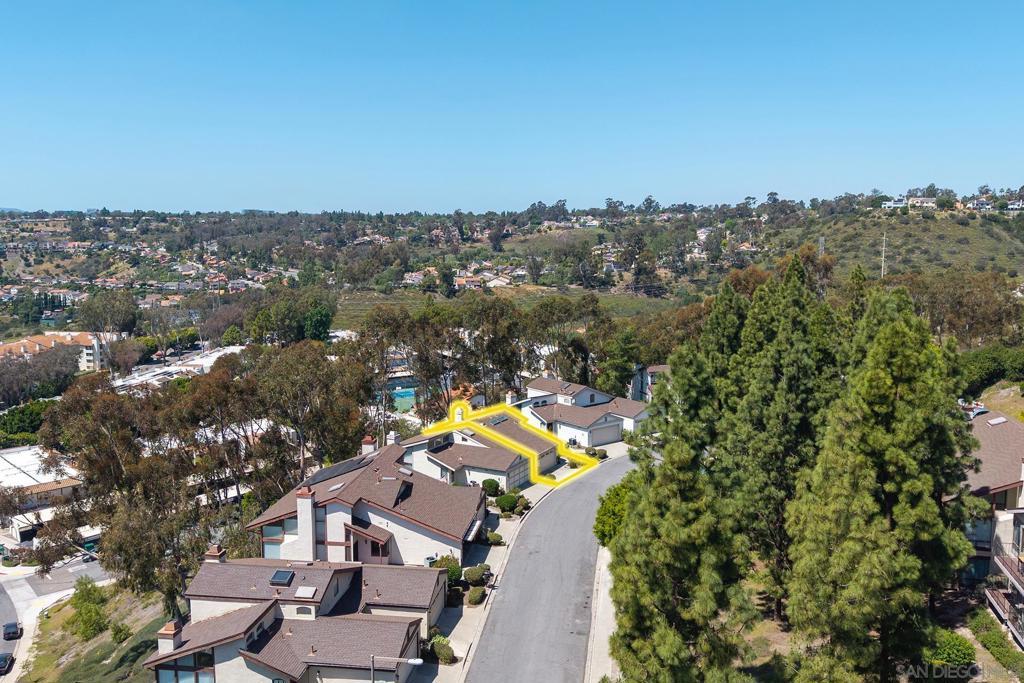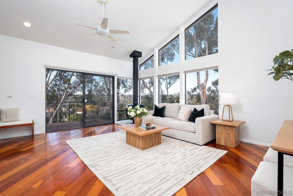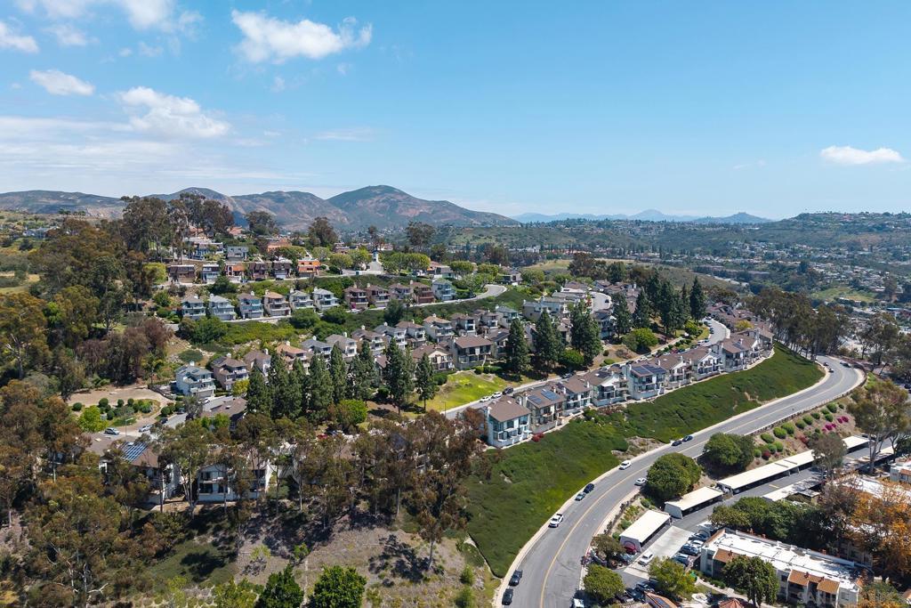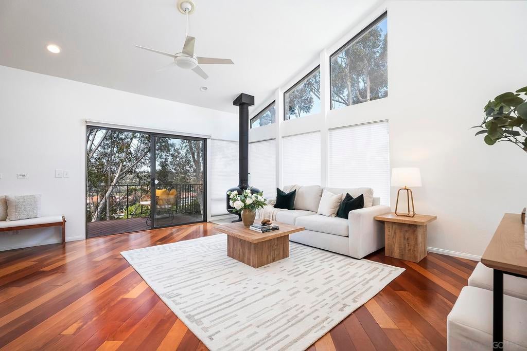 Spectacular southwest sunset views from this tree-top townhome overlooking Admiral Baker Field and Mission Trails canyon. Move-in ready 2-bedroom, 2.5-bath home with an open floor plan, abundant natural light, vaulted ceilings, wood floors, and a striking mid-century modern fireplace. The main living level features the living room, kitchen, and dining area, all capturing breathtaking views and cool afternoon breezes, along with a spacious deck perfect for relaxing or entertaining. The lower level includes two bedrooms, each with its own ensuite bathroom and private deck. Thoughtfully designed with only one shared wall, the home lives like a private residence. Community pool and plenty of street parking. They simply don’t build homes like this anymore.