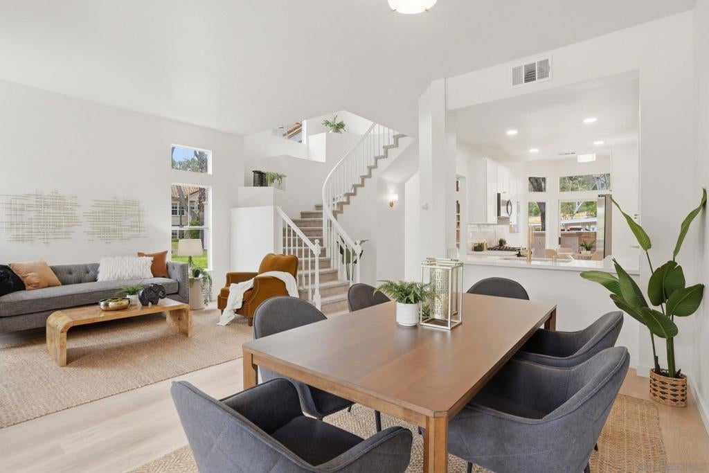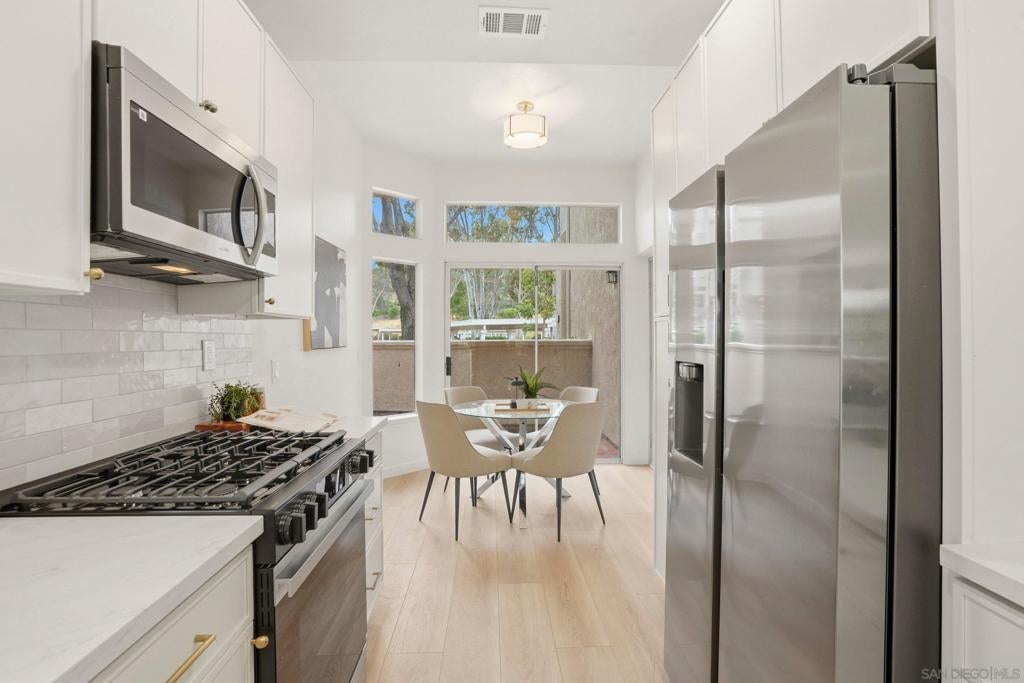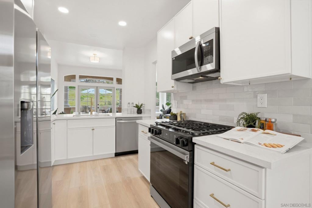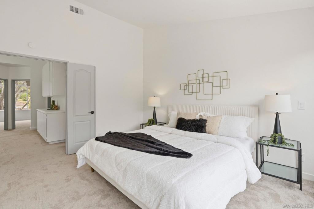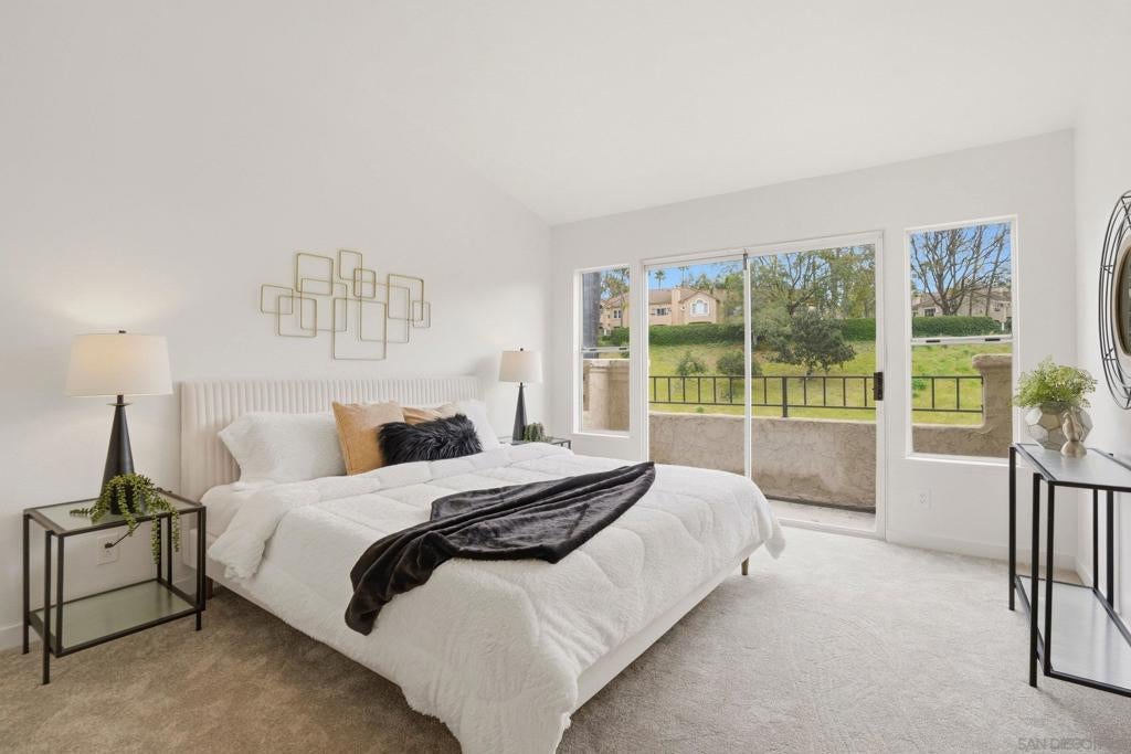 You’ll fall in love with this beautiful end unit 3 bedroom, 2.5 bath townhome located within the highly desirable Belsera Community in Tierrasanta. Perfecty positioned on a premium lot with picturesque park and mountain views! Beautifully designed for effortless indoor-outdoor living, the home features spacious patios at both the front and back—ideal for al fresco dining, relaxing, or entertaining while taking in the serene surroundings and mesmerizing views. Extensive renovations elevate every corner of the home, including luxury vinyl wood plank flooring, fresh interior paint, new carpet, recessed lighting, new white cabinetry, countertops, stylish lighting and fixtures. The kitchen showcasing quartz countertops, a tiled backsplash, farmhouse sink, pendant lighting, stainless steel appliances—perfect for casual dining or bar seating. A modern staircase leads you upstairs to the bedrooms, where the spacious primary bedroom serves as a relaxing retreat, complete with beautiful views, walk-in closet, and an en-suite bathroom with quartz countertops and a large walk-in shower with elegant tile finishes. Secondary bedrooms are located just down the hall and share a well-appointed bathroom with a tiled tub/shower combo and white quartz countertop. A brand new HVAC system was just installed. The property includes one attached garage and one detached garage. Located in a quiet neighborhood with two private pools & spas, plenty of green space to enjoy, volleyball courts, and bbq areas. DON’T MISS OUT ON THIS BEAUTY!