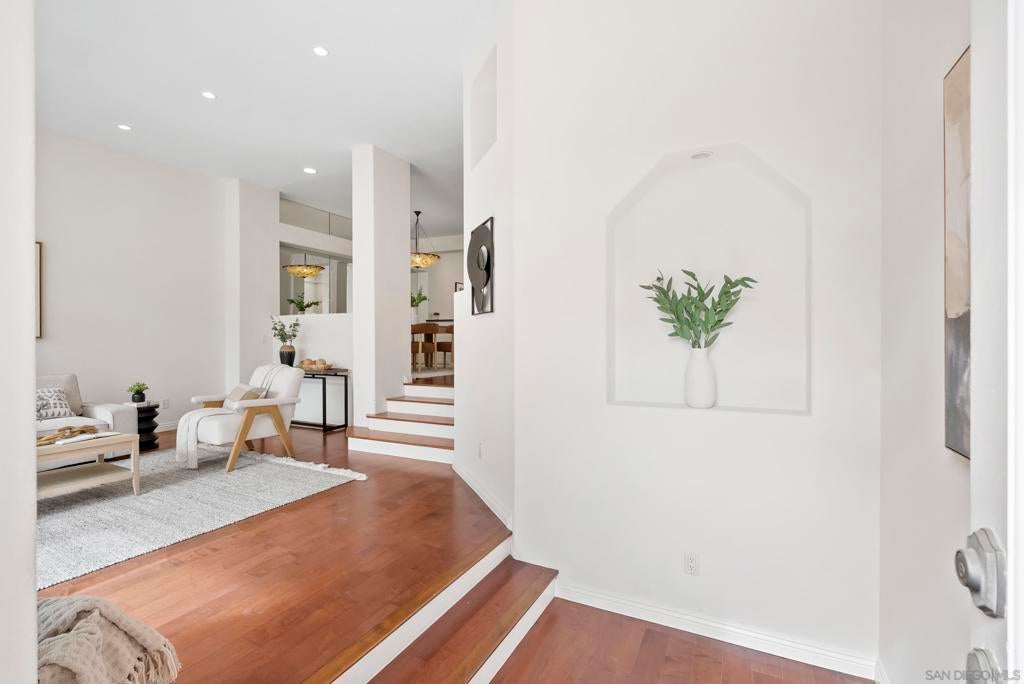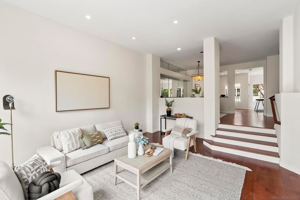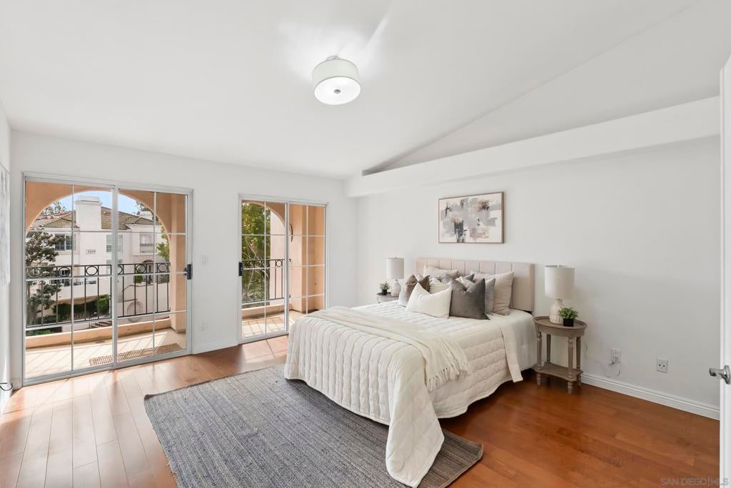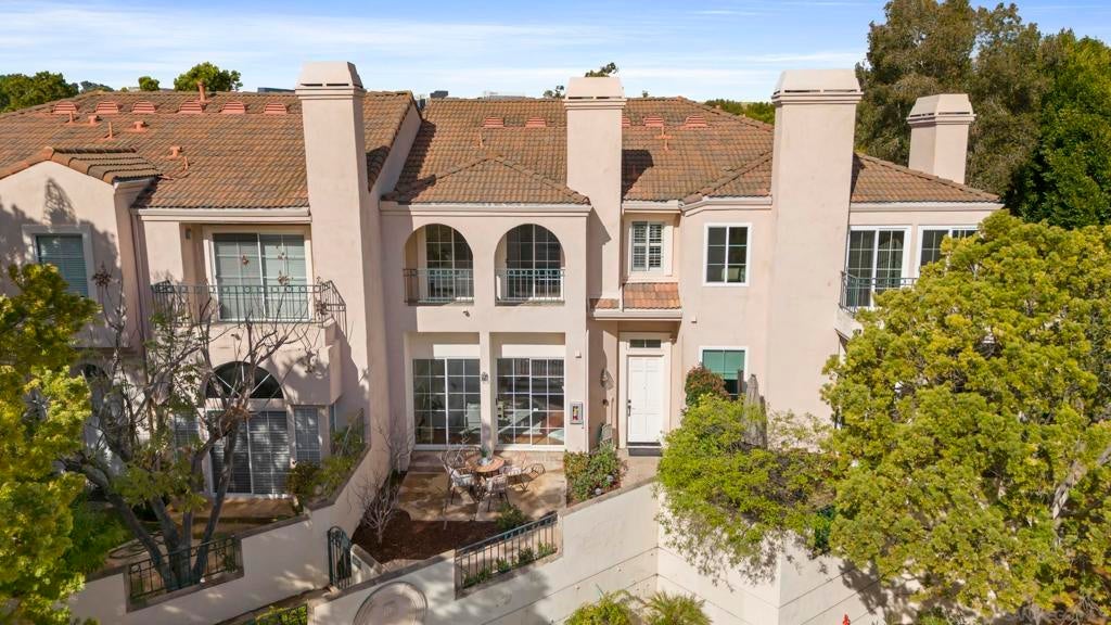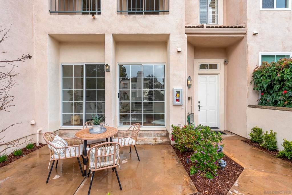 Tucked inside the gated La Florentine community at Renaissance, this refined townhome offers a peaceful setting in a beautifully maintained Italian inspired village in the heart of UTC. The interior showcases an airy, open layout with soaring ceilings, recessed lighting, a tiled fireplace, and fresh interior paint that creates a bright, cohesive feel. The remodeled kitchen blends style and function with custom white cabinetry featuring built in drawer organizers, quartz countertops, an expansive island, and premium appliances, making it ideal for both everyday living and entertaining. A spacious south facing front patio welcomes abundant sunshine and provides an inviting setting for outdoor dining, weekend barbecues, or a quiet morning coffee. The primary suite serves as a private retreat, complete with its own balcony, walk in closet, and an upgraded bath featuring a soaking tub, tile flooring, dual vanities with granite counters, and a separate tiled shower. Additional features include an oversized two car garage with storage on the lower level and access to community amenities such as a pool and spa. Centrally positioned in UTC, residents enjoy convenient access to a wide selection of restaurants, the UTC shopping center, neighborhood parks and walking paths, as well as close proximity to beaches, UCSD, and highly regarded San Diego Unified schools.