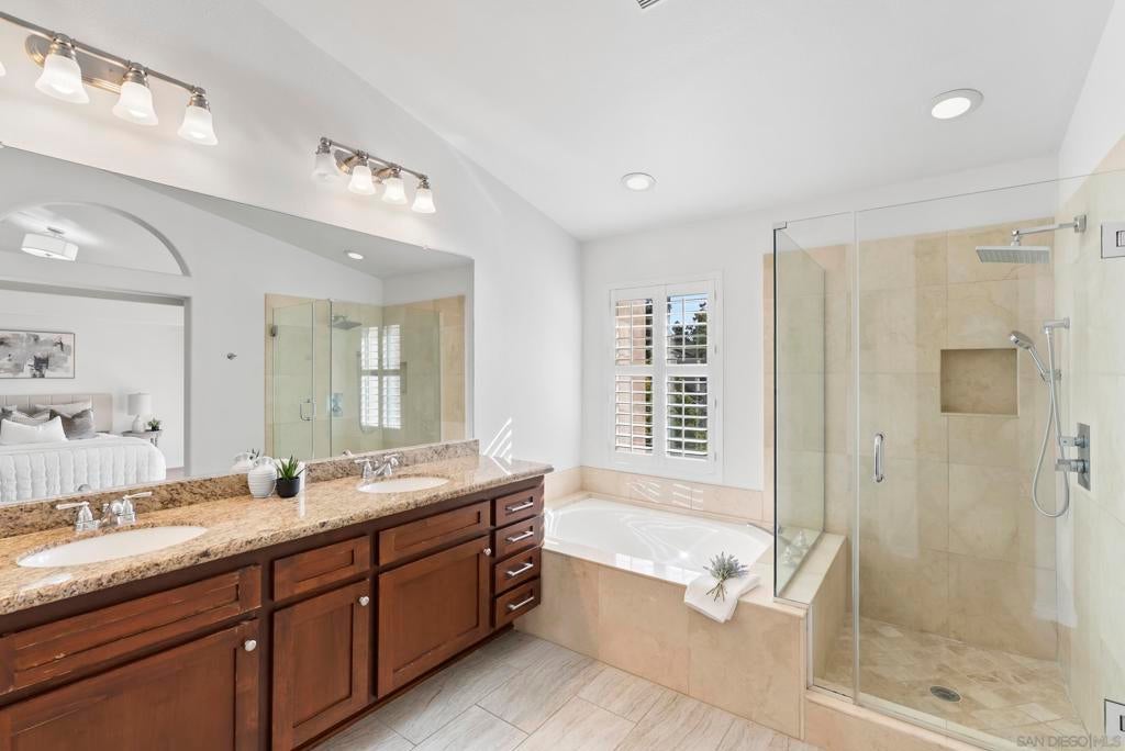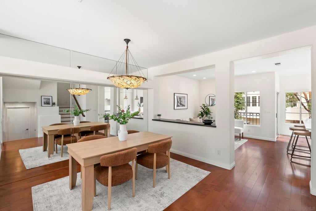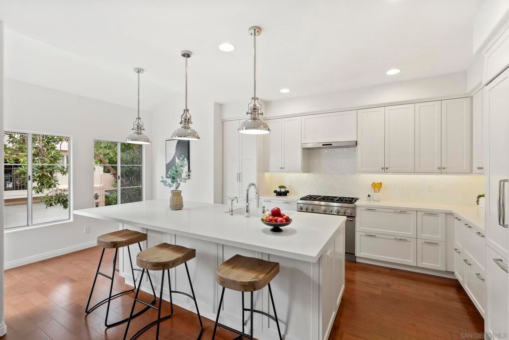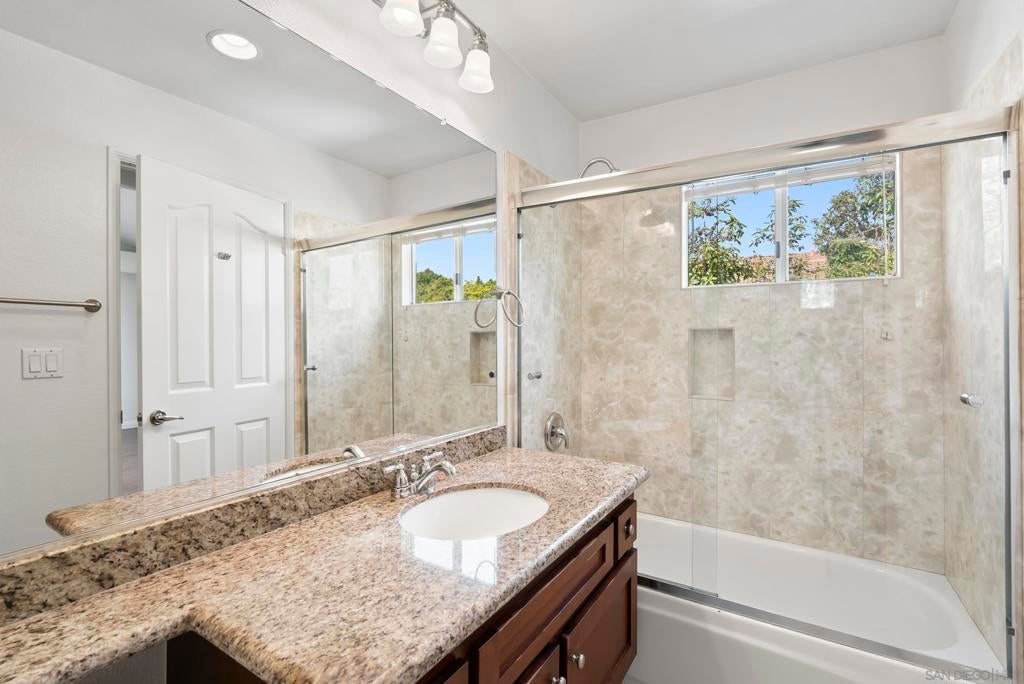 Tucked inside the gated La Florentine community at Renaissance, this refined townhome offers a peaceful setting in a beautifully maintained Italian inspired village in the heart of UTC. The interior showcases an airy, open layout with soaring ceilings, recessed lighting, a tiled fireplace, and fresh interior paint that creates a bright, cohesive feel. The remodeled kitchen blends style and function with custom white cabinetry featuring built in drawer organizers, quartz countertops, an expansive island, and premium appliances, making it ideal for both everyday living and entertaining. A spacious south facing front patio welcomes abundant sunshine and provides an inviting setting for outdoor dining, weekend barbecues, or a quiet morning coffee. The primary suite serves as a private retreat, complete with its own balcony, walk in closet, and an upgraded bath featuring a soaking tub, tile flooring, dual vanities with granite counters, and a separate tiled shower. Additional features include an oversized two car garage with storage on the lower level and access to community amenities such as a pool and spa. Centrally positioned in UTC, residents enjoy convenient access to a wide selection of restaurants, the UTC shopping center, neighborhood parks and walking paths, as well as close proximity to beaches, UCSD, and highly regarded San Diego Unified schools.