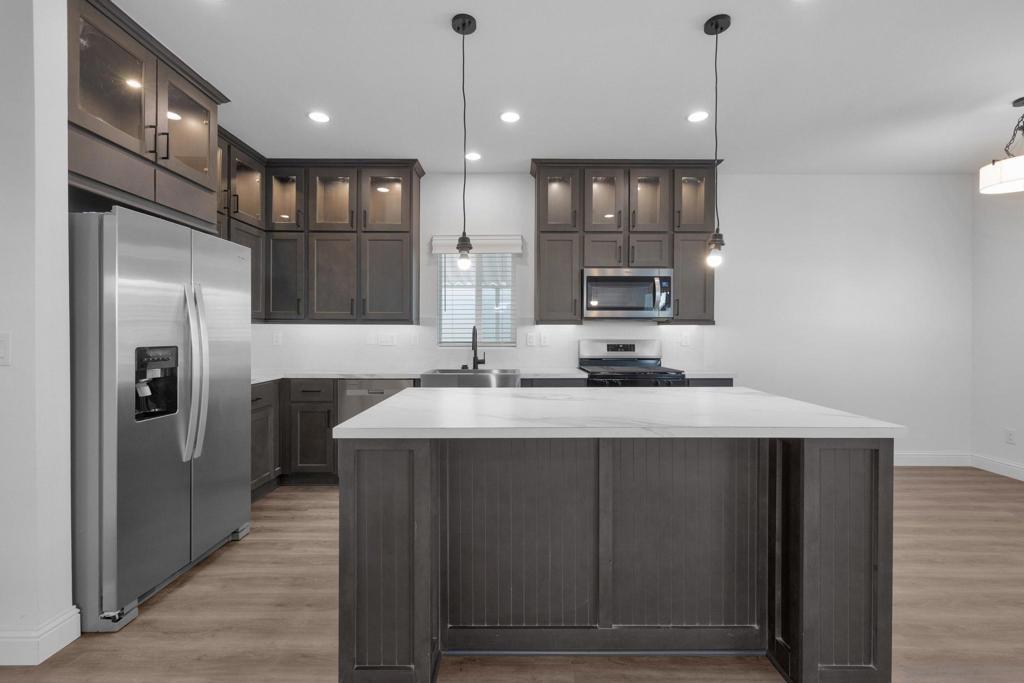 This neutral toned home sits in a cul-de-sac in a well maintained family park, offering 9' ceilings, custom laminate flooring throughout and upgraded carpeting in bedrooms. The kitchen offers an upgraded package that includes stainless steel: dishwasher, self-cleaning gas range, stainless farm sink, microwave, side-by-side refrigerator w/water & ice dispenser. Kitchen also offers LED recessed lighting, upgraded spring faucet, furniture style island w/pendant lighting, overhead to ceiling w/glass cabinets & lights, plus under cabinet lighting, and full tiled backsplash. Throughout it offers: Upgraded 5-1/4 baseboard molding, soft close cabinet doors, 6 panel interior doors w/lever handles, & black hardware. Ceiling fans/lights in all bedrooms and living room. Primary bathroom offers 60" tiled shower w/barn style shower door; guest bath offers shower/tub combo, both offer elongated toilets, upgraded vanity lights, & beveled medicine cabinets. Laundry room offers ample cabinet & counter space. Upgraded Sedona front door, upgraded shingles, lap siding, central heating and A/C. Matching shed & porch to relax on and watch the kids play in the cul-de-sac.