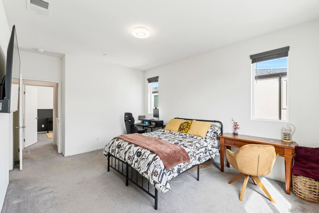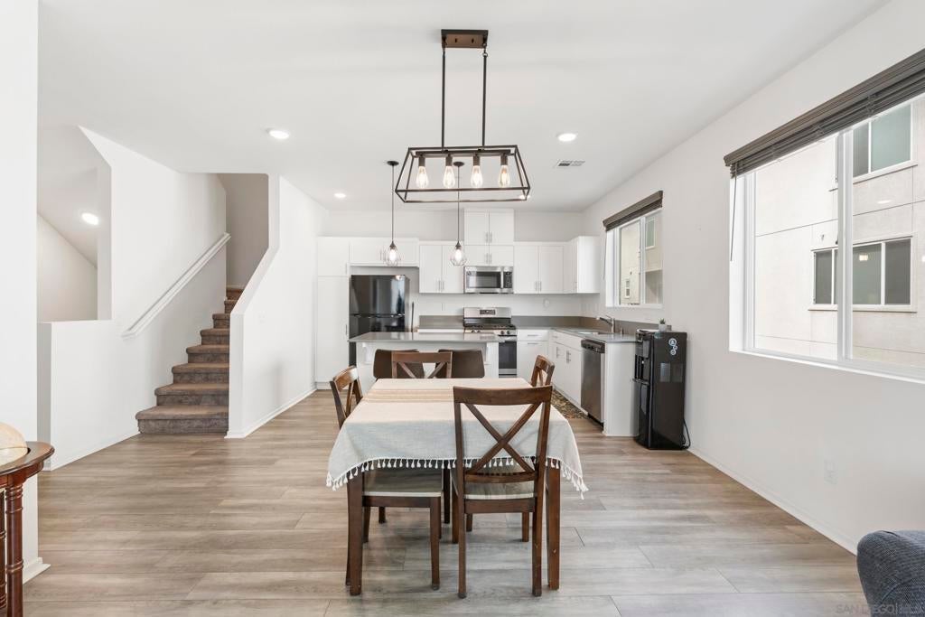 Step into this bright, beautifully updated 1,321 sq ft townhome and feel instantly at home. Featuring an open-concept design, high ceilings, and abundant natural light, this modern three-story condo offers the perfect blend of style and everyday comfort. The spacious living room flows seamlessly into the dining area and open kitchen. Built in 2021, the home has a clean, contemporary feel throughout. The kitchen is equipped with stainless-steel appliances—including a gas range and built-in microwave—along with a generous pantry and a large breakfast bar, making meal prep easy and enjoyable. A sliding glass door opens to your private balcony, perfect for relaxing with a view of the community grounds. Upstairs, you’ll find two generously sized bedrooms, each with its own bathroom, plus a full-size stacked washer and dryer for convenience. Additional highlights include an attached two-car garage with built-in storage shelving and epoxy flooring, fresh neutral paint, wood-look flooring throughout, and contemporary lighting. The home is move-in ready with recent updates and low-maintenance living. Located in a highly convenient spot, you’re just minutes from the 905 and 805 freeways, making commuting effortless. Community Amenities: The community features a full-sized pool, grilling area, jacuzzi, and a park for kids and dogs. - Smart Home Features: The home includes apps to control the garage, kitchen lights, and HVAC system. The electric water heater can also be controlled remotely with the press of a button.