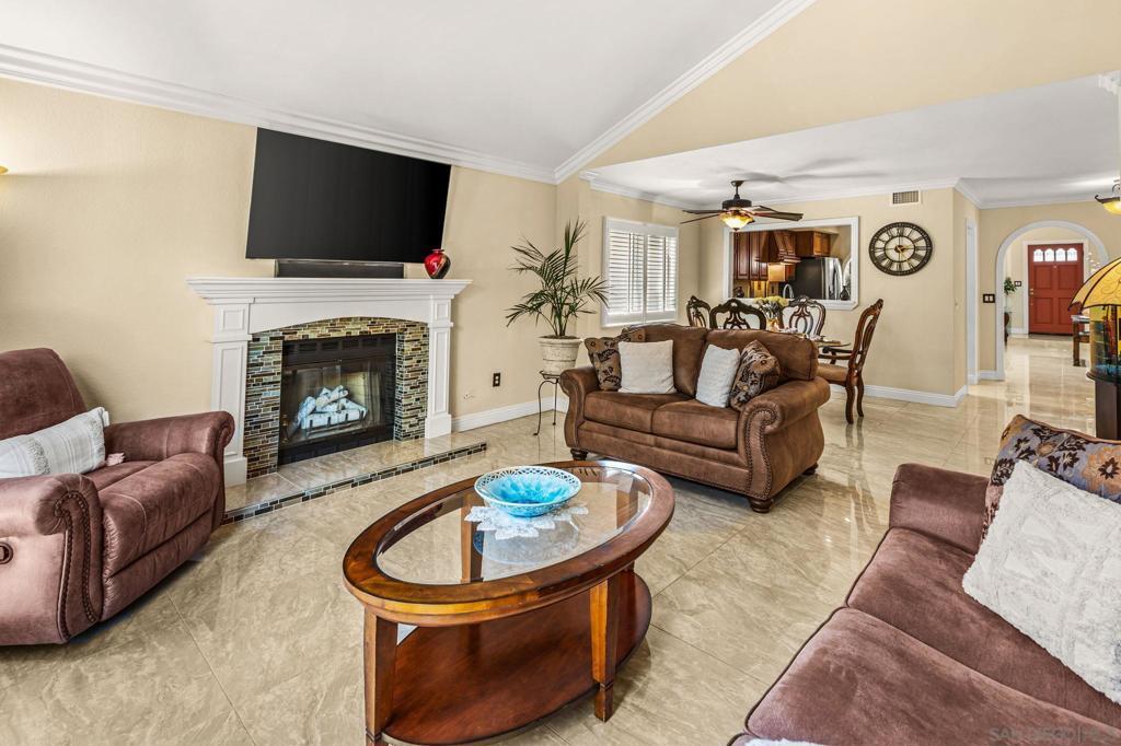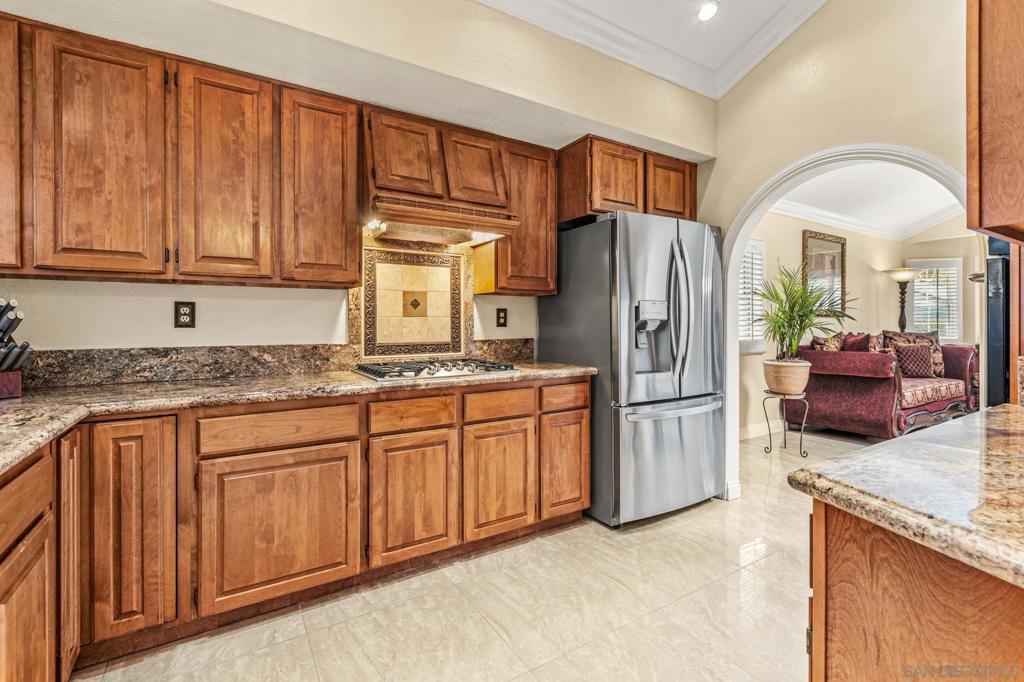 This beautifully maintained single-level home offers comfort, privacy, and timeless upgrades throughout—with no HOA and no Mello-Roos. Featuring a new roof (2023) and an attached 2-car garage, the home is ideally positioned with no neighbors directly behind—providing added tranquility. Inside, vaulted ceilings, crown molding, and plantation shutters create an elegant yet inviting atmosphere, while durable flooring flows seamlessly through the main living areas. The formal living room welcomes you in, leading to a beautifully appointed kitchen complete with granite countertops, stainless steel appliances, and ample cabinetry. The adjacent family room with a cozy fireplace is perfect for relaxing or entertaining. The spacious primary suite is a true retreat, featuring vaulted ceilings, a private patio, generous closet space, and an en-suite bath. Step outside to a low-maintenance backyard with direct access to the greenspace behind—ideal for enjoying outdoor living with added privacy. The backyard also features a built-in BBQ island with an outdoor-rated refrigerator and a charming fountain, creating a peaceful setting perfect for entertaining and relaxation. Conveniently located near shopping, dining, schools, parks, and with easy access to the I-15, this home offers the perfect blend of comfort and convenience.