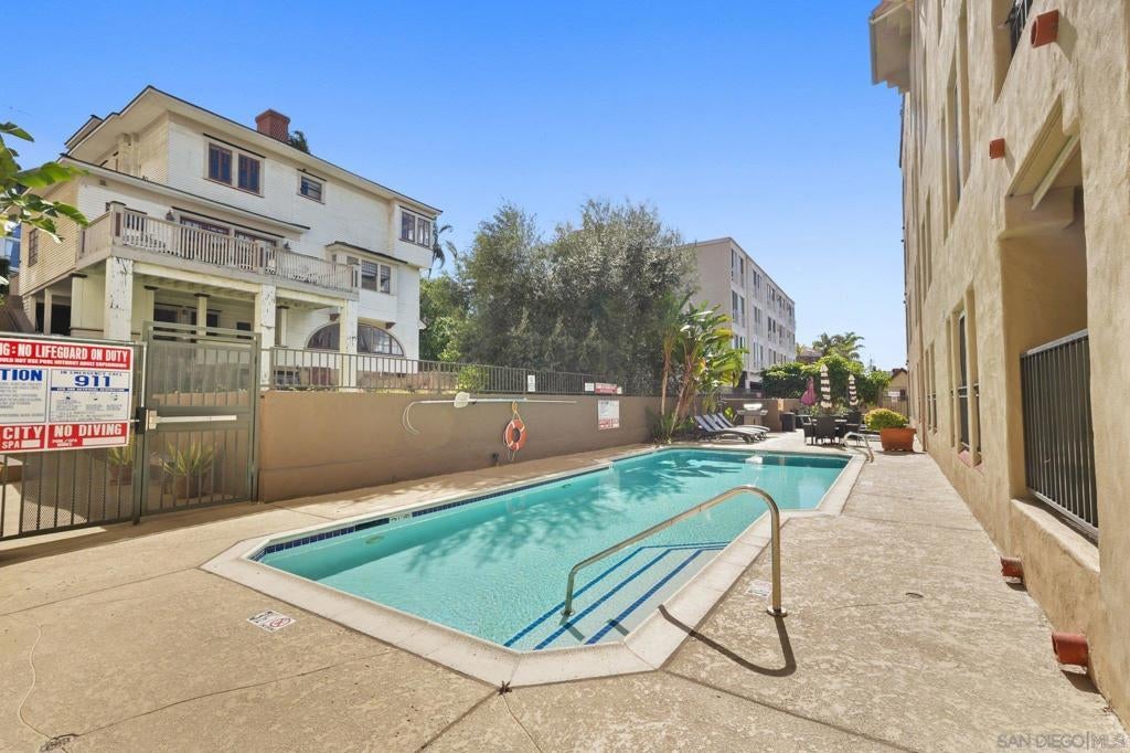 Large, centrally located 1-bedroom, ground-level home w/ TWO parking spots & in-unit washer/dryer! Designed with a breezy coastal feel, this appealing home at Villa Portofino in the heart of Bankers Hill includes high ceilings and thoughtful upgrades throughout. The open kitchen shines with granite counters, refinished cabinetry, tray ceiling, and a double oven with microwave, perfect for home chefs. Recessed, dimmable LED lighting, Hunter ceiling fans, crown molding, and a custom fireplace mantle add warmth and character, while double-pane windows and custom patio sliders with pool view enhance comfort and efficiency. This is a gated building. The spa-inspired bath features a jetted Jacuzzi tub and rain showerhead, plus a Washlet bidet toilet. The spacious bedroom offers a generous closet, and the in-unit, full-size washer and dryer provide maximum convenience. Modern touches such as custom shades and blinds, pull-down patio shade, and automatic laundry and closet lighting elevate everyday living. From your private patio, enjoy direct, no-step access to the pool, spa, BBQ area, and outdoor lounge. This upscale community is gated throughout and includes a well-equipped gym facility. Two deeded parking spaces—a rare perk for a one-bedroom—add exceptional value. Walk to Balboa Park and Little Italy’s exceptional dining, and reach downtown, Hillcrest, and the airport in minutes. This is effortless urban living with resort-style perks right outside your door. Your next chapter starts here! Furniture can convey.
