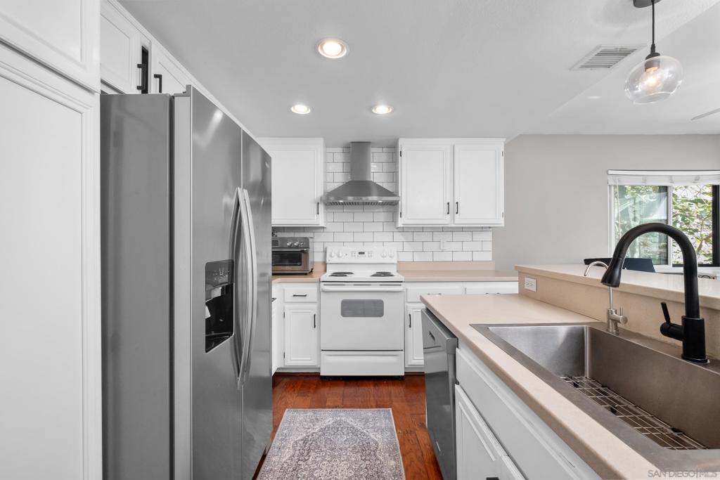 Welcome to this stunning upper end-unit condo in the highly desirable Bernardo Pines community! This light-filled 2 bed / 2 bath home features soaring vaulted ceilings in the family room, creating a spacious and airy atmosphere.The beautifully updated kitchen showcases crisp white cabinetry, stainless steel appliances, a modern range hood, subway tile backsplash, recessed lighting, and stylish pendant lights over the bar top. Additional highlights include laminate flooring throughout, a convenient full-size laundry closet, and abundant natural light. Perfectly located near freeways, shopping, dining, and recreation, this home offers the ideal blend of comfort and convenience.