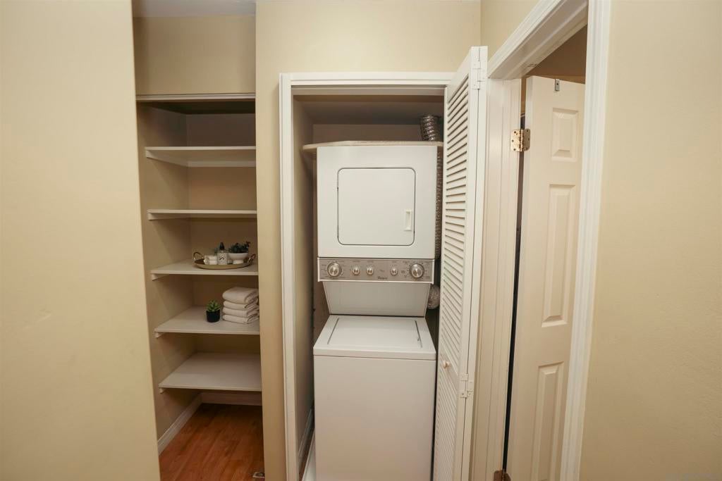Looking for your next investment or a great starter home? This 2 bed/2 bath condo conveniently located within walking distance to SDSU & easy freeway access, could be the place for you! Move-in ready with all you need, including assigned gated parking and in-unit washer/dryer. Enjoy a nice open floorplan and spacious bedrooms. Bedrooms on are on opposit sides, with great closet space and the primary bedroom has a walk-in closet. On nicer days there is a Juliette balcony with French doors for a breeze or cool off in the community pool and spa.