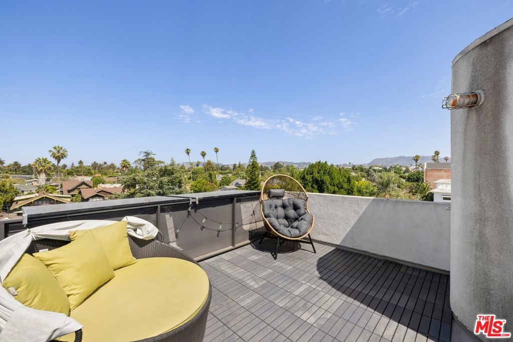 This 1,240 sq.ft. front unit at Gramercy Row in Hancock Park offers privacy, natural light, and thoughtful modern design by AIA-awarded firm Assembledge+. The layout includes an open ground floor with high ceilings, polished concrete floors, smart blinds, smoked glass details, living and dining areas, kitchen with Caesarstone counters and backsplash, LED lighting, updated stainless steel appliances, and a powder room. The second level features bamboo floors, a flexible-use room, full bath, in-unit LG washer/dryer, and storage. The top-floor primary suite includes more bamboo floors, a custom closet, smart blinds, and a skylit bathroom with double sinks, floating vanity, under-cabinet lighting, and a smoked glass divider. A spiral staircase leads to a private rooftop deck with unobstructed 360-degree views from Downtown to the Hollywood Sign. Additional features include a Nest thermostat, Hue smart lighting, Nest smoke detectors, and frosted glass for added privacy. Two tandem parking spaces, guest parking, and elevator access complete the offering. Located near Larchmont Village with easy access to Hollywood and Downtown.