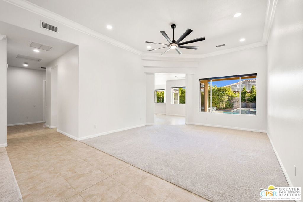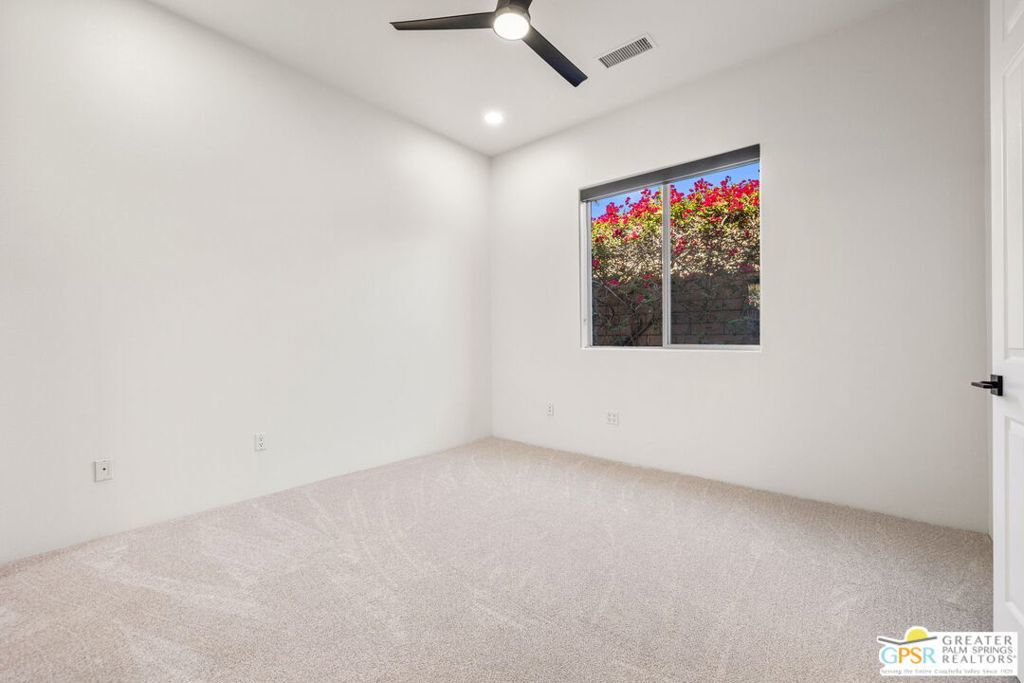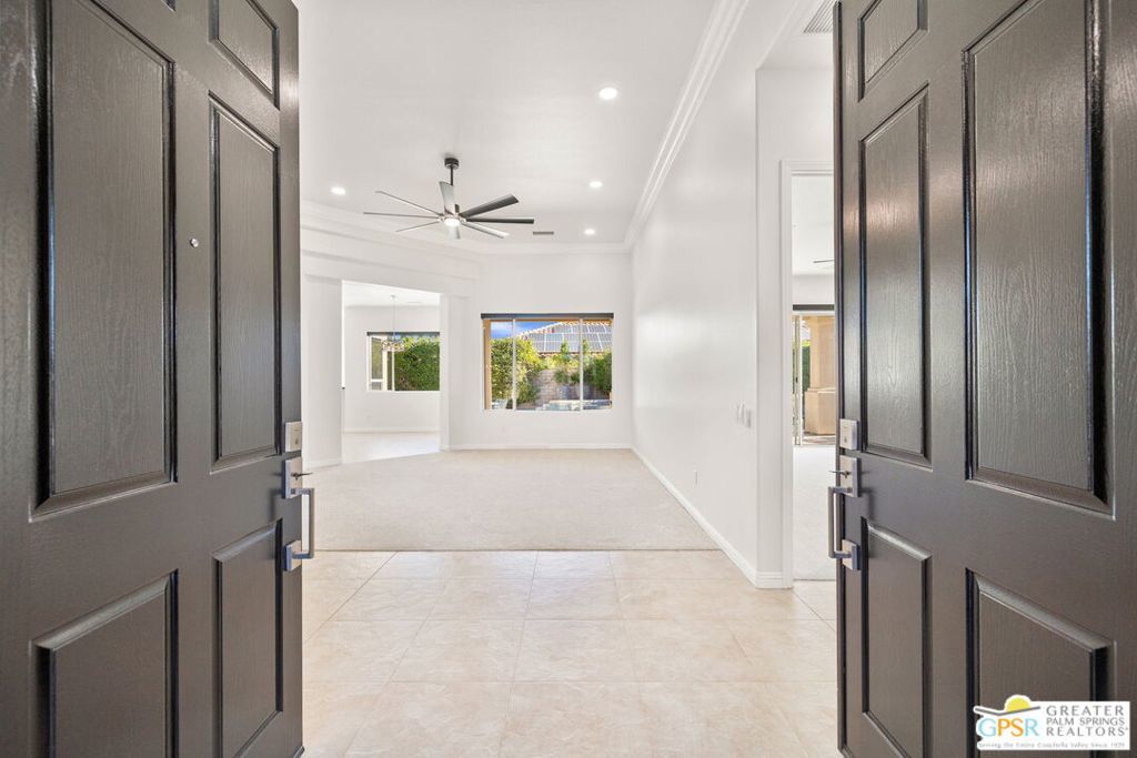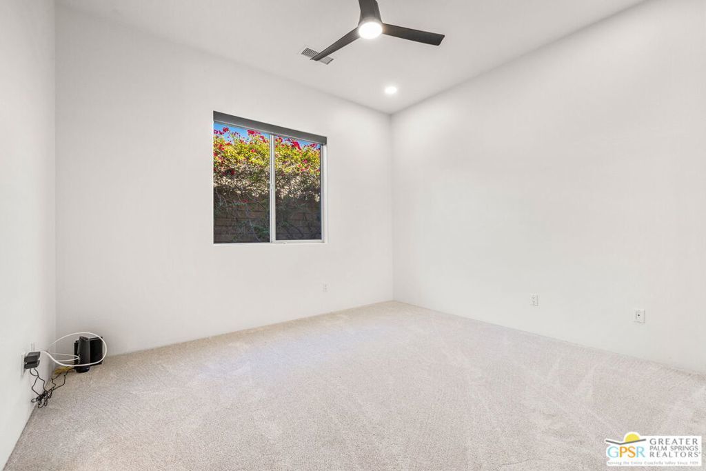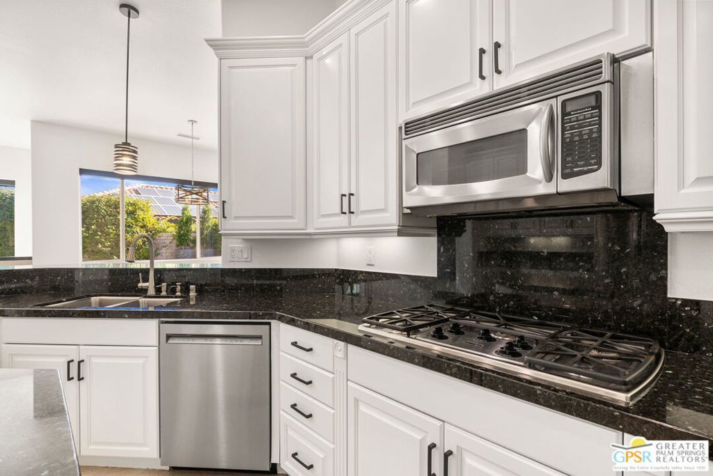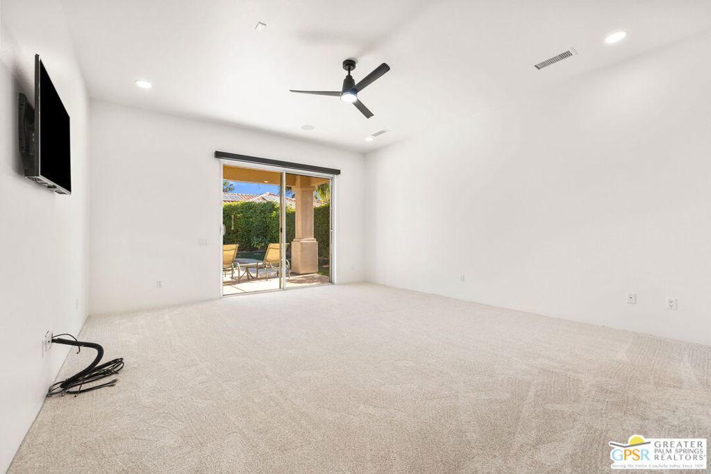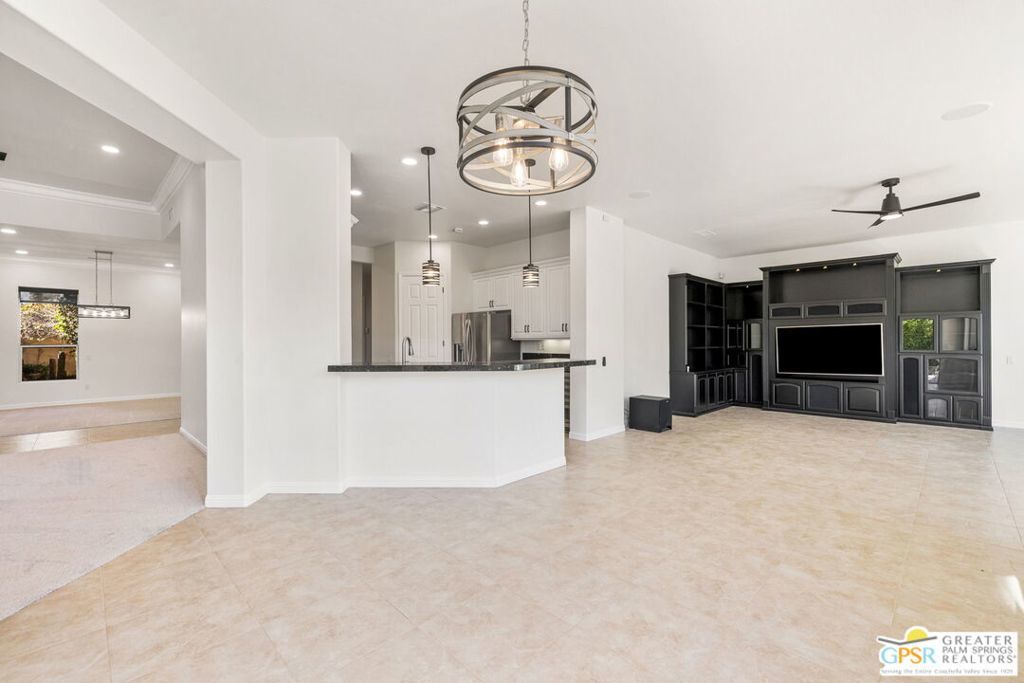 Seeking a responsible long-term tenant to call this exceptional home their own. This beautifully refreshed 4-bedroom, 3.5-bathroom residence offers over 3,063 square feet of bright, open living space, ideal for those ready to settle into relaxed Coachella Valley living, host gatherings with ease, or accommodate multi-generational family needs in unfurnished comfort.Step inside to soaring ceilings and abundant natural light that instantly welcome you home. Elegant living and dining areas flow seamlessly into the gourmet kitchen and include a cozy fireplace with built-in entertainment center. The chef-friendly kitchen boasts sleek black granite counters, crisp white cabinetry, a spacious center island with seating, stainless steel appliances (double ovens and gas cooktop), and generous storage to support your daily routines.The luxurious primary suite provides a peaceful retreat with direct backyard access, a spa-inspired bathroom featuring dual vanities, a soaking tub, a separate shower, and an expansive walk-in closet. Three additional well-appointed guest bedrooms ensure plenty of flexibility, highlighted by a highly desirable attached casita with its own private entrance and full en-suite bath perfect for long-term guests, family members, or a dedicated home office.Practical features include a convenient indoor laundry room with sink and storage, ceiling fans throughout for year-round comfort, durable tile flooring in main living areas, and fully owned solar panels that deliver outstanding energy efficiency and noticeably lower utility bills.Your private backyard oasis completes the package: a sparkling pebble-tec pool with raised spa and cascading waterfall, built-in outdoor BBQ bar ideal for relaxed al fresco meals, covered patio with ceiling fan, lush privacy hedging, low-maintenance landscaping, and stunning mountain views.All this is nestled within the secure, tranquil guard-gated Montecito community, just minutes from world-class golf, El Paseo's renowned shopping and dining, premier hiking and tennis, and the lively scenes of Palm Springs, Rancho Mirage, and La Quinta.This unfurnished home is ready for immediate move-in and available exclusively for a long-term lease (minimum one year). If you are a qualified tenant seeking stability, space, and desert resort-style living, this rare opportunity is for you. Schedule your private tour today!