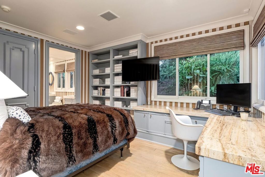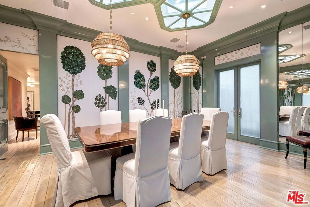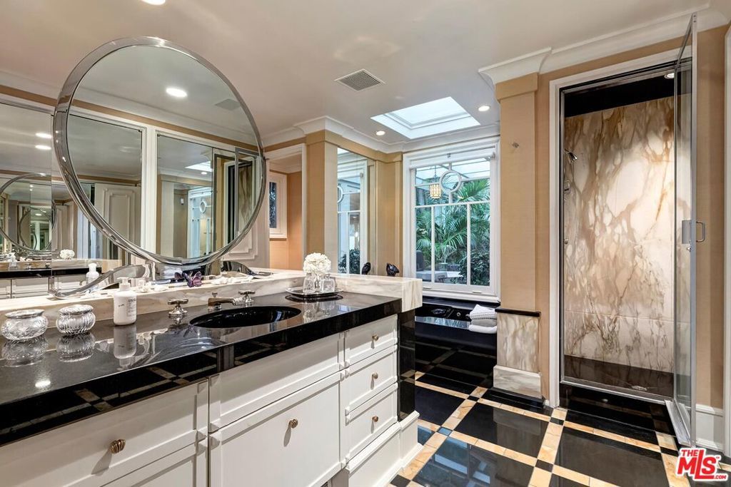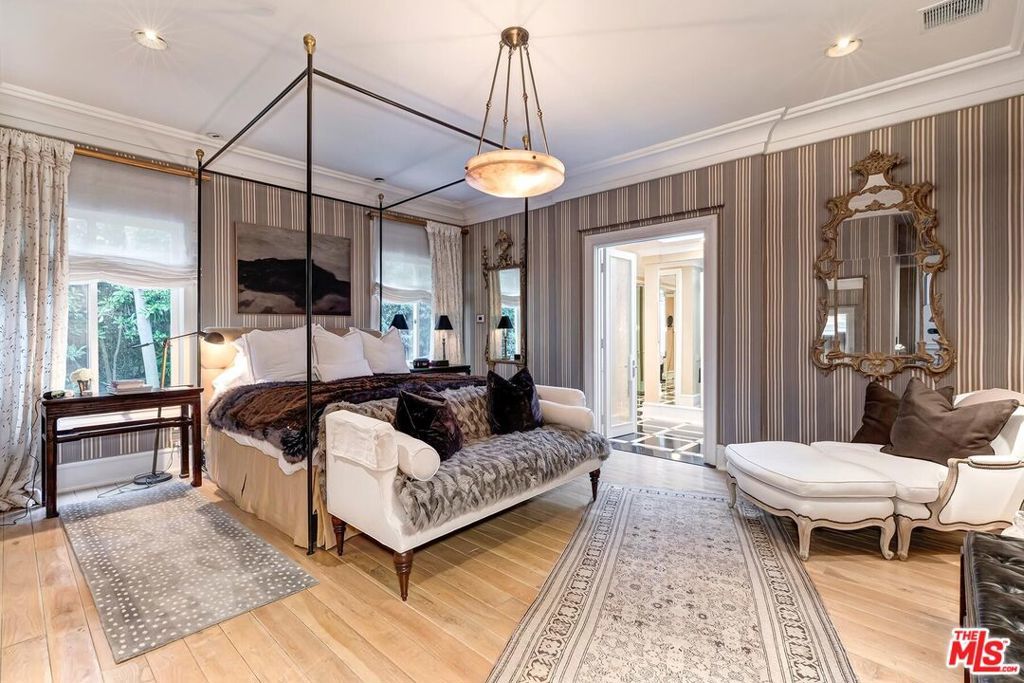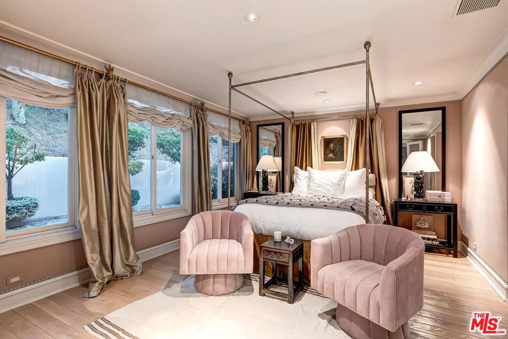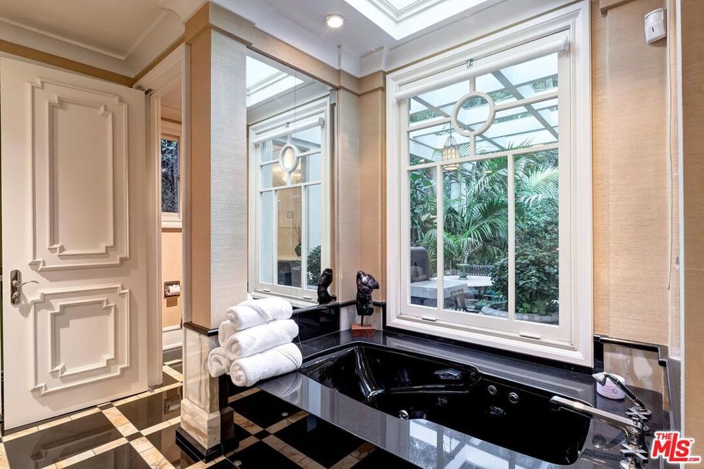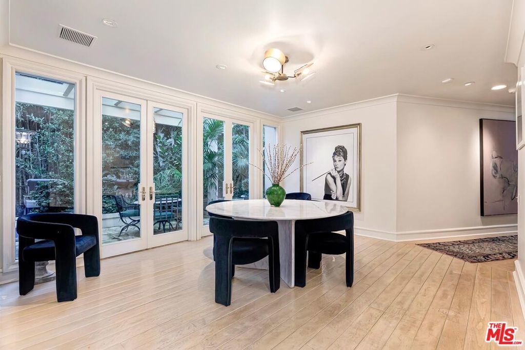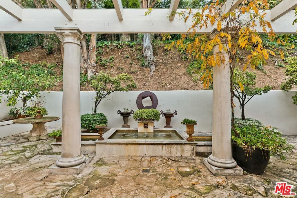 Light-filled architectural residence in a private Beverly Hills setting, originally redesigned by Hendrix-Allardyce and featured in Architectural Digest. Recent upgrades include new landscaping, remodeled showers, new skylights, and an upgraded HVAC system. A spacious foyer leads to the sunlit living room with French doors opening to the pool, terraces, and lush greenery. The library with wet bar sits adjacent.The skylit formal dining room opens to the chef's kitchen with custom stone counters, a large island, and premium appliances including Miele, Trauslen, Viking, and Sub-Zero. A morning room overlooks a secluded terrace. The fourth ensuite bedroom, currently well suited as a gym, is positioned near the laundry, storage, and attached two-car garage.In a private wing, two additional ensuites overlook a terrace with koi pond and fountain. The primary suite offers dual custom closets, a bath designed for two, and a garden-view sunken tub. A rare blend of architectural pedigree, privacy, and thoughtful updates.
