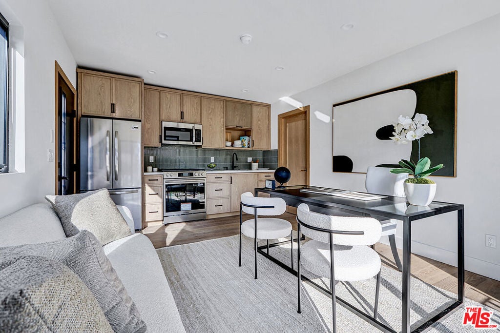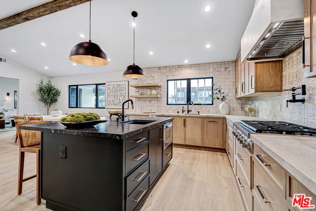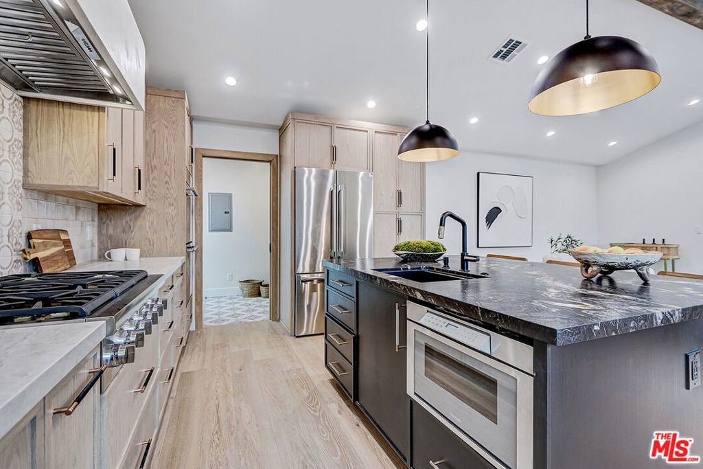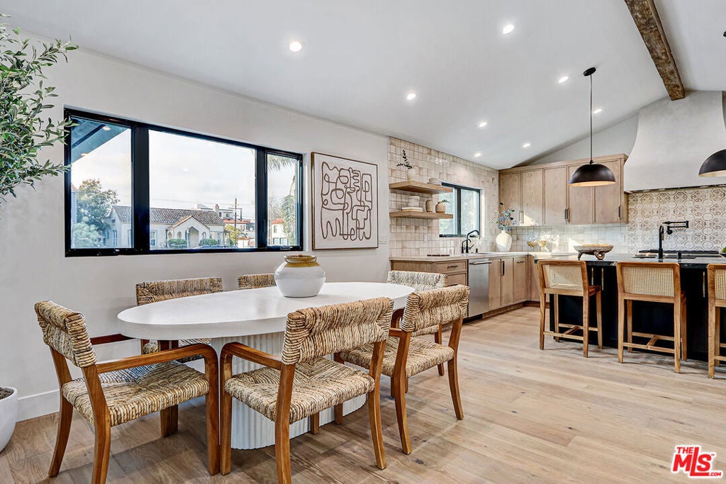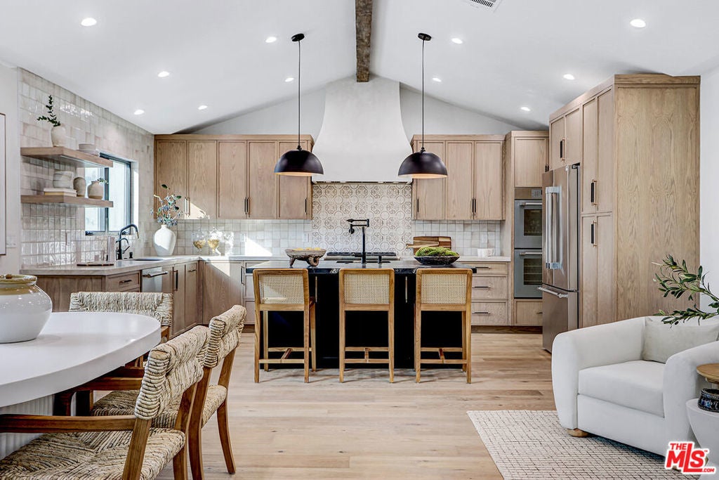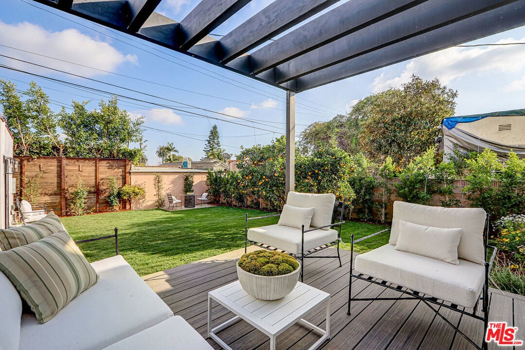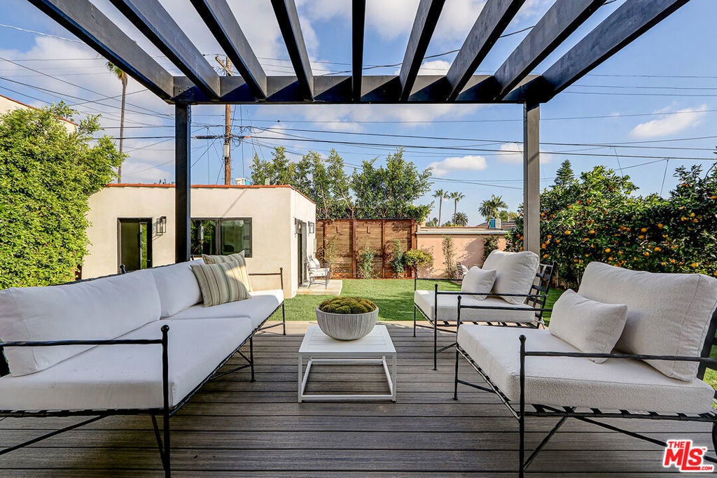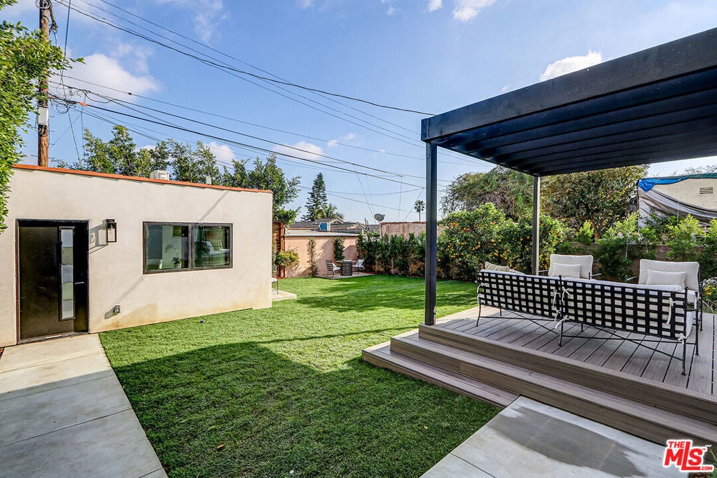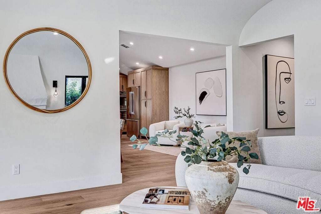 Extensively reimagined single-family residence with detached ADU, offering a flexible layout and cohesive design throughout. The home blends the feel of new construction with the character of an established neighborhood, featuring updated systems and refined finishes that create an easy transition for its next owner.A welcoming living room with fireplace opens into the main living areas, while a front enclosed patio adds additional usable space. Interior finishes include wood floors throughout, Milgard windows, pre-wiring for speakers, Ring doorbell, and security cameras.The kitchen is designed for everyday use and gathering, with a farmhouse aesthetic, breakfast bar, two sinks, six-burner cooktop with pot filler, farmhouse sink, Thermador double convection ovens with remote diagnostics and voice control, microwave, and Thermador French-door refrigerator.A dedicated laundry room includes a sink, built-in cabinetry, and space for a stackable washer/dryer.The primary suite offers generous proportions, a walk-in closet, an oversized shower with rain head, standalone soaking tub, and double vanity with seated vanity area.Outdoor spaces include rear deck suitable for dining or relaxing, herb garden, orange trees and full grass yard.The detached ADU provides additional flexibility with a custom walk-in closet, sliding doors with side patio access, Frigidaire appliances, and a bathroom with tub/shower combination.Offered as-is.