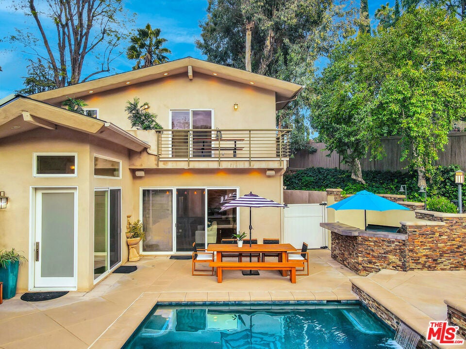 A magical South of the Blvd Encino retreat that feels like a resort the moment you arrive. Tucked in the hillside behind a private gate in one of Encino's beloved neighborhoods, this special home offers a truly unique take on California living, at nearly double the size of many homes on the block with 6 bedrooms, 7 baths, approximately 5,844 sq ft of living space, and an approximately 16,458 sq ft lot. Step through the custom-designed entry gate and you're immediately welcomed into a front-yard pool and spa escape with multiple waterfalls, an outdoor BBQ kitchen setup, a cozy fire pit, dramatic evening ambiance with landscape lighting, and a whole-house sound system that makes every gathering feel effortless. Inside, dramatic floor-to-ceiling windows and oversized glass sliders create an easy indoor-outdoor flow, bathing the home in natural light and letting entertaining move seamlessly from the main living spaces to the patios and yard, while still feeling wonderfully private thanks to the home's perched hillside setting. At the center, an updated cook's kitchen with crisp white cabinetry, center island, stainless steel appliances, and black granite countertops opens to the living room with a warm wood/gas fireplace and the formal dining room for an easy, connected layout. The East wing is designed for real life and flexible living, featuring a breakfast room with built-in desk and display cabinetry, a dedicated laundry room, and two large downstairs ensuite bedrooms with walk-in closets and private patio access. This wing also includes a terrific game room with a wood/gas fireplace, kitchenette, wine fridge, and full refrigerator, plus a billiards table and large flat-screen TV included in the sale. Huge sliders open to the patio and BBQ area, keeping the fun flowing right back out to the pool retreat. Upstairs in the East wing, the main primary suite is a true getaway with soaring ceilings, a wood/gas fireplace, a massive walk-in closet with laundry chute, and a spa-inspired bath with custom tile, a large jetted tub, and a separate steam shower. A spacious upstairs family room offers flexible living space, and a large storage closet is already pre-plumbed and wired if an additional full bathroom is desired. A standout feature of this home is the balance it offers between energy and serenity. While the front-yard pool retreat is the social hub, the living room, dining room, breakfast nook, and the downstairs primary suite open to a grassy backyard with multiple private patio areas that feel wonderfully private throughout most living spaces and outdoor areas. Enjoy morning coffee, soak up the sun, or host an intimate dinner under the stars away from the pool scene. The West wing creates a separate guest and family zone with three additional ground-floor bedrooms, including a true first-floor second primary ensuite with no-stairs convenience. This suite includes a kitchenette, a walk-in closet, and extensive built-in storage. The hallway offers even more storage and leads to a playroom/library and two additional bedrooms, one currently set up as a gym and another as a cozy guest room with its own backyard patio.Smart upgrades include a whole-house sound system, two tankless water heaters, whole-house vacuum, three 5-ton split HVAC systems, whole-house sprinklers, a pool control system, and roof-mounted solar panels to help heat the pool. A large two-car garage with an extra storage room and EV 220V charging capabilities adds everyday practicality. Encino is loved for its friendly neighbors, upscale dining, award-winning schools, and gorgeous hillside setting, and the hiking routes above the neighborhood near Hayvenhurst and Mulholland offer sweeping views of the entire city out to the ocean. Come home to California living at its best!