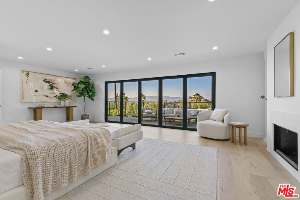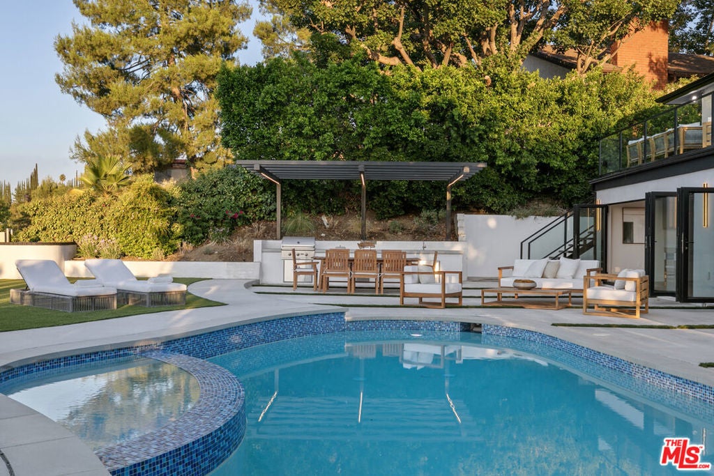 This beautifully updated home set on a spacious 17,487 sq. ft. lot, offers modern luxury, privacy, and panoramic views throughout. Located in the sought-after Lake Encino community, the residence welcomes you with lush landscaping, palm trees, and custom architectural lighting. Inside, a grand 17-ft foyer with hardwood floors and a glass-panel staircase leads to open-concept living spaces filled with natural light. This home includes 6 bedrooms, 4 bathrooms, custom executive office and much more. Doors open to a beautiful backyard featuring a custom pool and spa with Baja shelf, outdoor kitchen with Viking BBQ and Coyote appliances, elegant dining space, and low-maintenance, drought-conscious landscaping. The chef's kitchen is equipped with solid wood cabinetry, quartz countertops, Sub-Zero refrigerator and freezer, and premium Viking appliances. The open layout flows into a spacious living and dining area with fireplace and recessed lighting. HOA amenities include private tennis courts. Optional roaming security available via third-party provider.