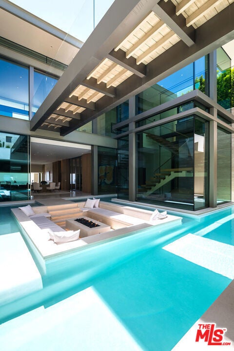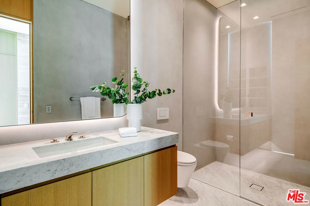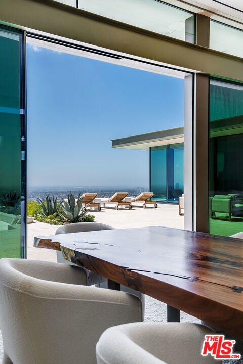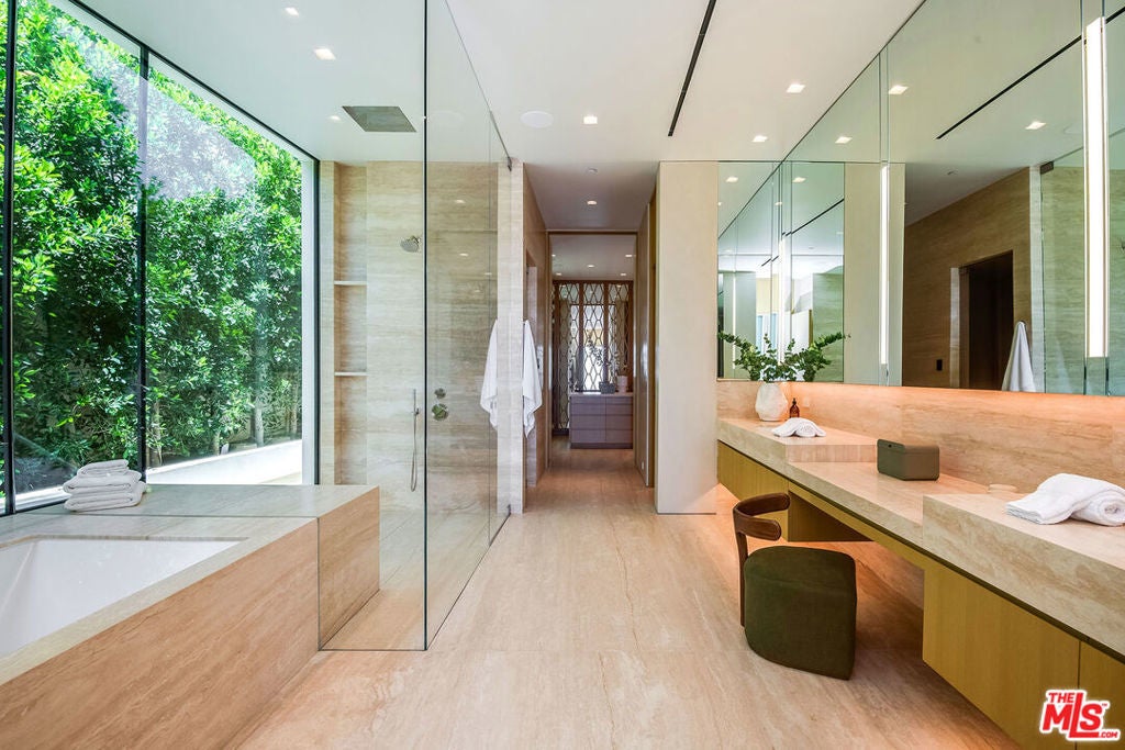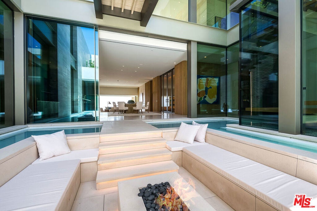 Experience a heightened level of contemporary luxury in this newly constructed estate nestled within the coveted Bird Streets. Crafted with exceptional materials and finishes, this residence defines elevated Los Angeles living, offering sweeping jetliner views from Downtown to the Pacific Ocean. Designed by Paul McClean, built by Dugally Oberfeld, and appointed with interiors by Marmol Radziner, the home presents an unparalleled level of design and amenity. Encompassing approximately 15,200 square feet with five bedrooms and nine baths, the estate provides generous accommodations for entertaining, guests, and staff. A gated drive ensures privacy and security, leading to a subterranean six-car garage. Arrival begins at a serene, walled desert-inspired courtyard, where a bridge extends above the lower-level pool, setting a dramatic tone. Outfitted with advanced smart home technology and expansive automated glass walls, the interiors seamlessly capture the surrounding vistas. The main level features a sophisticated living room with fireplace, formal dining room, two powder rooms, an entertainer's kitchen with eat-in island and breakfast area, and a secondary prep kitchen equipped with Wolf and Sub-Zero appliances. Two guest suites accompany a stunning primary suite complete with panoramic views, custom walk-in closet, and a luxurious marble bath with sauna. Indoor spaces transition effortlessly to an expansive terrace with a sunken fire feature, built-in seating, and a striking zero-edge pool and spa. The lower level, accessed by a floating staircase or elevator, reveals a true entertainment and wellness retreat, including a second pool, fire feature, expansive family room with bar and fireplace, glass wine display, game room, covered patio with spa, theater, gym, and dedicated wellness suite with massage room, shower, and sauna. Additional amenities include two guest suites, a powder room, and laundry. This exceptional hillside sanctuary is moments from Sunset Boulevard and the finest dining, shopping, and nightlife Los Angeles has to offer. Lease available fully furnished. Minimum of 1 year, no short term