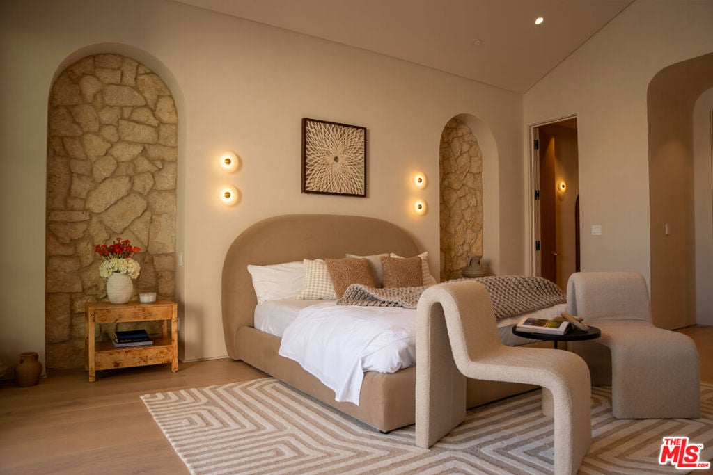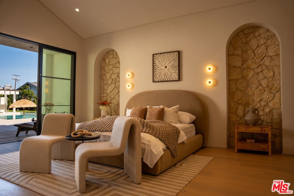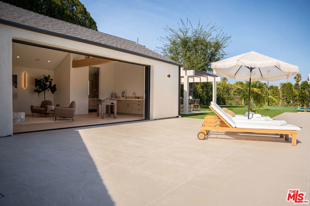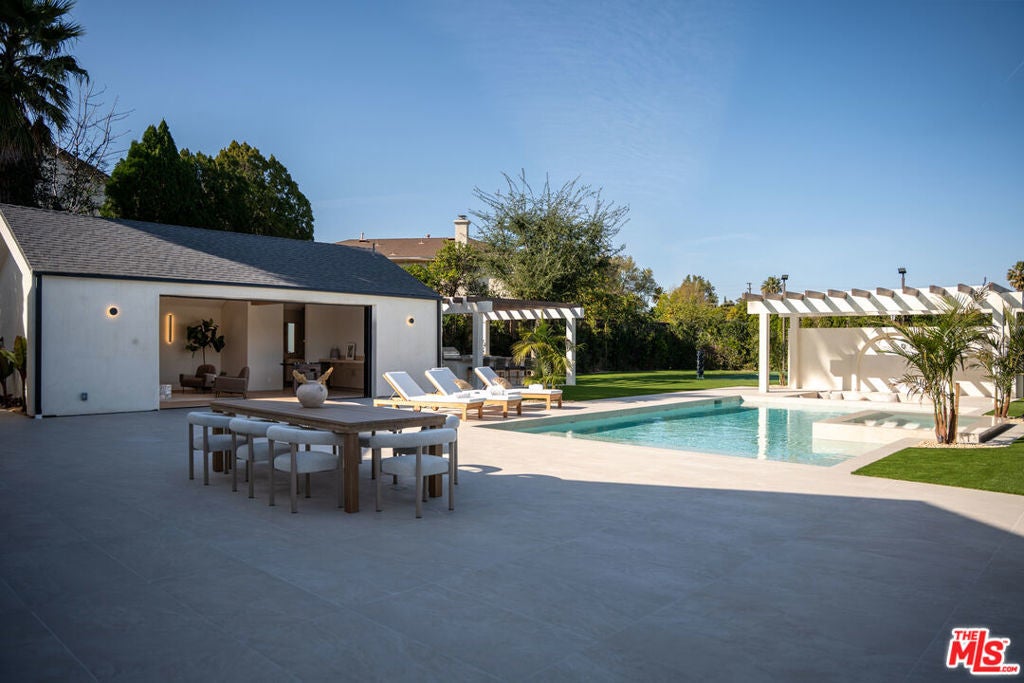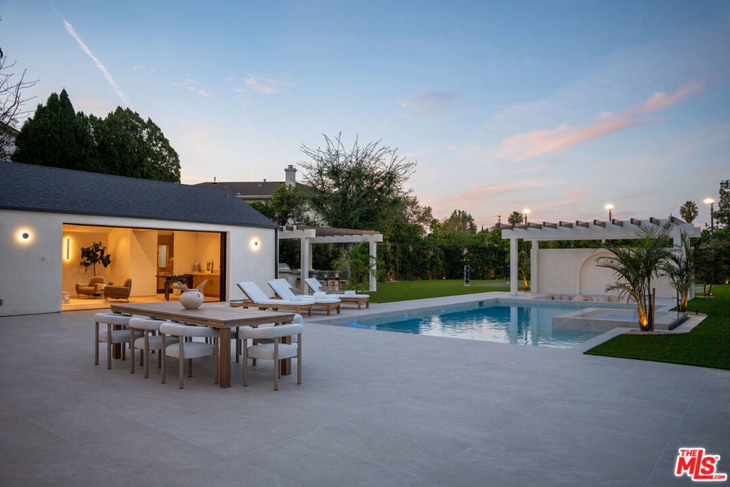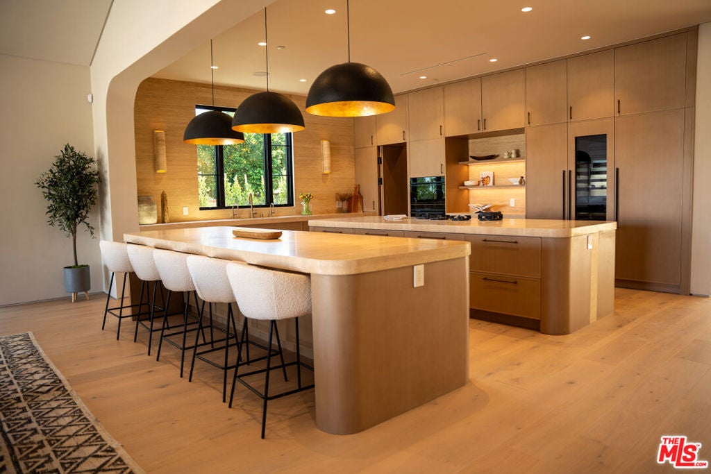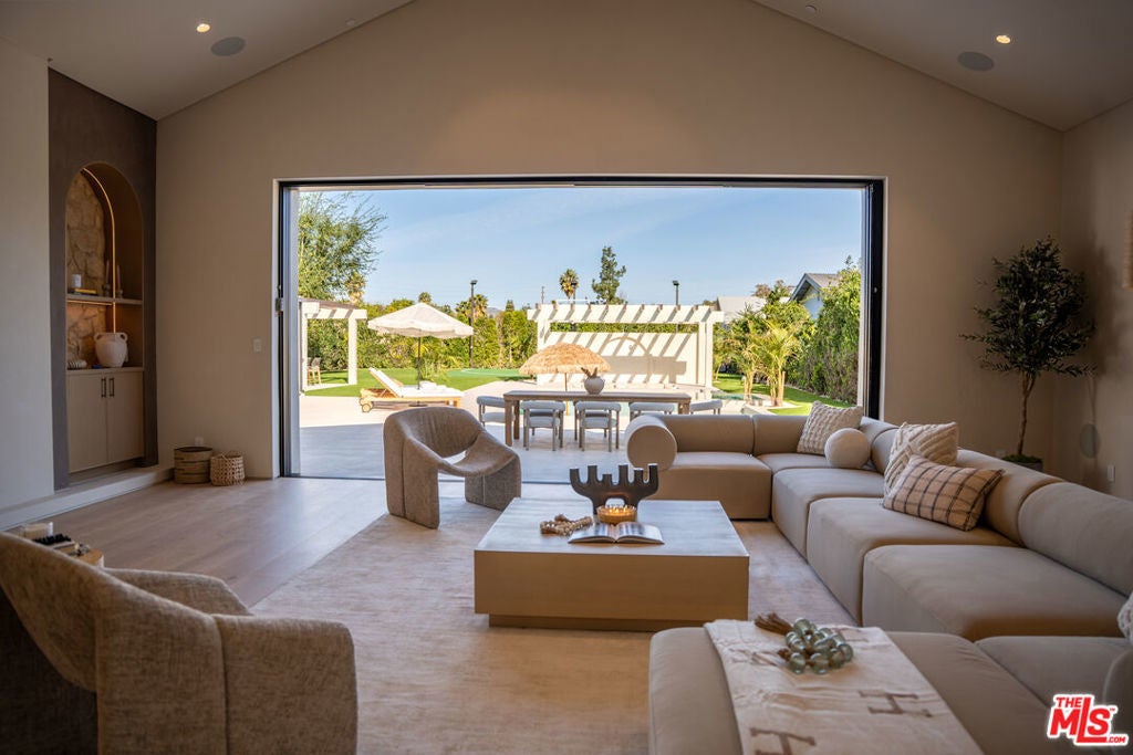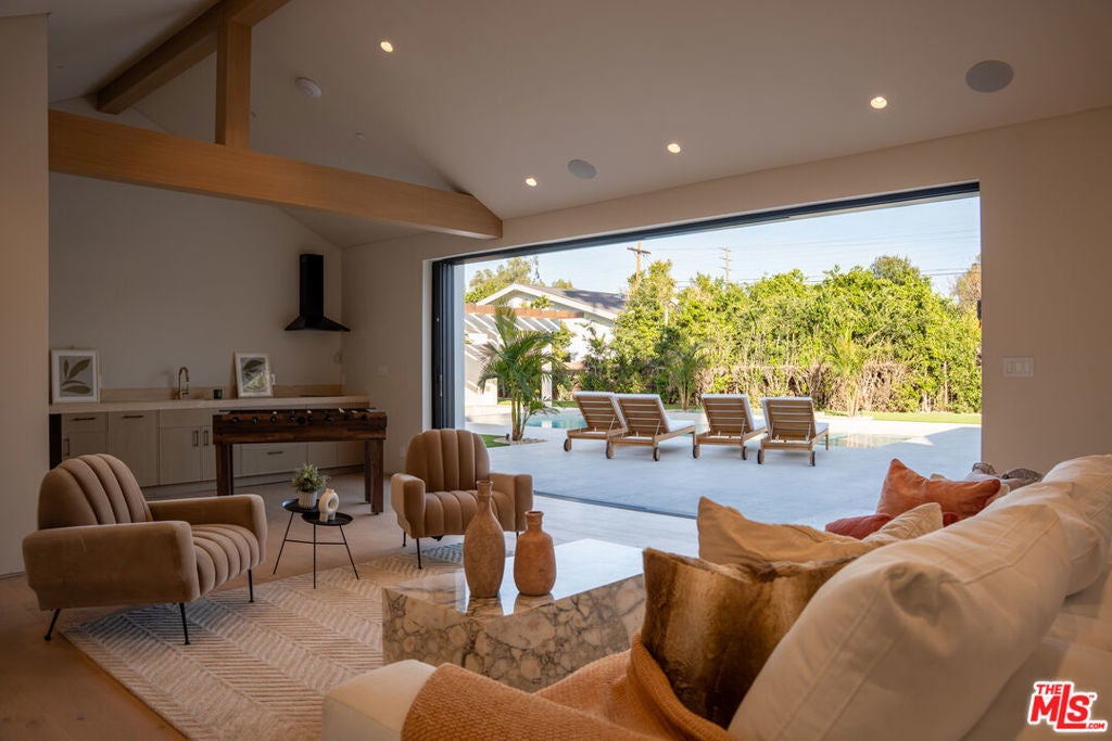 Elevated single-level resort-style residence showcasing warm natural textures and refined modern design. A soft neutral palette, custom millwork, arched architectural details, stone finishes, and wide-plank wood flooring create a cohesive, magazine-worthy aesthetic throughout. The open-concept layout is filled with natural light and highlighted by vaulted ceilings with exposed beams and seamless sightlines to the outdoor living spaces.At the heart of the home is a designer statement kitchen featuring an oversized island with seating, integrated cabinetry, sculptural pendant lighting, and a dramatic stovetop feature wall wrapped in custom stone with a sleek vent hoodcreating a striking focal point that blends form and function.The 4,000 sq. ft. main residence offers four bedrooms and four and a half bathrooms, including a luxurious primary suite designed as a private retreat. The spa-inspired bath is finished with natural stone, soft ambient lighting, and refined fixtures, while dual walk-in closets complete the space. Secondary bedrooms and baths continue the home's calming, elevated design.Situated on an approx. 18,000 sq. ft. lot, the backyard is a true resort-style oasis featuring a sparkling pool and spa with Baja shelf, a sunken conversation fire pit lounge, expansive entertaining patios, a sports court, and a 700 sq. ft. detached guest house with a private bathroomperfect for guests, a home office, or studio. Covered and open-air spaces create multiple zones for relaxing and entertaining, while large sliding glass doors provide seamless indoor-outdoor flow.An exceptional single-level home combining modern design, comfort, and resort-style amenities.