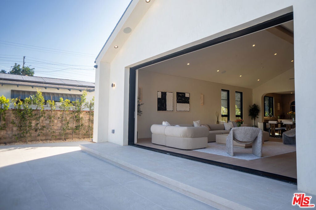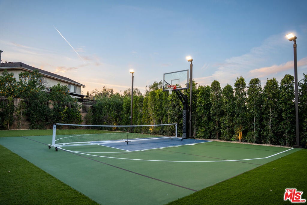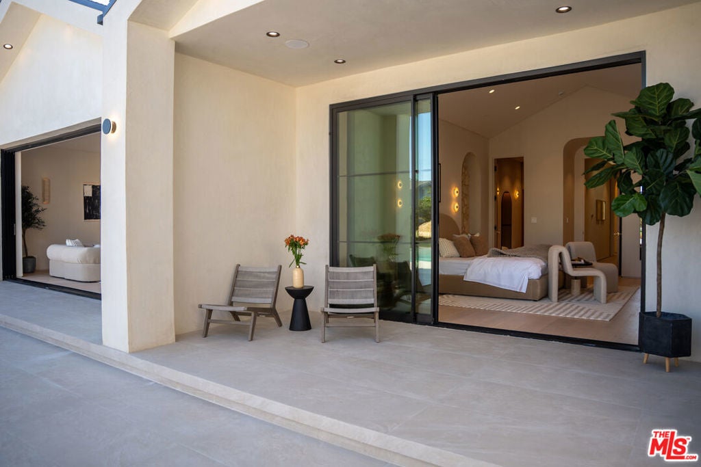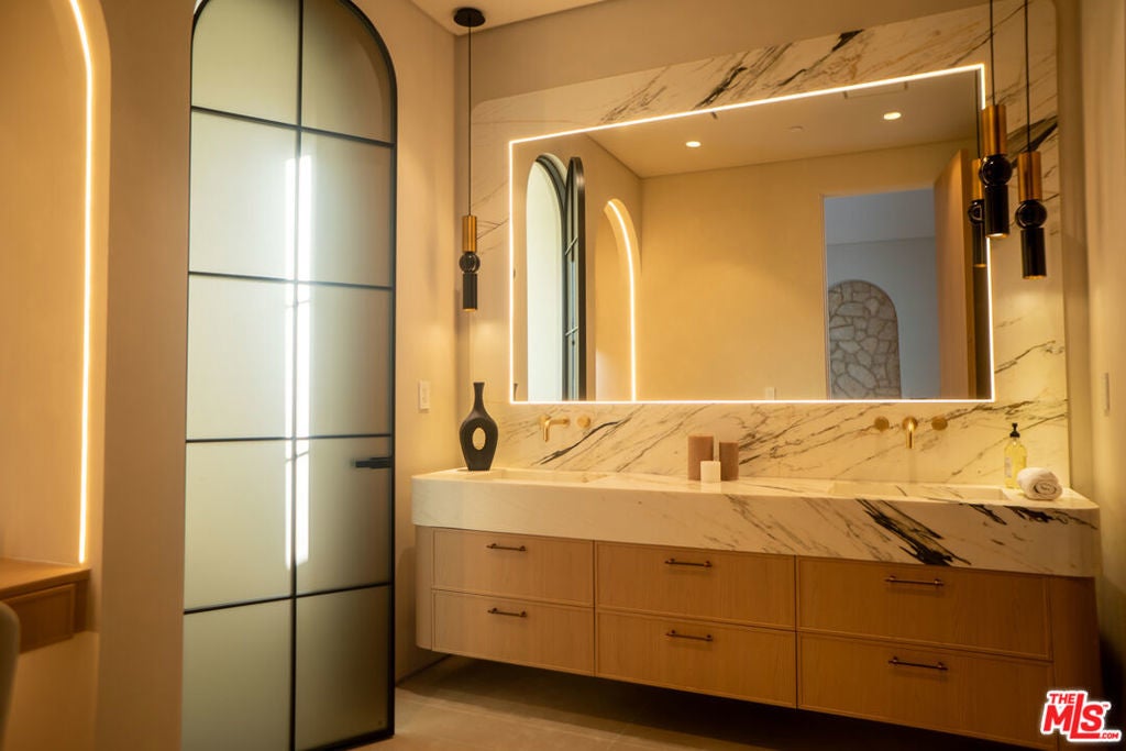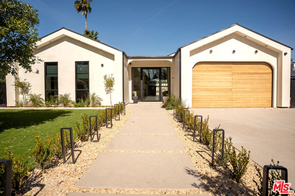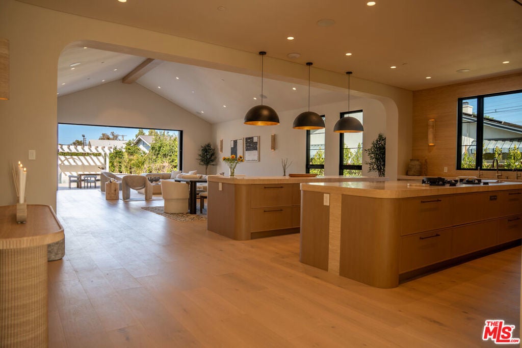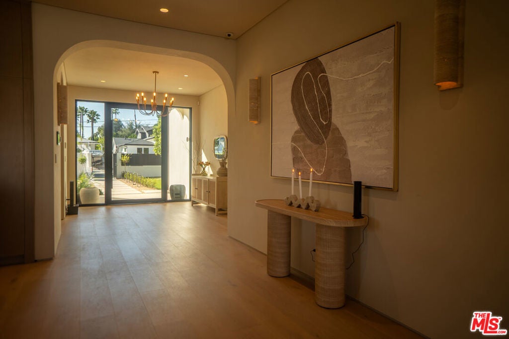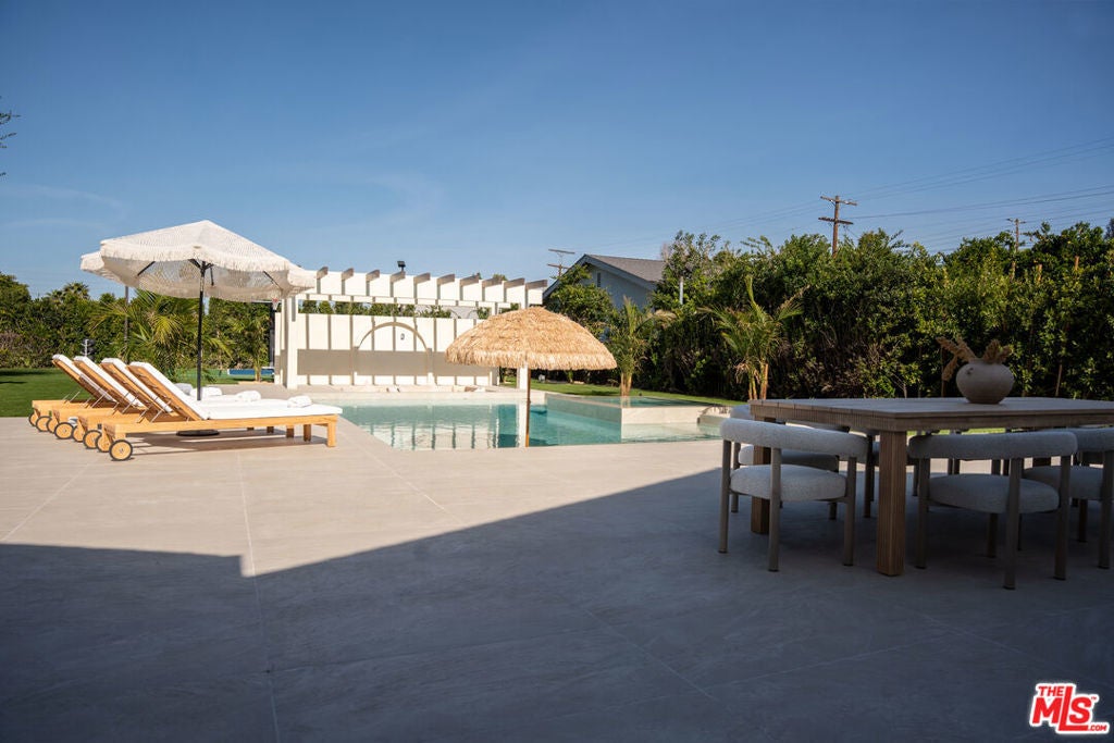 Elevated single-level resort-style residence showcasing warm natural textures and refined modern design. A soft neutral palette, custom millwork, arched architectural details, stone finishes, and wide-plank wood flooring create a cohesive, magazine-worthy aesthetic throughout. The open-concept layout is filled with natural light and highlighted by vaulted ceilings with exposed beams and seamless sightlines to the outdoor living spaces.At the heart of the home is a designer statement kitchen featuring an oversized island with seating, integrated cabinetry, sculptural pendant lighting, and a dramatic stovetop feature wall wrapped in custom stone with a sleek vent hoodcreating a striking focal point that blends form and function.The 4,000 sq. ft. main residence offers four bedrooms and four and a half bathrooms, including a luxurious primary suite designed as a private retreat. The spa-inspired bath is finished with natural stone, soft ambient lighting, and refined fixtures, while dual walk-in closets complete the space. Secondary bedrooms and baths continue the home's calming, elevated design.Situated on an approx. 18,000 sq. ft. lot, the backyard is a true resort-style oasis featuring a sparkling pool and spa with Baja shelf, a sunken conversation fire pit lounge, expansive entertaining patios, a sports court, and a 700 sq. ft. detached guest house with a private bathroomperfect for guests, a home office, or studio. Covered and open-air spaces create multiple zones for relaxing and entertaining, while large sliding glass doors provide seamless indoor-outdoor flow.An exceptional single-level home combining modern design, comfort, and resort-style amenities.