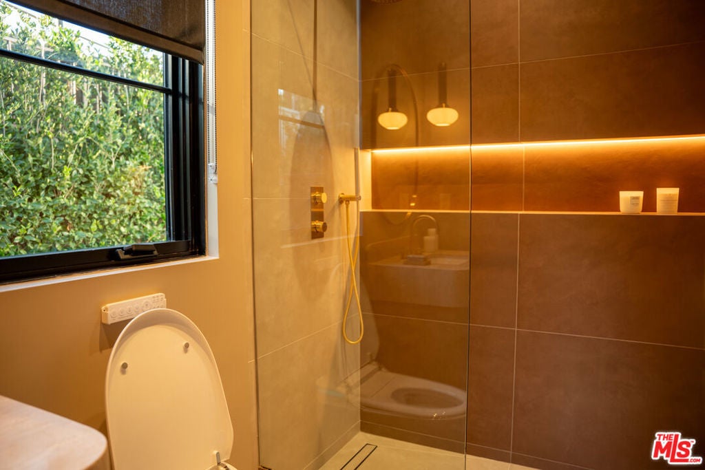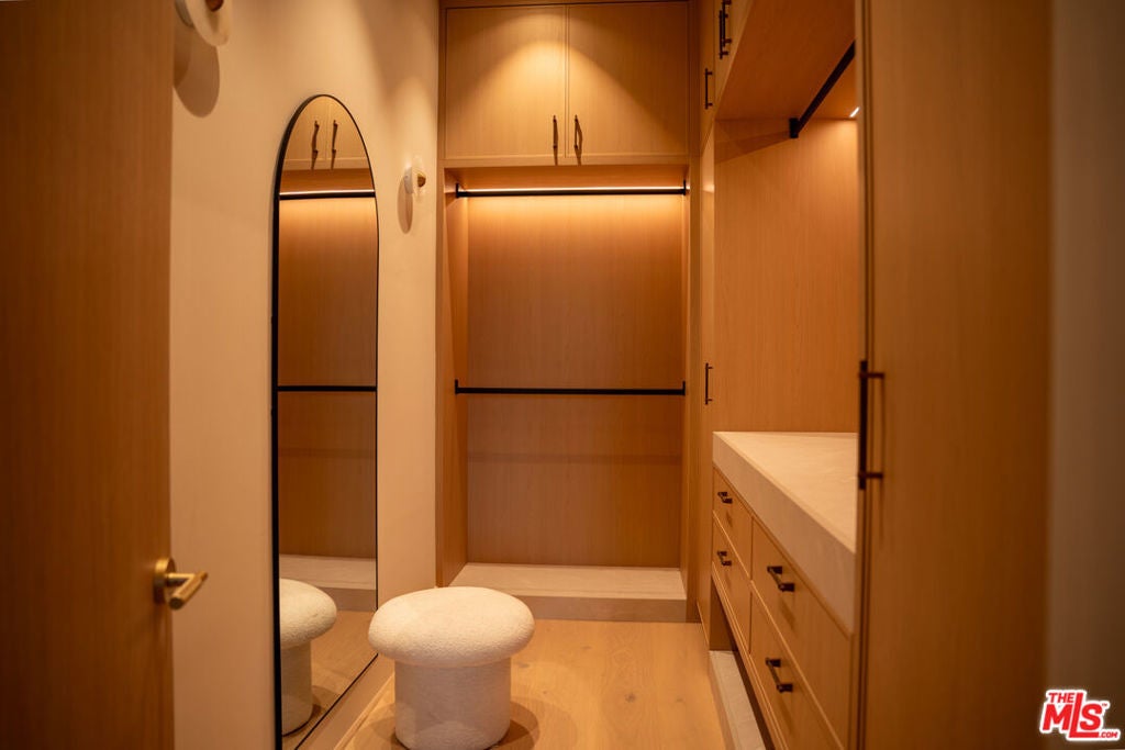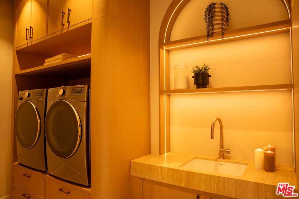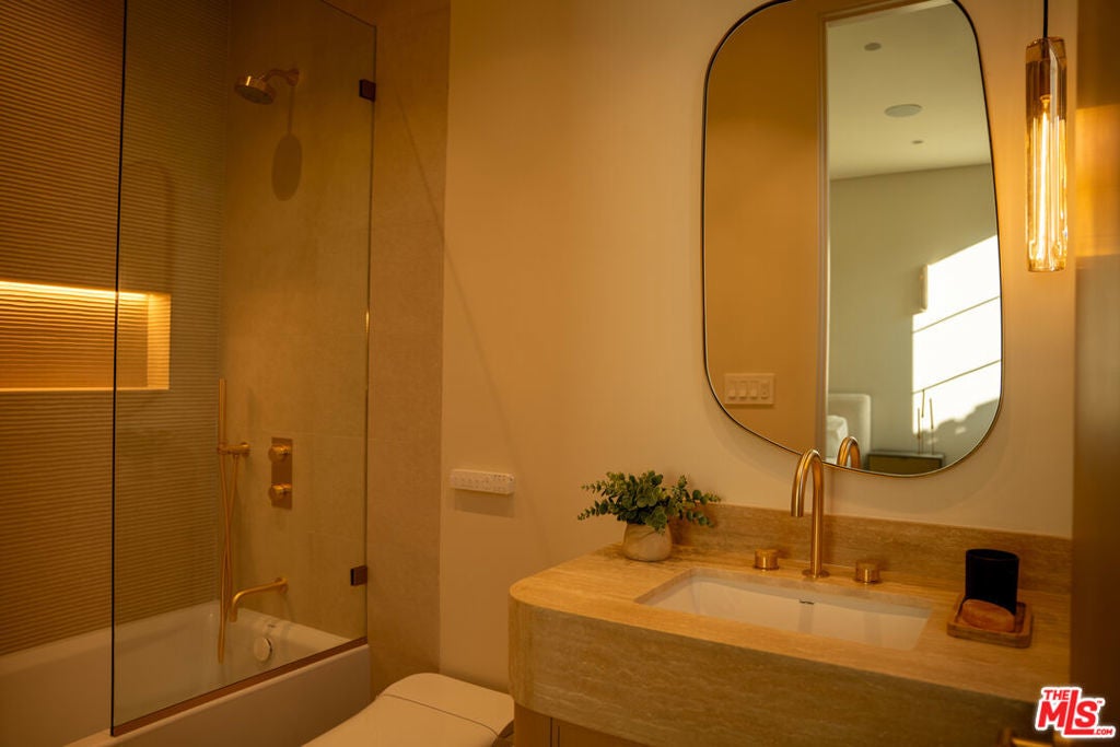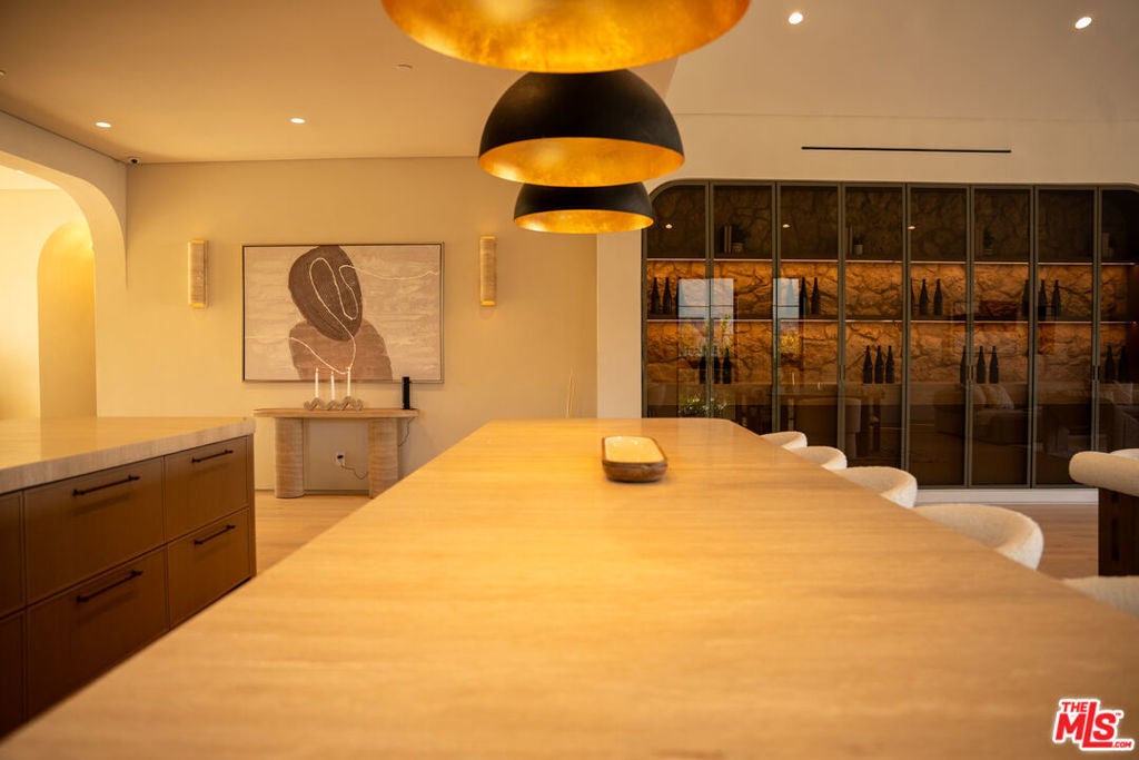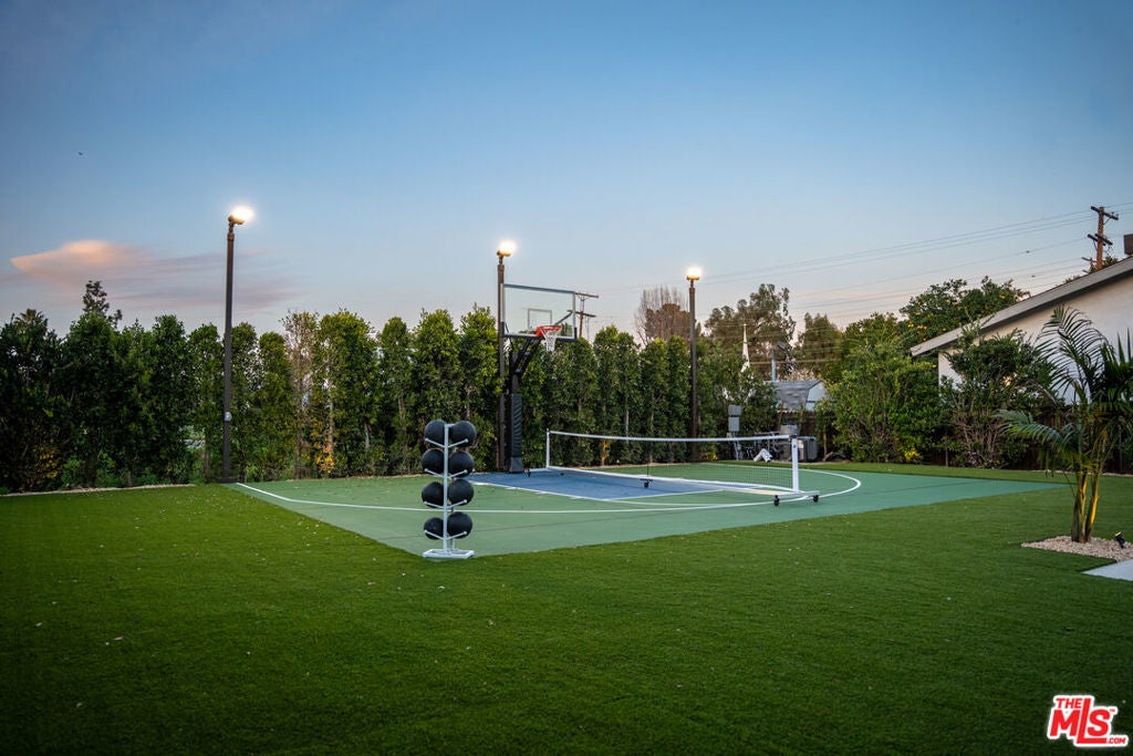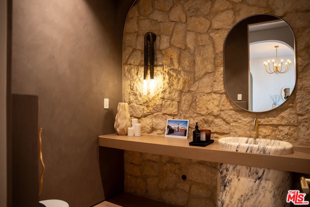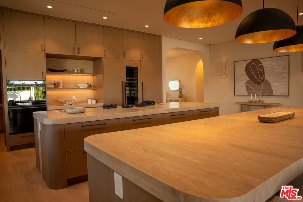 Elevated single-level resort-style residence showcasing warm natural textures and refined modern design. A soft neutral palette, custom millwork, arched architectural details, stone finishes, and wide-plank wood flooring create a cohesive, magazine-worthy aesthetic throughout. The open-concept layout is filled with natural light and highlighted by vaulted ceilings with exposed beams and seamless sightlines to the outdoor living spaces.At the heart of the home is a designer statement kitchen featuring an oversized island with seating, integrated cabinetry, sculptural pendant lighting, and a dramatic stovetop feature wall wrapped in custom stone with a sleek vent hoodcreating a striking focal point that blends form and function.The 4,000 sq. ft. main residence offers four bedrooms and four and a half bathrooms, including a luxurious primary suite designed as a private retreat. The spa-inspired bath is finished with natural stone, soft ambient lighting, and refined fixtures, while dual walk-in closets complete the space. Secondary bedrooms and baths continue the home's calming, elevated design.Situated on an approx. 18,000 sq. ft. lot, the backyard is a true resort-style oasis featuring a sparkling pool and spa with Baja shelf, a sunken conversation fire pit lounge, expansive entertaining patios, a sports court, and a 700 sq. ft. detached guest house with a private bathroomperfect for guests, a home office, or studio. Covered and open-air spaces create multiple zones for relaxing and entertaining, while large sliding glass doors provide seamless indoor-outdoor flow.An exceptional single-level home combining modern design, comfort, and resort-style amenities.