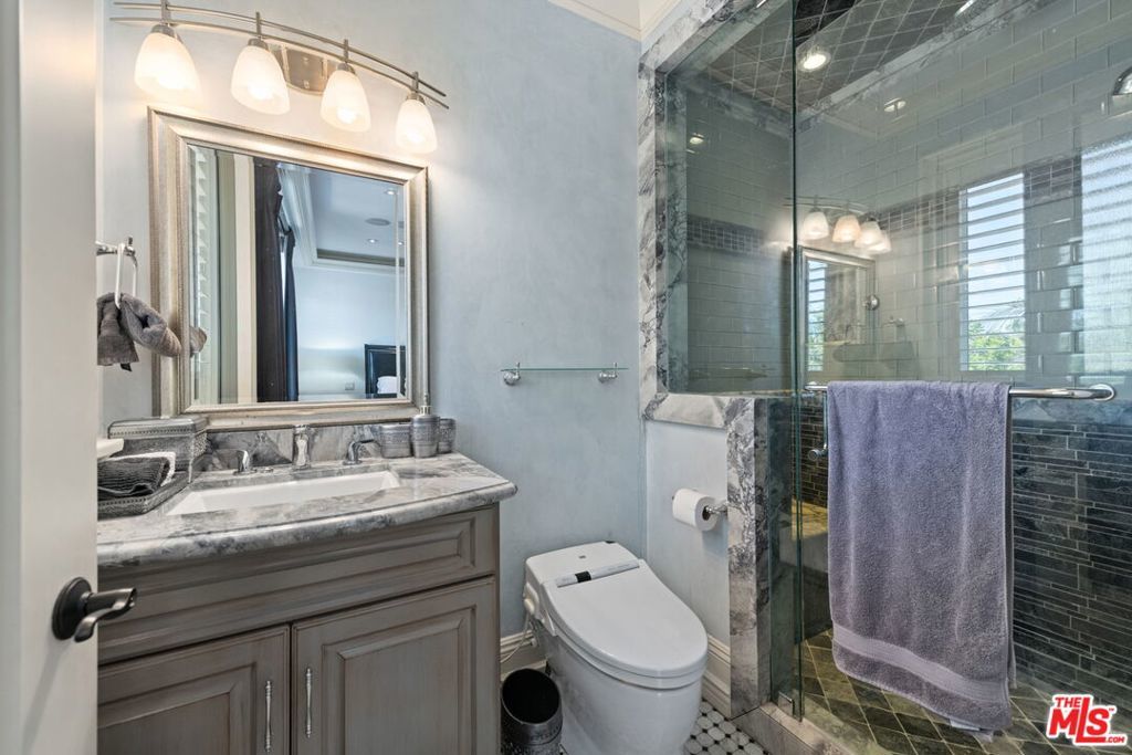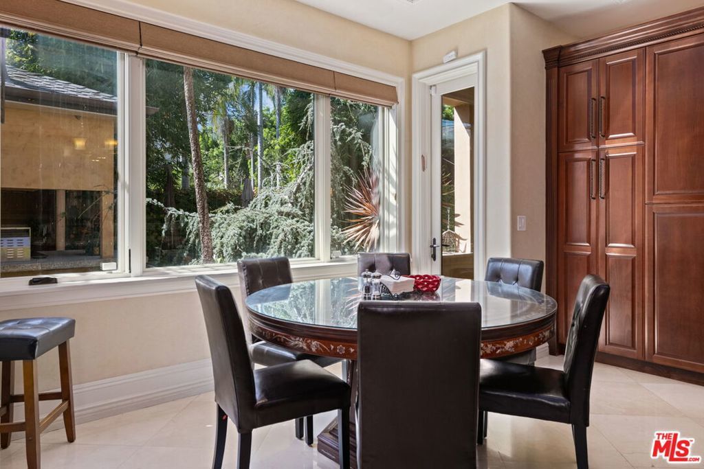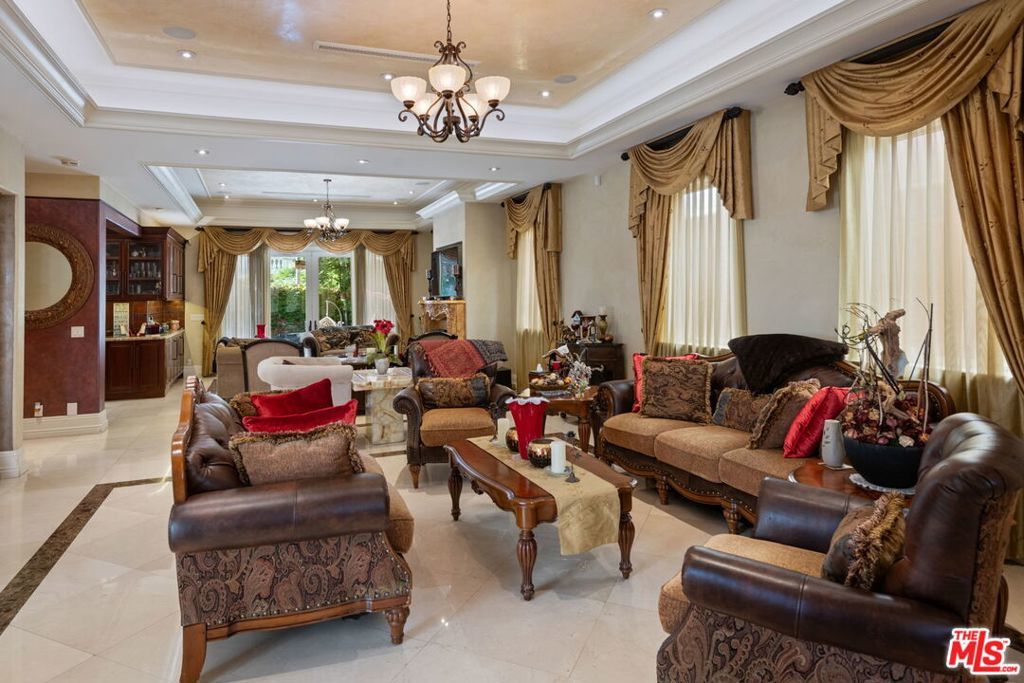 Furnished spacious 6,000+sf 6 bed/7.5 bath Mediterranean custom home with beautiful open floor plan. Prime mid-block location with gated front and auto-gated flag-stone finished driveway and walkway. Enter large living room opening to both dining room and back facing family room with fireplace and French doors to covered patio, tiled yard area and entertainer's outdoor covered kitchen with BBQ and bar area. Double sized chef's kitchen with center island, 2 sinks, all top-of-the-line stainless steel appliances including Wolf range/double oven, wine fridge, built-in oversized refrigerator/freezer, butler's pantry with warming drawer and microwave. Breakfast area overlooking backyard with patio access. stairway to 2nd story is filled with an abundance of natural light. 4 spacious bedrooms upstairs all with ensuite updated marble and tile-finished bathrooms, front facing bedrooms with balconies and Century City views. Primary suite with fireplace, french doors to balcony with treetop and sunset views and large custom closet complete with island of dresser built-ins. Primary bathroom with separate spa tub and steam shower, dual basins. Lower level of home with large open game room/den including projector tv and 2 additional bedrooms with ensuite bathrooms and powder room. Additional features include marble and hardwood flooring, Venetian plaster walls, wired sound, 4 zoned ac/heat, solar panels, alarm system, laundry room with storage on 2nd story level. Beautifully maintained. Prime location close to Westfield Century City Mall, UCLA and Westwood Village and Beverly Hills. Westwood Charter School. Available beginning