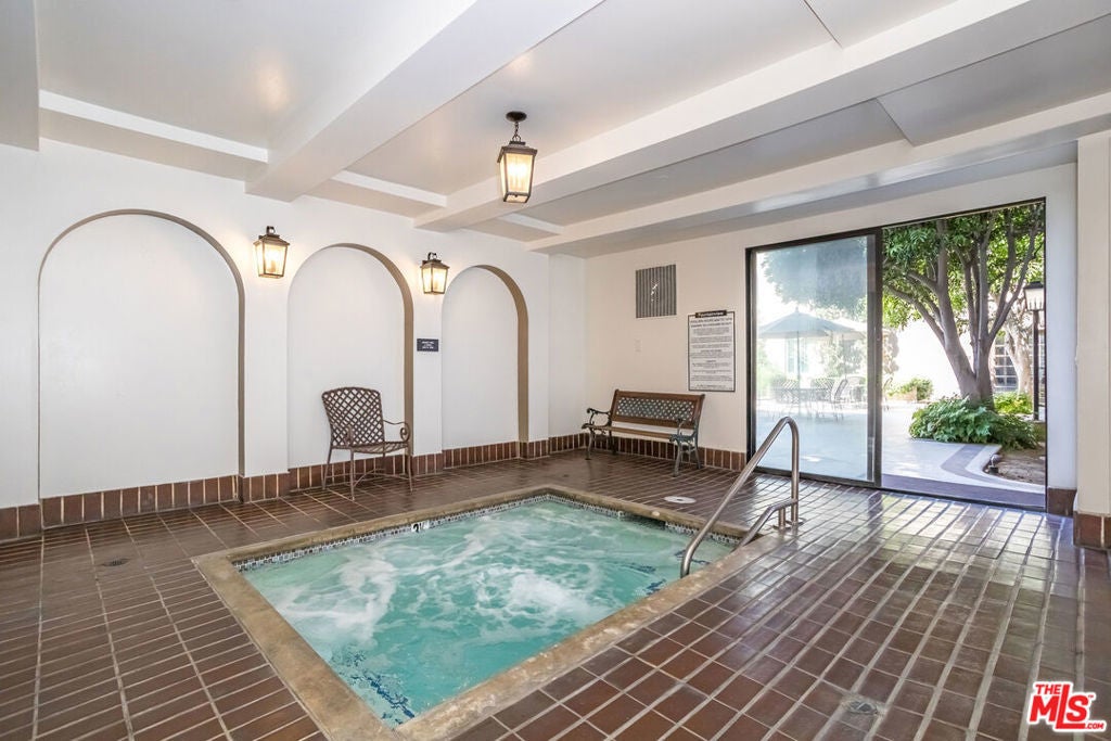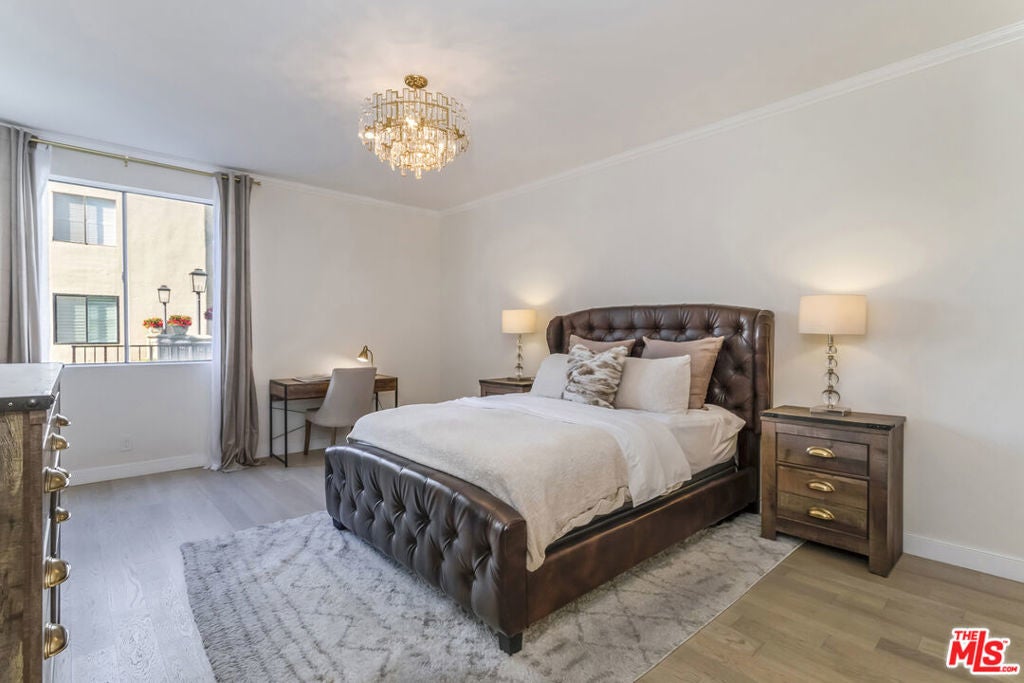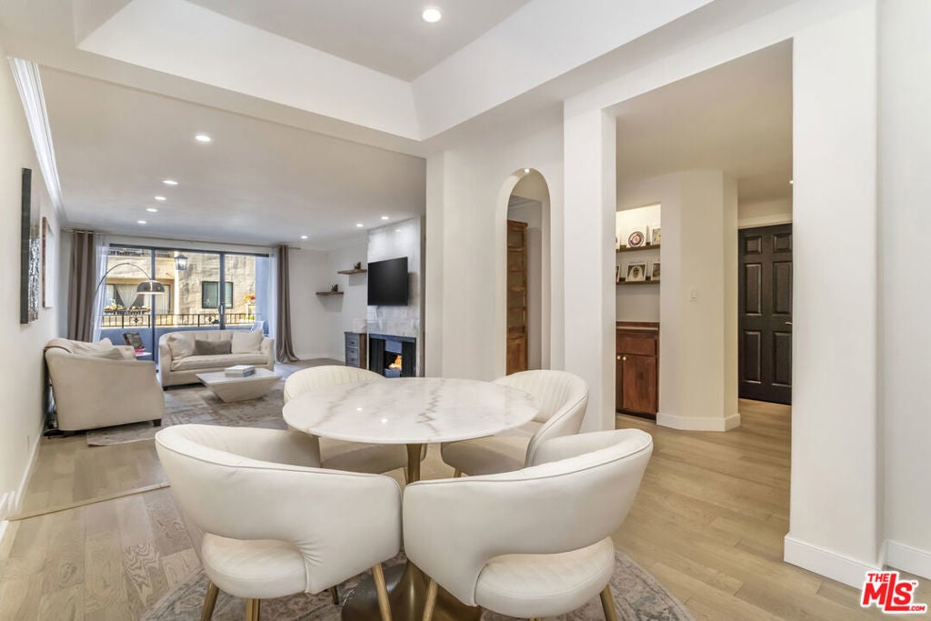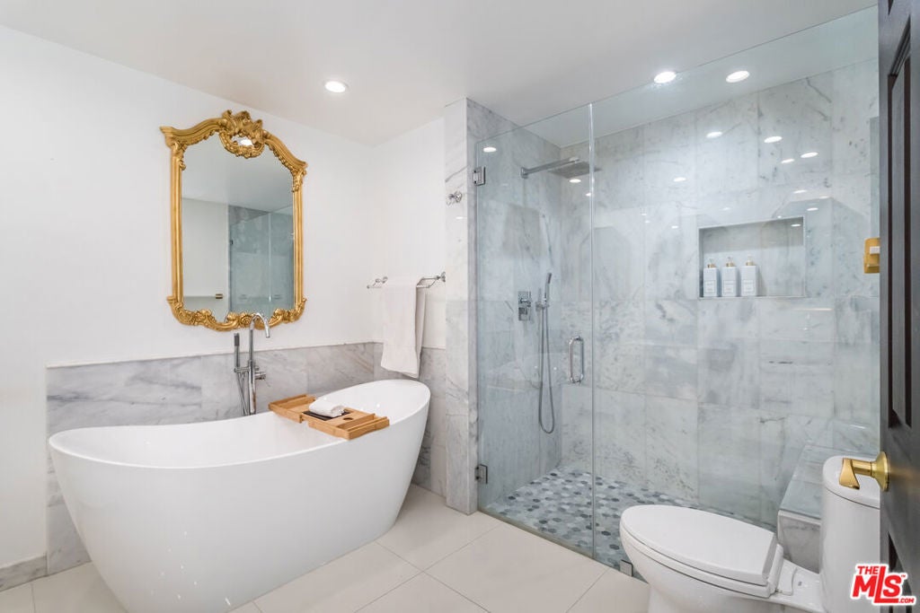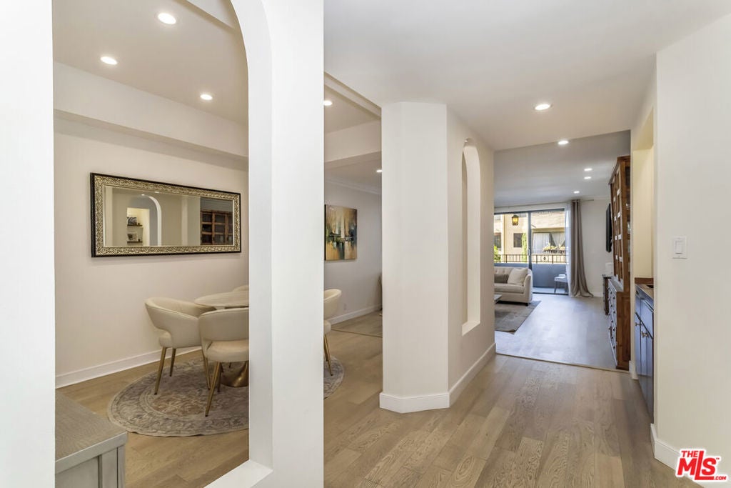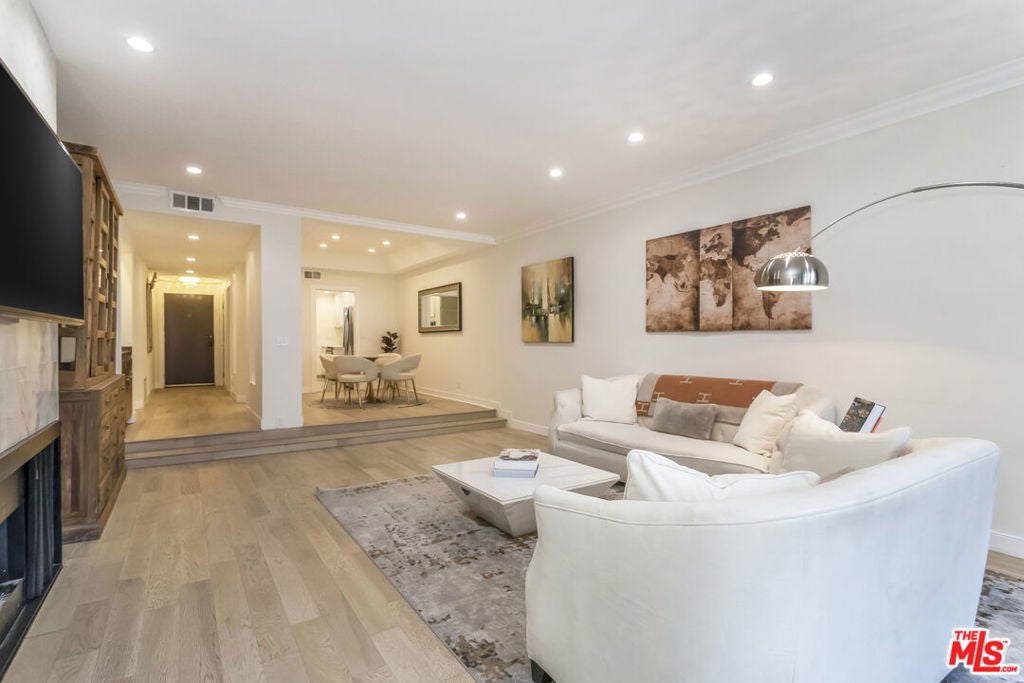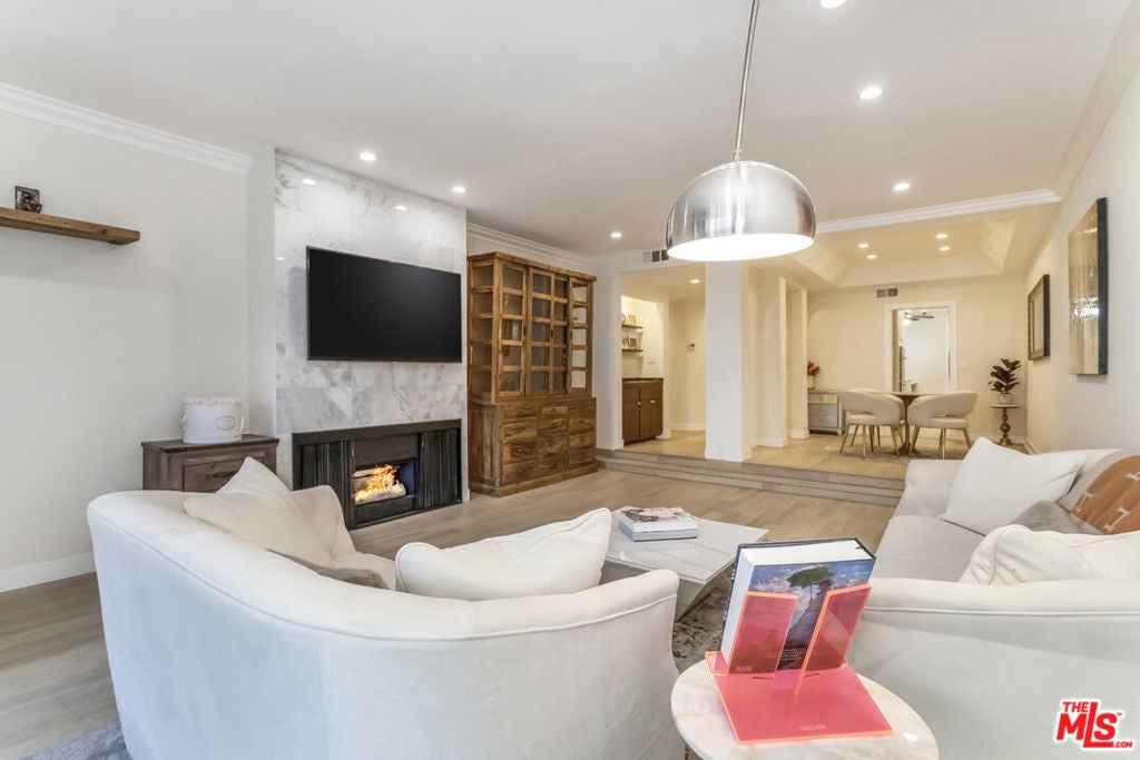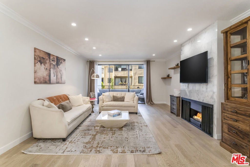 Remodeled and privately set just one block south of the Sunset Strip, this gated 2-bedroom, 2-bath residence offers approximately 1,570 sq. ft. of bright, open living space with a rare sense of calm in the heart of West Hollywood. Tucked behind mature trees within a serene courtyard setting, Residence 414 combines generous scale, thoughtful design, and resort-style amenities. A step-down living room with recessed lighting opens to a private balcony overlooking the tranquil interior grounds, while a gated front patio provides an uncommon sense of arrival and additional outdoor privacy. The kitchen features custom cabinetry and new stainless-steel appliances, complemented by a nearby wet bar with built-in storage ideal for entertaining. The spacious primary suite is a true retreat, complete with a walk-in closet and a spa-inspired bathroom featuring marble countertops, soaking tub, step-in shower, dual sinks, make-up station, custom lighting, and a dedicated vanity. The second bedroom is privately situated down the hall near a full bathroom, making it well-suited for guests or a home office. Additional highlights include hardwood flooring, designer fixtures, refined lighting, a full-size washer and dryer, and a secure location near the elevator and building amenities. The home includes two side-by-side parking spaces in the secure garage and a separate storage unit. Residents enjoy an exceptional suite of amenities, including a swimming pool, indoor and outdoor spas, gym, saunas, library, and clubhouse, offering a true resort-like lifestyle moments from world-class dining, shopping, and nightlife.