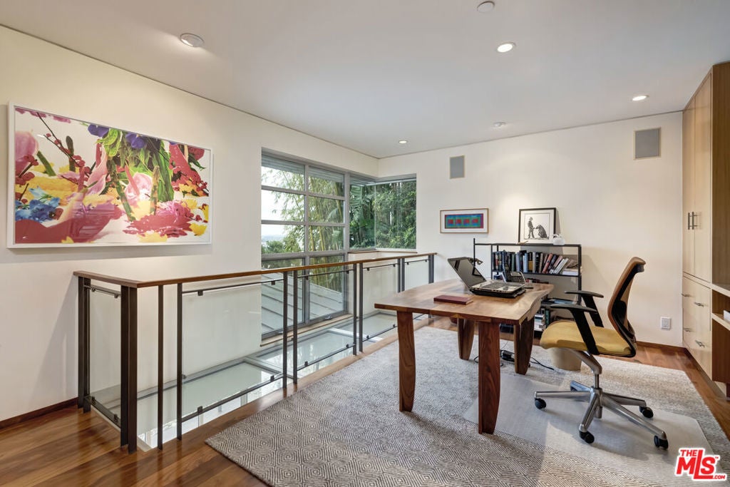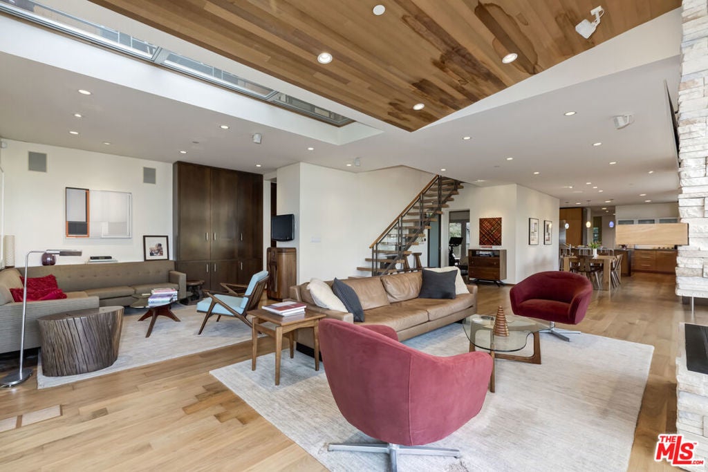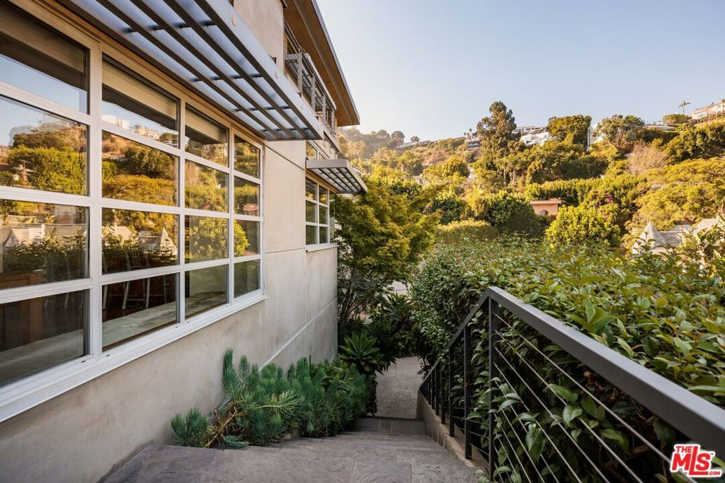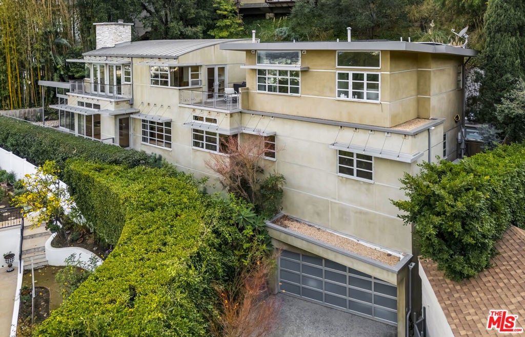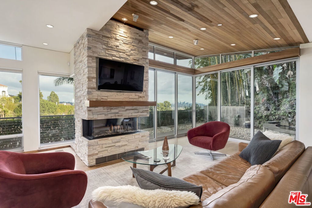 Private and serene with sweeping city views, this gated, custom modernist home in lower Hollywood Hills feels worlds away while remaining exceptionally central to the city. Designed by owner and architect Carter Bravmann, the expansive residence is poised on a terraced site of nearly 10,205 square feet that frames panoramic hill, evening-light and Downtown LA views. Nearly every room in the four-bedroom, four-bath arrangement welcomes city, hill or garden vistas, with a blend of floor-to-ceiling and clerestory windows allowing natural light to bathe living areas in a warm and inviting glow. The free-flowing two-level floor plan of approximately 3,816 square feet offers public spaces for entertaining and relaxation on a virtually seamless first floor, where the living room and den showcase a vaulted wood ceiling and stone fireplace. A built-in window seat enhances the dining room, which continues to a chef-inspired kitchen with custom wood cabinetry, an island with prep sink, granite countertops, high-end stainless-steel appliances, and French doors leading to the backyard. An ensuite bedroom on this level also opens to the backyard, and the versatile family room can be enjoyed as a fourth bedroom with private bath. Upstairs, guests will appreciate a private suite with impressive views and access to an adjacent deck. The primary suite's two balconies captivate the eye with the iconic views you'd expect in the Hollywood Hills. The main bedroom has a sitting area with fireplace. A barrel ceiling finished with natural wood crowns the space, which also reveals a magnificent walk-in closet with custom built-ins, and a large bath with floating vanity, two sinks, and a walk-in wet room with rain shower and tub. High ceilings continue throughout the second floor, which hosts a convenient home office. Every detail was personally selected by Bravmann, including wood flooring, a floating open-riser staircase, mitered windows for flawless views, recessed art lighting, and natural stone finishes and amenities. Virtually hidden from the street behind a gated driveway with two-car garage, outdoor spaces are embellished by lush landscaping that weaves towering bamboo and manicured vines into a front patio and a gorgeous backyard with pool. Taking its place near such esteemed landmarks as The Stahl/Case Study House 22 and Frank Lloyd Wright's Storer House, this modern architectural home is easily walkable to all things fun along the Sunset Strip, including shops, restaurants and clubs.