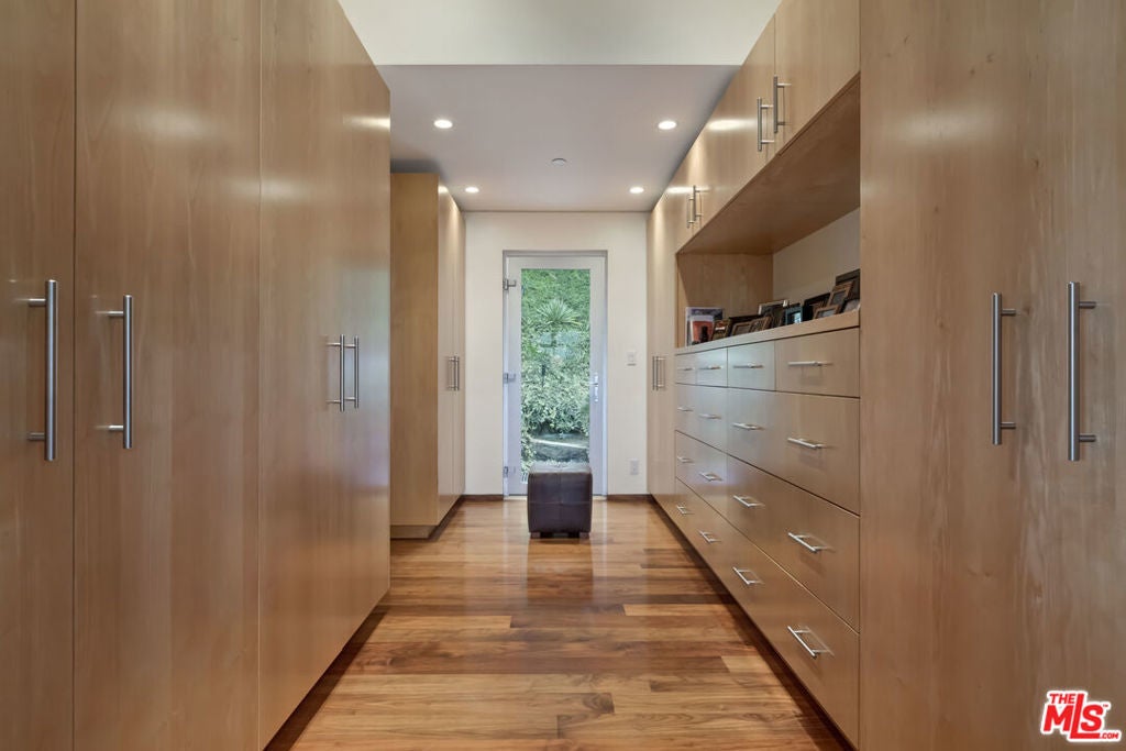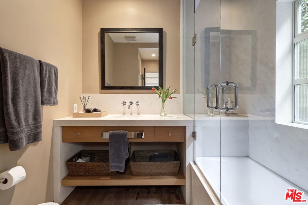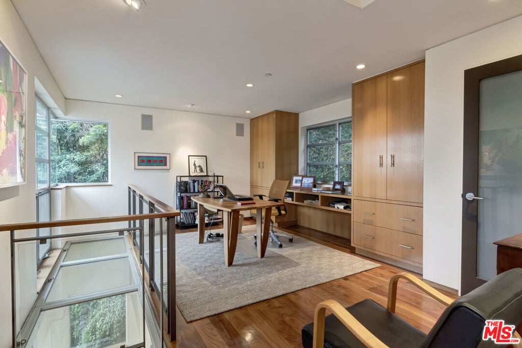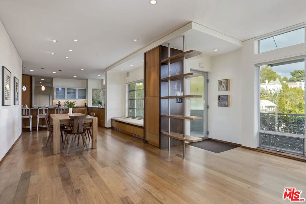 Private and serene with sweeping city views, this gated, custom modernist home in lower Hollywood Hills feels worlds away while remaining exceptionally central to the city. Designed by owner and architect Carter Bravmann, the expansive residence is poised on a terraced site of nearly 10,205 square feet that frames panoramic hill, evening-light and Downtown LA views. Nearly every room in the four-bedroom, four-bath arrangement welcomes city, hill or garden vistas, with a blend of floor-to-ceiling and clerestory windows allowing natural light to bathe living areas in a warm and inviting glow. The free-flowing two-level floor plan of approximately 3,816 square feet offers public spaces for entertaining and relaxation on a virtually seamless first floor, where the living room and den showcase a vaulted wood ceiling and stone fireplace. A built-in window seat enhances the dining room, which continues to a chef-inspired kitchen with custom wood cabinetry, an island with prep sink, granite countertops, high-end stainless-steel appliances, and French doors leading to the backyard. An ensuite bedroom on this level also opens to the backyard, and the versatile family room can be enjoyed as a fourth bedroom with private bath. Upstairs, guests will appreciate a private suite with impressive views and access to an adjacent deck. The primary suite's two balconies captivate the eye with the iconic views you'd expect in the Hollywood Hills. The main bedroom has a sitting area with fireplace. A barrel ceiling finished with natural wood crowns the space, which also reveals a magnificent walk-in closet with custom built-ins, and a large bath with floating vanity, two sinks, and a walk-in wet room with rain shower and tub. High ceilings continue throughout the second floor, which hosts a convenient home office. Every detail was personally selected by Bravmann, including wood flooring, a floating open-riser staircase, mitered windows for flawless views, recessed art lighting, and natural stone finishes and amenities. Virtually hidden from the street behind a gated driveway with two-car garage, outdoor spaces are embellished by lush landscaping that weaves towering bamboo and manicured vines into a front patio and a gorgeous backyard with pool. Taking its place near such esteemed landmarks as The Stahl/Case Study House 22 and Frank Lloyd Wright's Storer House, this modern architectural home is easily walkable to all things fun along the Sunset Strip, including shops, restaurants and clubs.