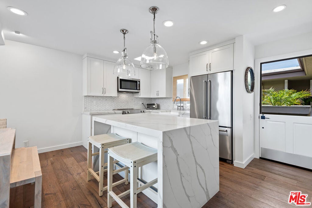 Welcome to this exquisitely remodeled top-floor residence, just steps from the beach, offering stunning, unobstructed lagoon views from every room. Spanning approximately 1,117 square feet, this elegant home features 2 bedrooms and 2 bathrooms, beautiful wide plank oak hardwood flooring throughout, and a bright and airy, open-concept layout that's perfect for entertaining. Enter through a Dutch door into the fully remodeled kitchen, showcasing CaesarStone countertops, Restoration Hardware lighting, custom built-in cabinetry, a large center island with seating, and a farmhouse sink. The kitchen seamlessly flows into a dining area that overlooks the living room. The light-filled living room is highlighted by a large picturesque window framing the lagoon and a striking natural stone fireplace. Step outside to a spacious and private top-floor patio boasting breathtaking panoramas of the lagoon and the Marina del Rey Channel. Relax in the serene primary suite, complete with tranquil water views and a luxurious en-suite bath featuring Latitude White marble counters and elegant chevron flooring. Additional features include a spacious guest bedroom, a beautifully renovated guest bath, in-unit laundry, custom closets, recessed lighting, a dedicated parking space, and access to a large community bike storage room. Situated in a prime Playa del Rey location just steps to parks, shops, and restaurants, this exquisite home offers the very best of beachside living.