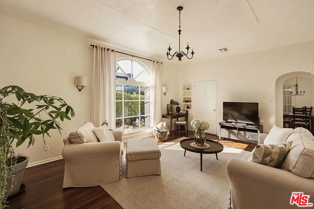 FULLY-FURNISHED. ALL CITY UTILITIES INCLUDED. PRIVATE YARD. Just beyond the hum of West Hollywood, where the rhythm of Santa Monica Boulevard meets the style of Melrose Avenue, Las Casitas de la Bougainvillea awaits in quaint Melrose Village. This intimate 1920s Spanish Revival compound channels cinematic charm through a contemporary lens. Beyond its gated entrance, three private residences curve around a lush central courtyard garden, forming a hidden sanctuary where time slows and beauty lingers in every corner.The front-facing casita, a 1BD, 1BA residence spanning 800 square feet, enjoys a private grassy yard framed by tall hedges, complete with a gravel patio ideal for alfresco dinners or Sunday mornings under the sun. Inside, timeless character meets elevated comfort. Sunlight dances across stained-glass windows, 10-foot coved ceilings rise overhead, and textured plaster walls add depth and warmth. A decorative fireplace anchors the living room, while hardwood and terra-cotta floors ground the space in authenticity .The fully stocked kitchen blends form and function with modern appliances, cookware, and dining essentials. Everyday convenience continues with a private laundry room, generous storage, and thoughtful turnkey touches throughout. Step into the common courtyard, where roses burst with color and lavender, bougainvillea, and citrus trees perfume the offering a serene escape that feels worlds away from the city, yet just moments from its pulse. Immediate Availability. Street parking only.