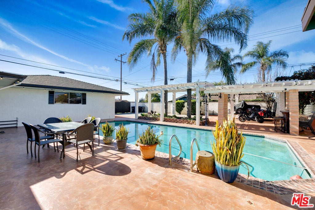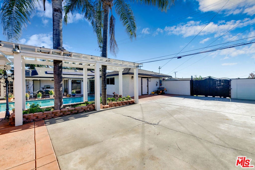 Welcome to this beautifully maintained home tucked behind a private gate with a long driveway offering ample parking and privacy. The property features an open-concept layout with 3 bedrooms and 2 full bathrooms, plus an additional bedroom and full bathroom. The garage has been converted into a versatile living space, ideal for guests, extended family, or a home office. The upgraded kitchen boasts granite tile countertops, newer cabinetry, and opens seamlessly to the main living areas perfect for everyday living and entertaining. Flooring throughout the home includes a combination of tile, laminated wood, and SPC flooring, providing both style and durability. Step outside to a spacious backyard with a pool and an abundance of fruit trees, creating a private outdoor retreat with endless possibilities for entertaining, hosting gatherings, or simply enjoying Southern California living. The expansive yard and rear parking space make this home ideal for those who value outdoor space and functionality. Additional feature includes solar (leased). Located in the heart of Chino, conveniently situated near the 60 Freeway, Ramona Junior High School, shopping centers, and a variety of dining options. This home offers space, comfort, and convenience perfect for both relaxing and entertaining.