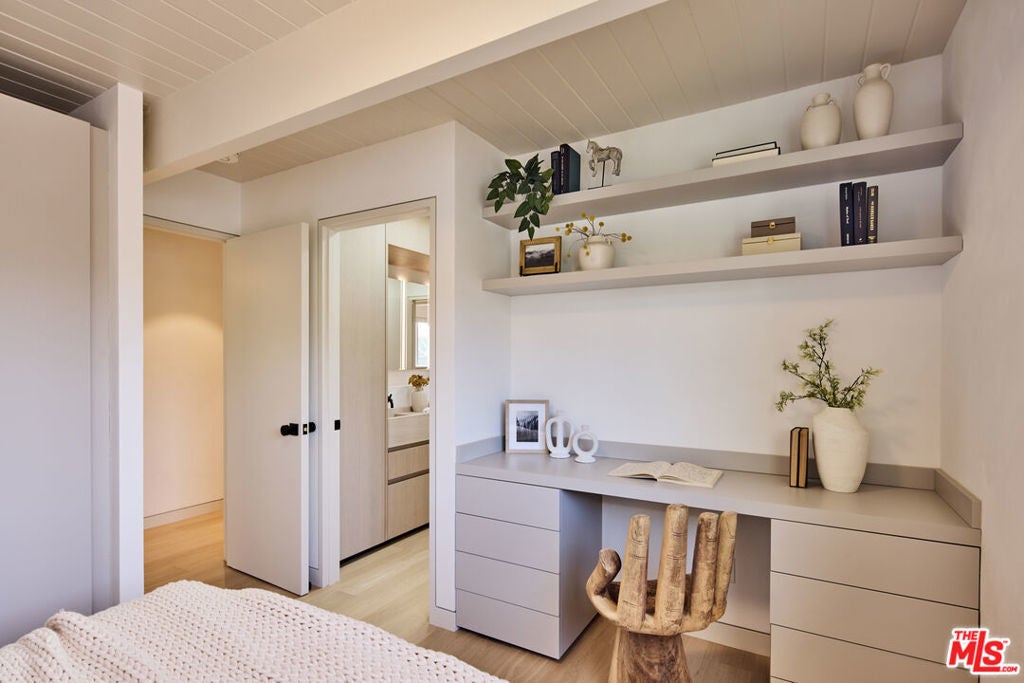 Tucked behind the guarded gates of the exclusive Malibu Colony, this reimagined mid-century modern masterpiece originally crafted by iconic architects Buff & Hensman embodies the essence of casual California living. Their signature blend of wood and glass architecture, which defined 1960s coastal style, lives on in this striking home, now thoughtfully elevated by award-winning architectural designer Warren Garrett. His vision honors the home's original design while introducing modern sophistication.Set beneath a canopy of mature sycamores, the residence is approached via a sandblasted limestone path that echoes the organic textures of the nearby shoreline. Inside, a dramatic open-concept layout unfolds across five bedrooms and five bathrooms, with soaring ceilings and a floating staircase wrapped in wide-plank white oak and framed by a floor-to-ceiling glass wall that invites in abundant natural light.The chef's kitchen is a sleek, functional centerpiece outfitted with Gaggenau appliances, minimalist cabinetry, and a spacious island perfect for culinary exploration or casual gatherings. Throughout, the home is outfitted with Universal Control4 automation and an integrated sound system, inside and out.The serene primary suite offers a private retreat, featuring a spa-inspired bathroom with honed limestone, white oak detailing, a hand-carved rigato stone bathing niche, private water closet, and dual custom closets. A secluded balcony reveals sweeping mountain and ocean views, creating a tranquil haven. Outdoor living is redefined in this secluded sanctuary, where a shimmering pool anchors the courtyard. The outdoor kitchen fully equipped with top-of-the-line appliances and generous seating sets the stage for unforgettable al fresco dining under the stars. Privately gated from the street with nearly 50 feet of frontage, this estate offers an unmatched sense of seclusion within the Colony. While just steps from your deeded, beautifully appointed beach access reserved for a select group of homeowners you can enjoy complete privacy and round-the-clock security. This rare offering captures the very best of Malibu Colony living: architectural significance, modern luxury, and the ultimate connection to land, sea, and sky.
