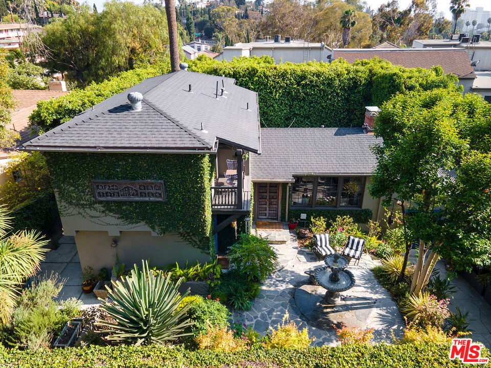 Private home in the heart of the city, nestled in the Hollywood Hills, offering the perfect blend of tranquil sanctuary and Old Hollywood Charm with convenient access. The beautifully landscaped gated courtyard encompasses a lush flower garden with a gorgeous patio and a classic stone fountain. Built in 1927, this artful home showcases incredible Spanish Revival design elements -- an original stained-glass window, Spanish tile throughout, and a classic fireplace. You'll pass through the intricately carved 18th-century wooden entryway, where you'll be engulfed by the spacious living room enhanced by a vaulted ceiling, dramatic beams, Moroccan lanterns, a striking fireplace, original hardwood floors, and a formal dining area. All that next to a tastefully renovated downstairs bathroom and an adjacent sun room with a library that opens up through two sets of French doors onto the private back patio. The kitchen has been updated and offers stainless steel appliances, including a six-burner designer Wolf range, combining modern convenience with classic elegance. Upstairs, you'll find two bedrooms, a cozy balcony, and one bath, providing a harmonious retreat. The rear yard is surrounded by mature hedges providing complete privacy. A native-plant garden, relaxing 8-person hot tub, larger-than-life Buddha fountain, and an additional deck create a meditative, shaded outdoor haven. Additionally, the home comes with two sizable, temperature-controlled, bonus spaces totaling 450 sq ft, reflected in the MLS sq ft, that can be used as bedrooms, studios, offices, or flex spaces. The location of this home offers central proximity to major studios, renowned restaurants, and vibrant nightlife. The picturesque Lake Hollywood Reservoir is a twenty-minute hike through the hills, with iconic entertainment venues such as the Hollywood Bowl and John Anson Ford Theatre within a short distance. This one-of-a-kind sanctuary in an idyllic Hollywood Hills neighborhood has some of the most elevated, inspired aesthetics you'll find in Los Angeles!