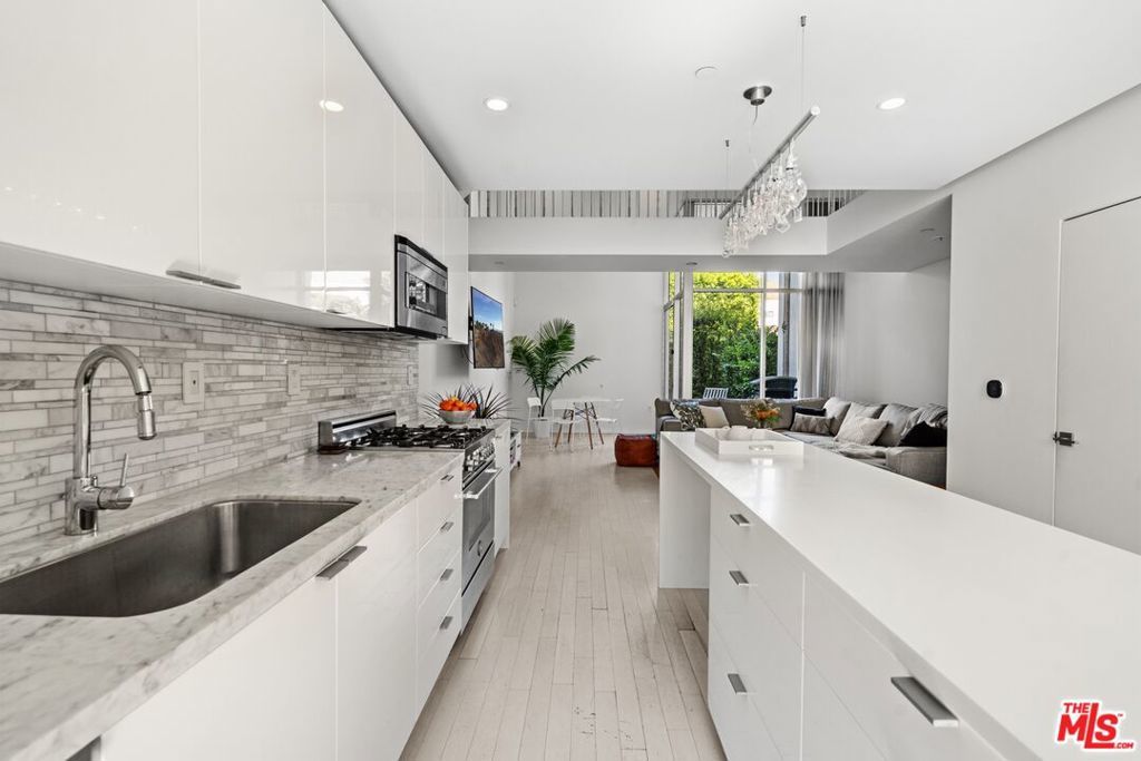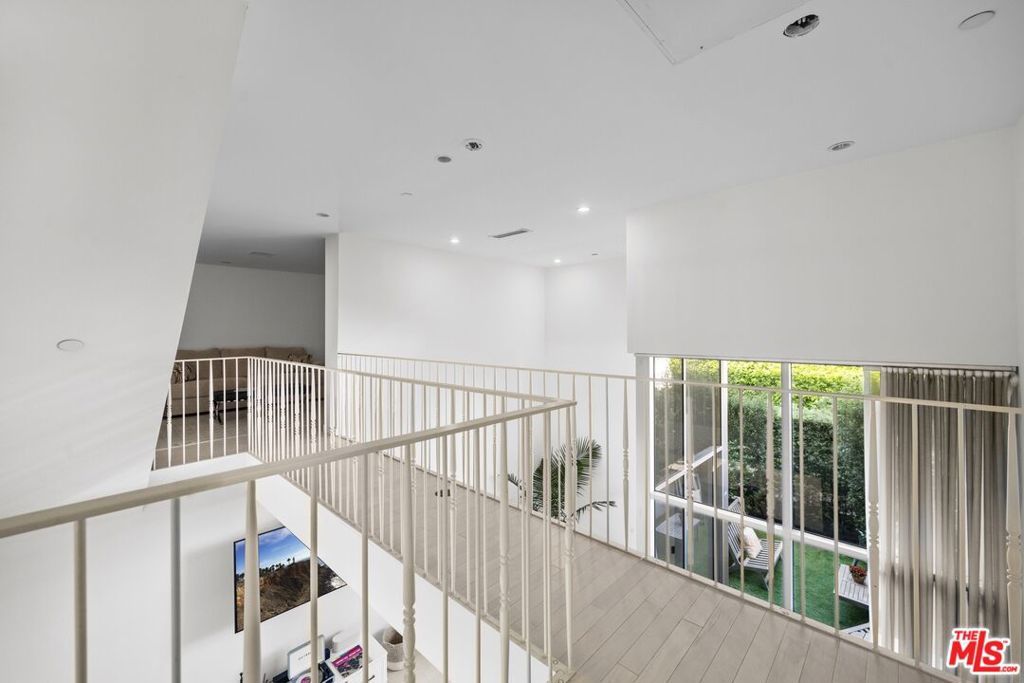 Ideally situated at the between Melrose & Santa Monica, this elegant residence offers a lifestyle rooted in walkability, flexibility, and connection to the city's creative energy. Tucked away from major thoroughfares yet moments from dining, shopping, and cultural hubs, it provides a rare balance of calm and convenience. Designed for Buyers who value location and ease, this home is well suited as a primary residence, city retreat, or long-term hold in one of Los Angeles' most consistently desirable neighborhoods. Nestled into an an enclave of only 8 private residences, the soaring light filled spaces over white stained French oak floors feature sleek modern finishes throughout. The lower level offers an open public space that includes a bright kitchen outfitted with a center island & high end appliances plus dining-living spaces with soaring ceiling height that open onto a private outdoor patio. A second level bridge leads to a loft area ideal as a media room, office or gym. Two en suite bedrooms reside on the top level with city views, custom built in closets & private bathrooms with floating cabinets & walk in tiled showers. Located in West Hollywood between the trendy boutiques, cafes, gourmet coffee shops of both Santa Monica and Melrose Avenues, this architectural home is a sleek retreat from the bustling energy of the surrounding urban amenities & activities.