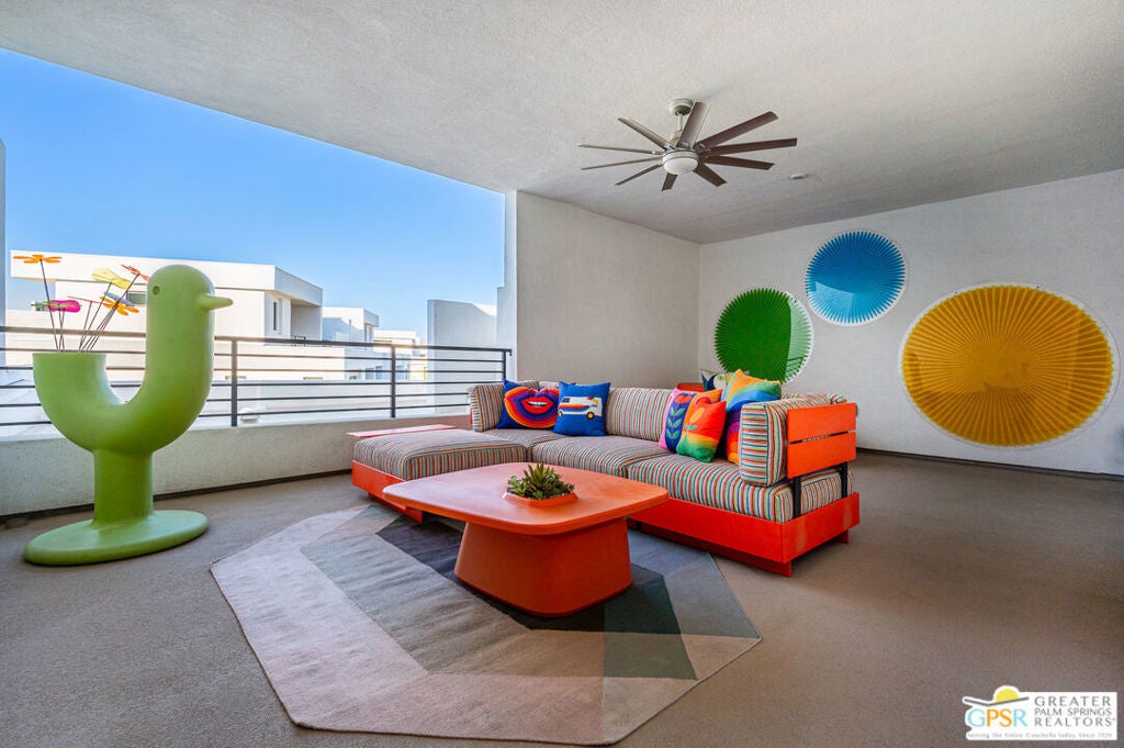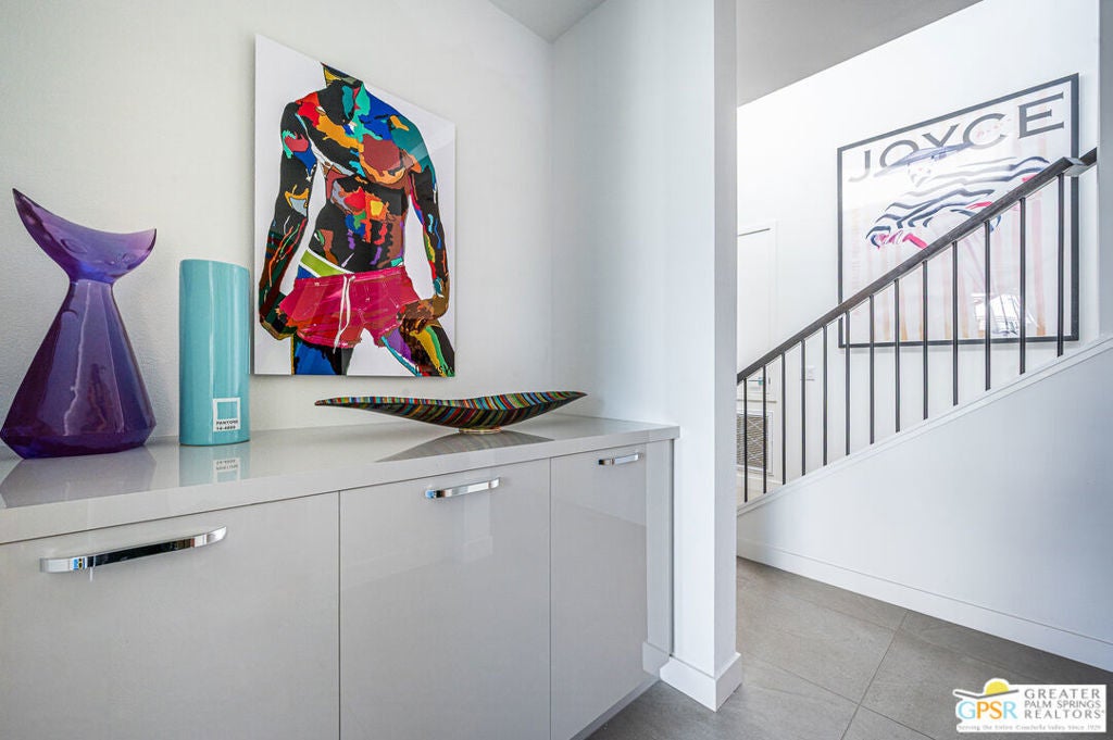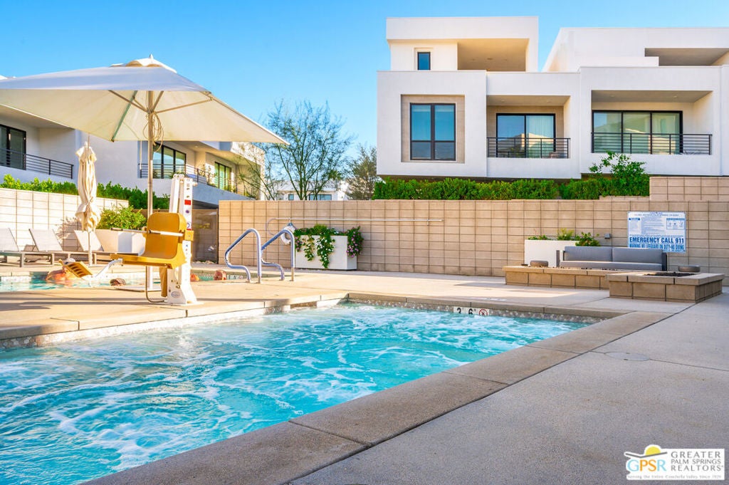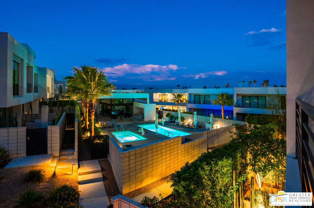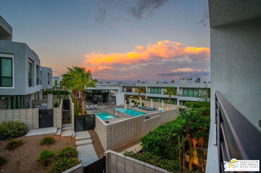 274 Mayfair is located within the Toll Brothers built, gated community of Cody Place. This 2237 square foot "Cameo Elite" plan home has a generous open kitchen with living and dining in one great space. The living room's stacking 3 panel 8' x 12' sliding door opens to a saltwater private "spool" cocktail pool with a lounging shelf and jets and a fire feature, all in a private gated yard. The kitchen has upgraded cabinets featuring a second row of upper cabinets to the ceiling, and pull-out spice racks on either side of the Kitchen Aid gas range. The 12 ft by 4 ft island has a deep stainless sink and a Kitchen Aid stainless dishwasher. The Samsung Bespoke refrigerator has color panels that can be updated to match your decor but currently harmonize with the pendants and chandelier in the open concept living/dining space. On the second level, up a grand carpeted staircase, lies a bright sun-filled loft office/den space with a 12 ft ceiling and adjacent balcony. A guest bedroom is next to the loft with an adjacent full bathroom with a walk-in, tiled shower, and the laundry room with stacked LG washer and drier. Around the stairwell through a vestibule with storage cabinets, is the roomy primary bedroom with another bright and beautiful 8' by 12' 3 panel sliding door that flanks another balcony that looks down to the private pool and yard, but also has views to the clubhouse, outdoor community grill, and turquoise shared pools and large hot tub. Up the next flight of stairs with its clerestory windows creating a sunny atrium, a single lite door leads to the "elite" third floor outdoor entertaining room, covered to shield from the elements but open to the north with mountain and community views. This space invites indoor/outdoor living in the fall, winter and spring months, complete with its own ceiling fan. The space could be used for outdoor TV watching and has a hose bib for potentially cultivating lots of potted plants. The sky's the limit! The townhome also features a two car garage with ample storage and a frosted glass garage door, and a powder room and additional storage tucked behind the kitchen. Cody Place sits conveniently on Palm Canyon Drive and is a short distance to downtown, and the bend district's restaurants and shops. The new CV link biking and walking path lies just north of the community. Honey, stop the search! You've found 274 Mayfair!